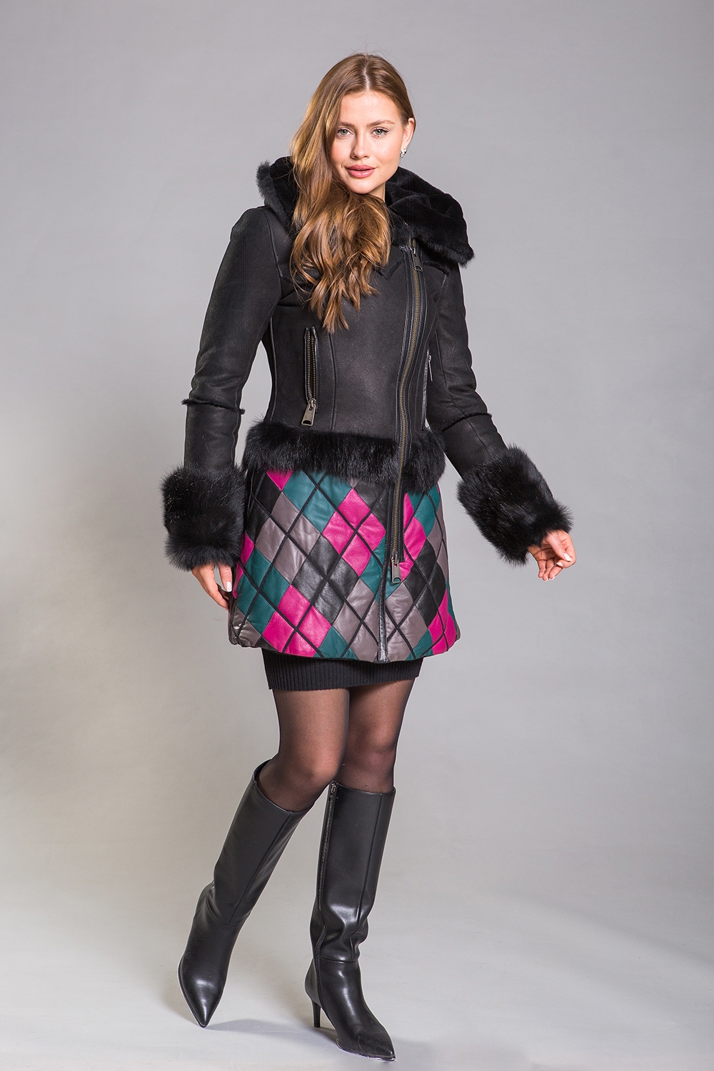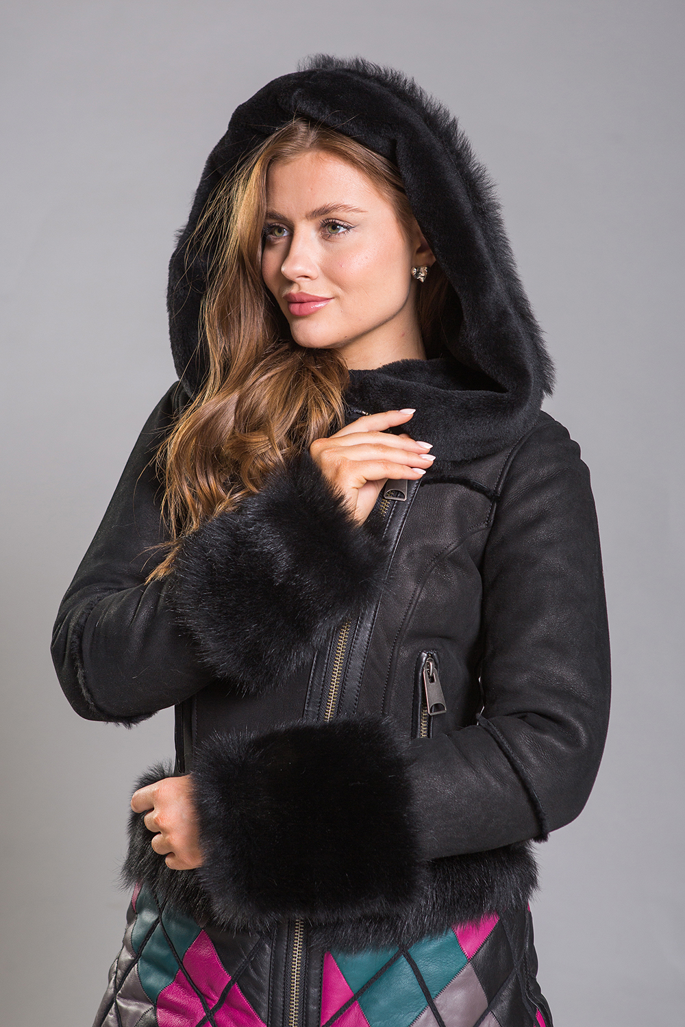 Облегчённая дублёнка из овчины с капюшоном и приталенным силуэтом — прекрасный выбор для весны и осени. Эта модель декорирована разноцветной кожей и украшена мехом тосканы, что придаёт ей особый шарм.
