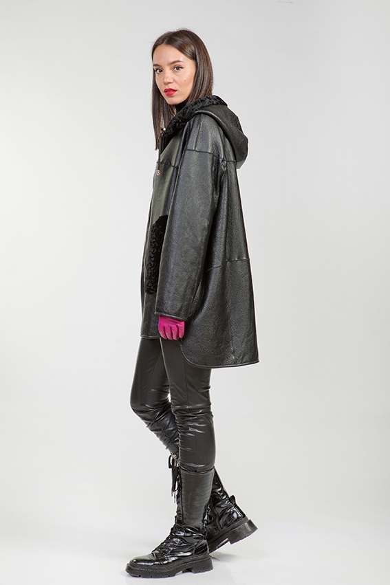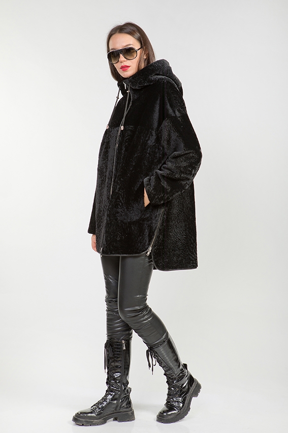Дубленка женская из натуральной овчины с капюшоном. Изделие застегивается на молнию. Модель универсальная, двухсторонняя. С одной стороны у дубленки текстура кожи, с другой стороны мех. По бокам модель декорирована действующими молниями. Карманы есть с одной и другой стороны. Меняйте образы и будьте всегда разной!