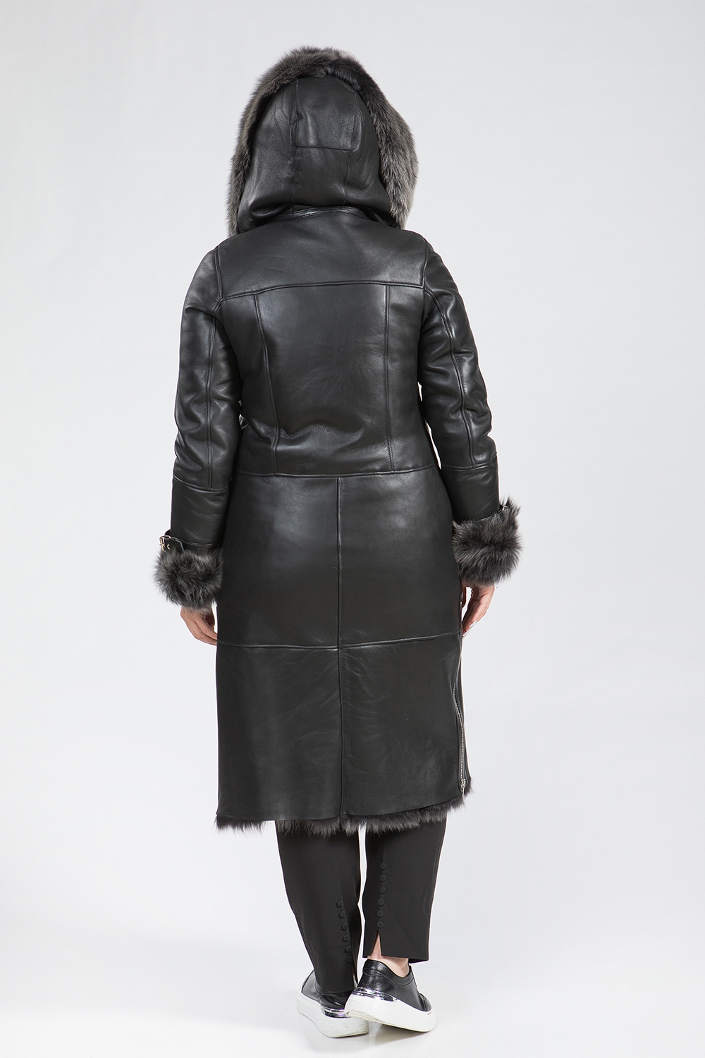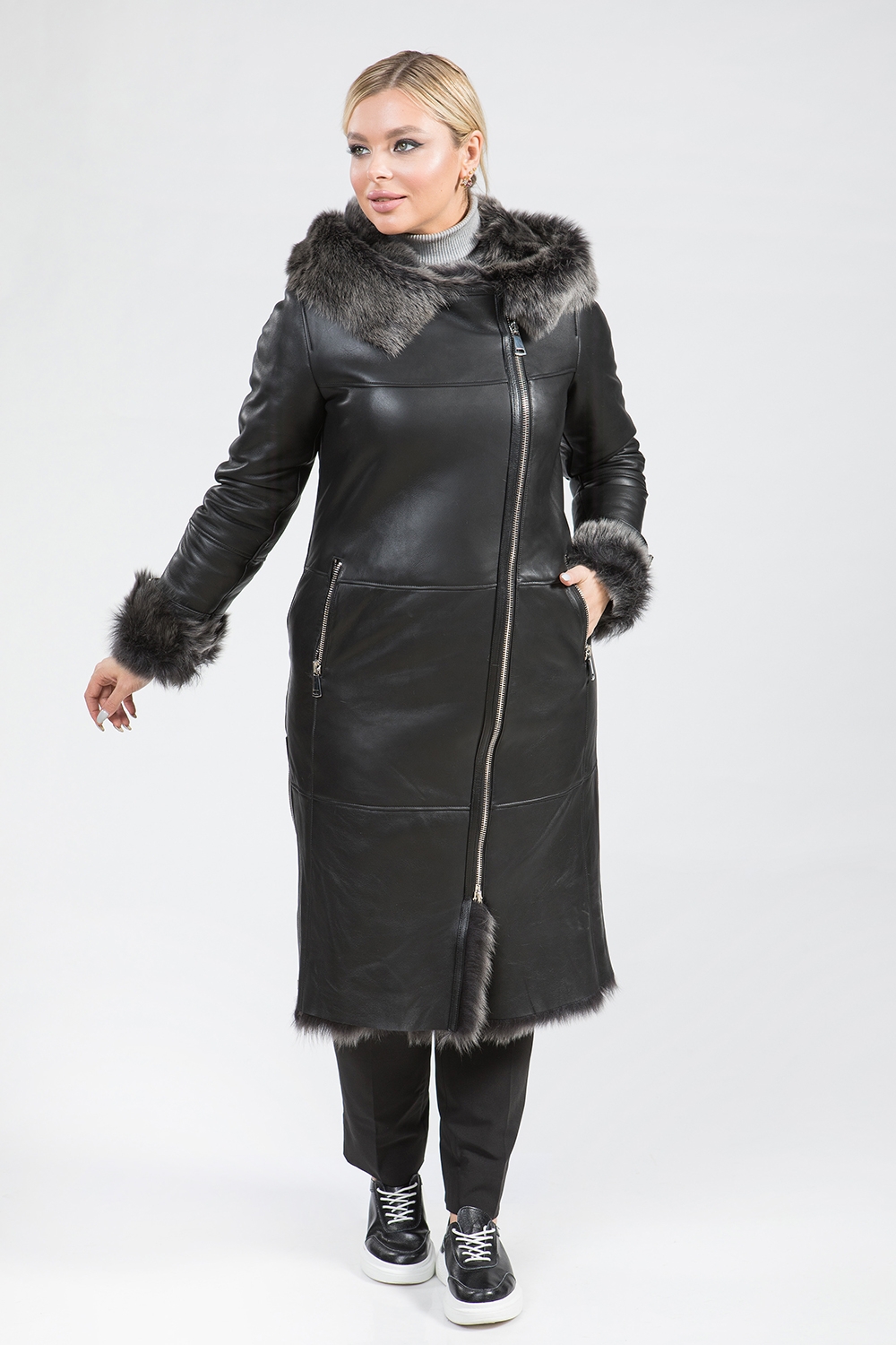 Дубленка женская из натурального меха тосканского ягненка. Модель застегивается на молнию. Рукава изделия могут подворачиваться и дополнены декоративными ремешками. На карманах и по бокам модели молнии. Длина изделия 110 см. У дубленки удобный и универсальный крой. Комфортный капюшон модели обеспечивает защиту от холода!