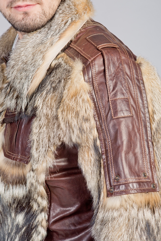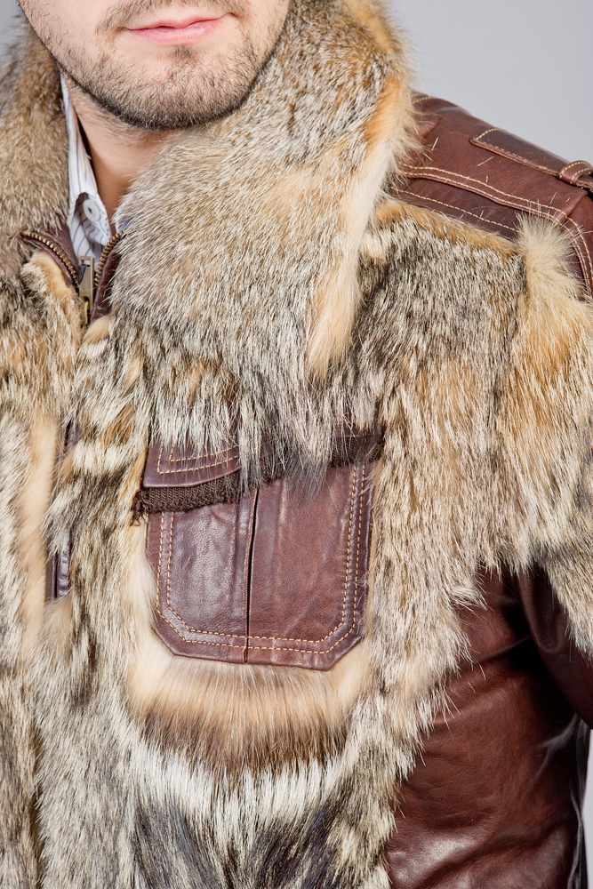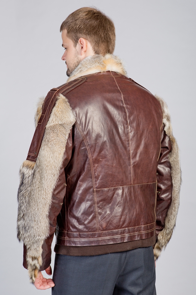 Мужская кожаная куртка. Модель прямая на замке. Изделие декорировано мехом койота. Модель стильная и удобная!