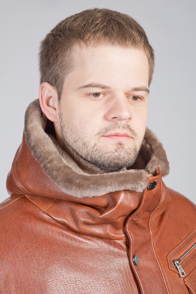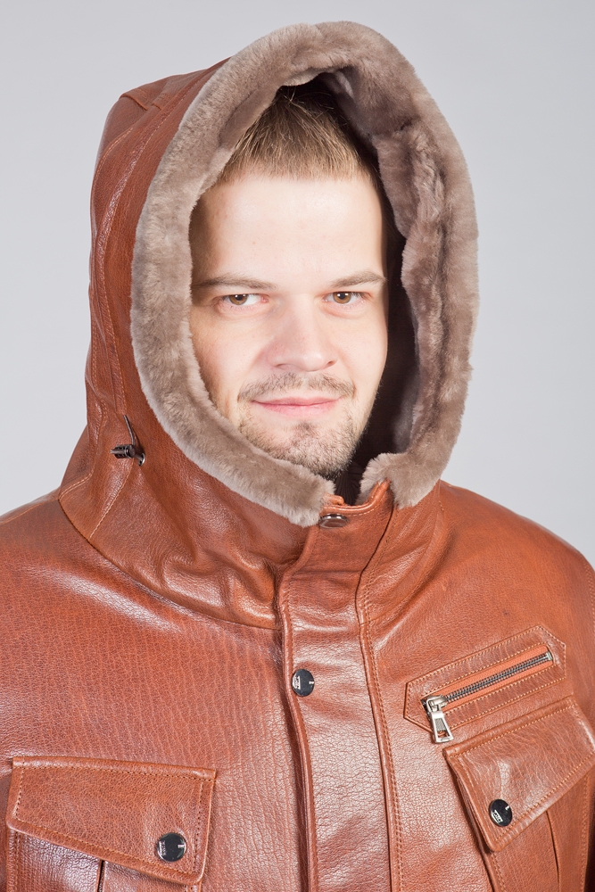 Куртка мужская кожаная. Модель классическая с капюшоном. Внутри отделка из меха овчины. Рукава прямые.