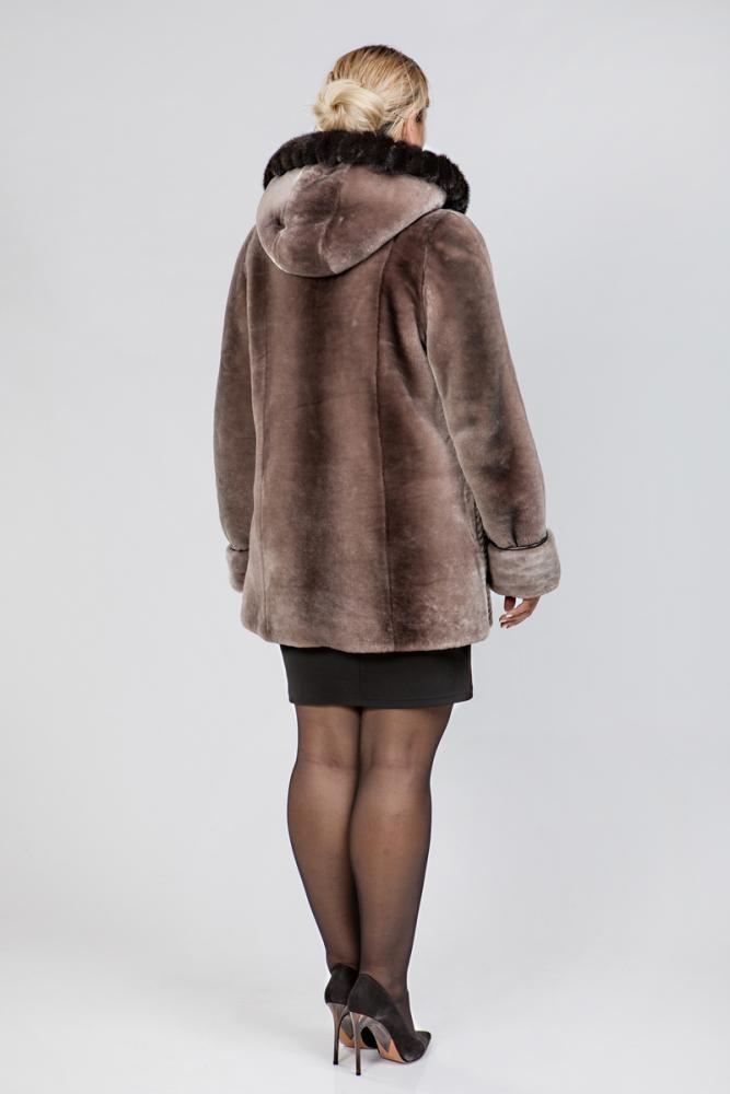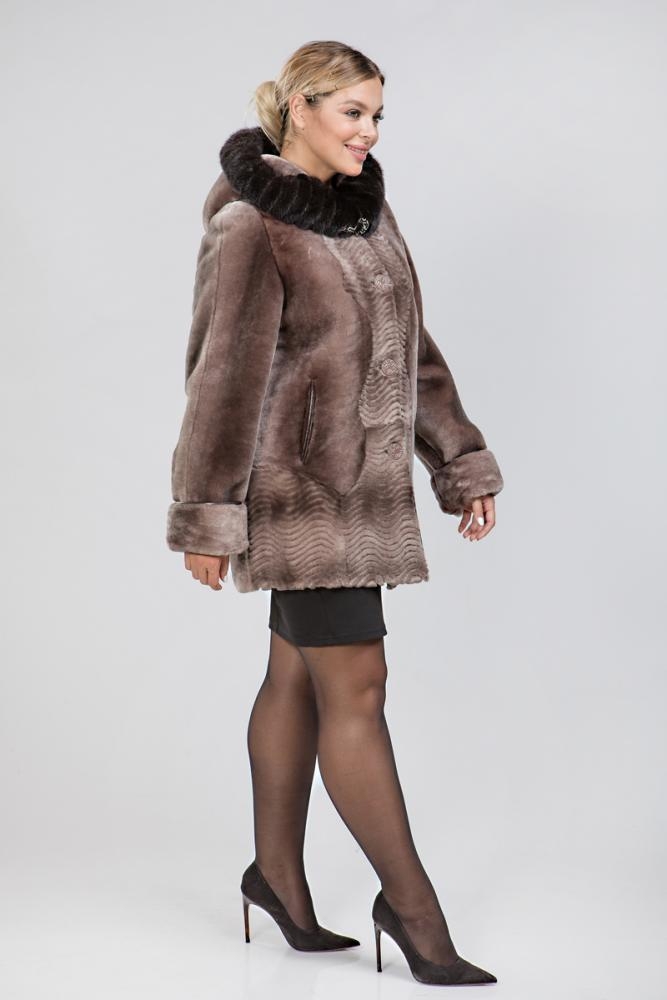 Курточка из меха овчины. Капюшон модели дополнен мехом норки. Застегивается изделие на пуговицы. Длина модели 80 см. Модель декорирована натуральной кожей и фигурной выстрижкой. Рукава изделия имеют манжеты. В такой меховой теплой курточке девушки будут себя чувствовать комфортно!
