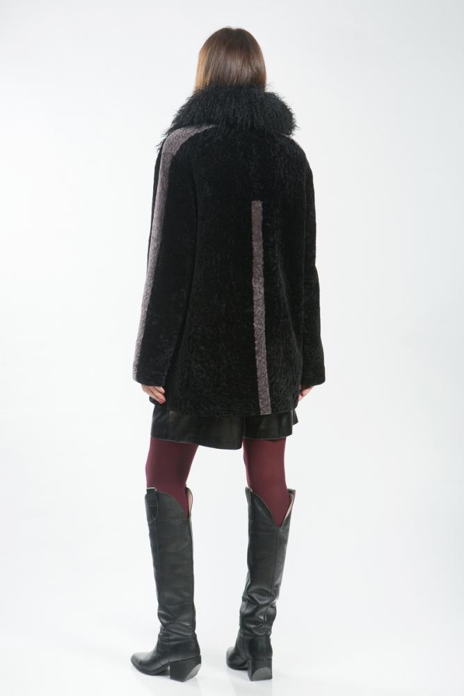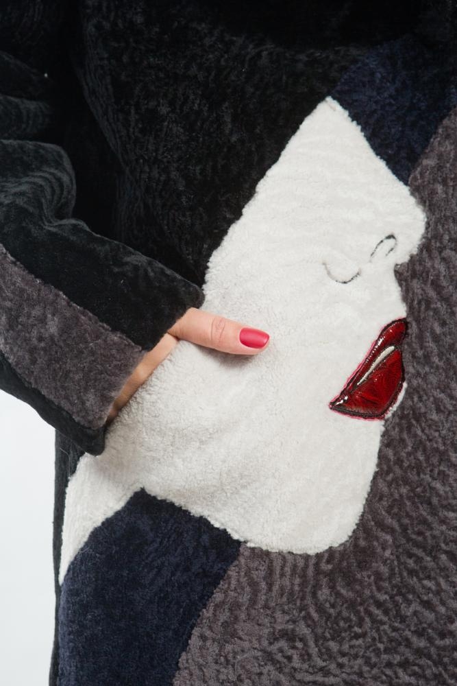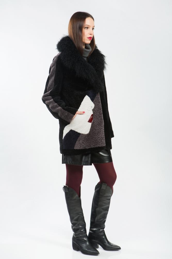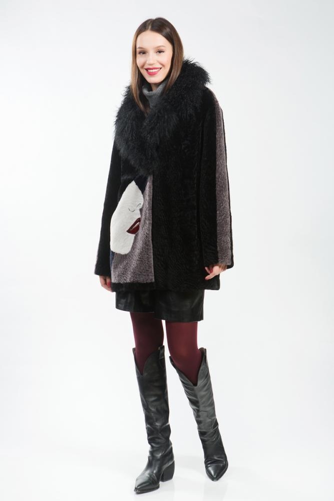Куртка- полупальто из меха овчины (астраган). Воротник изделия дополнен мехом ламы. Модель декорирована меховым принтом и застегивается на клипсы. Курточка выглядит эффектно, благодаря пушистой ламе, которая добавляет нотки шика и гламура!
