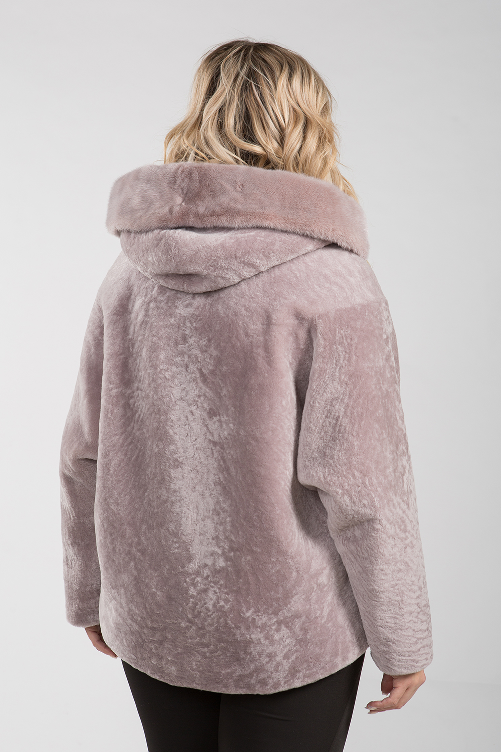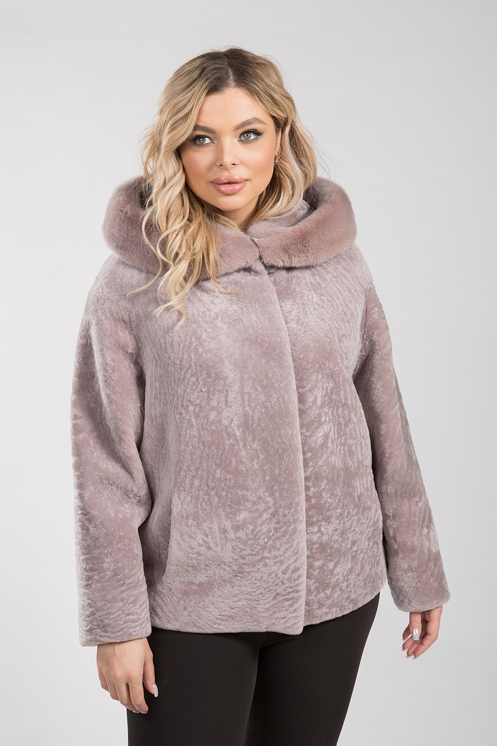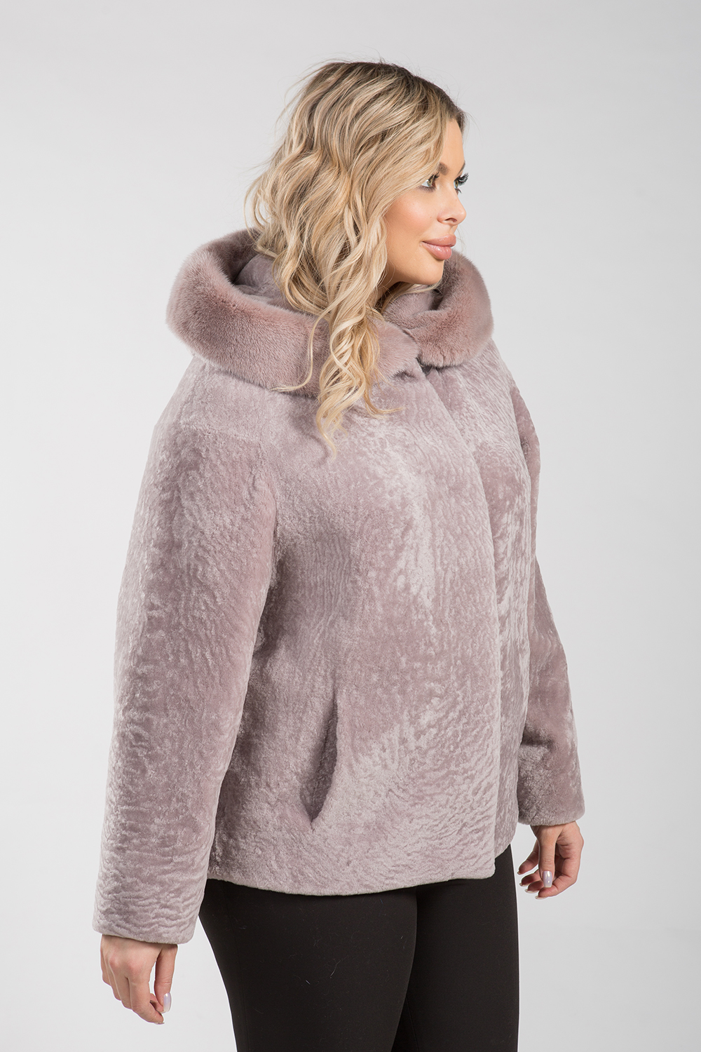 Курточка из меха овчины (астрагана). Капюшон модели декорирован мехом норки. Крой изделия пластины. Фасон рукава свободный. Длина модели 75 см. Изделие застегивается на клипсы. Курточка легкая и теплая. Светлое изделие из натурального астрагана освежает и омолаживает образ!