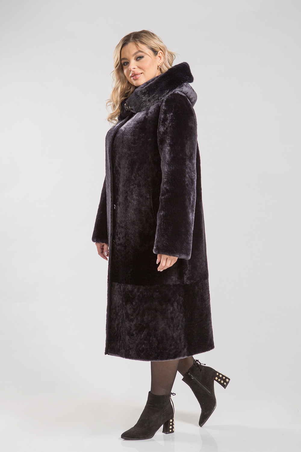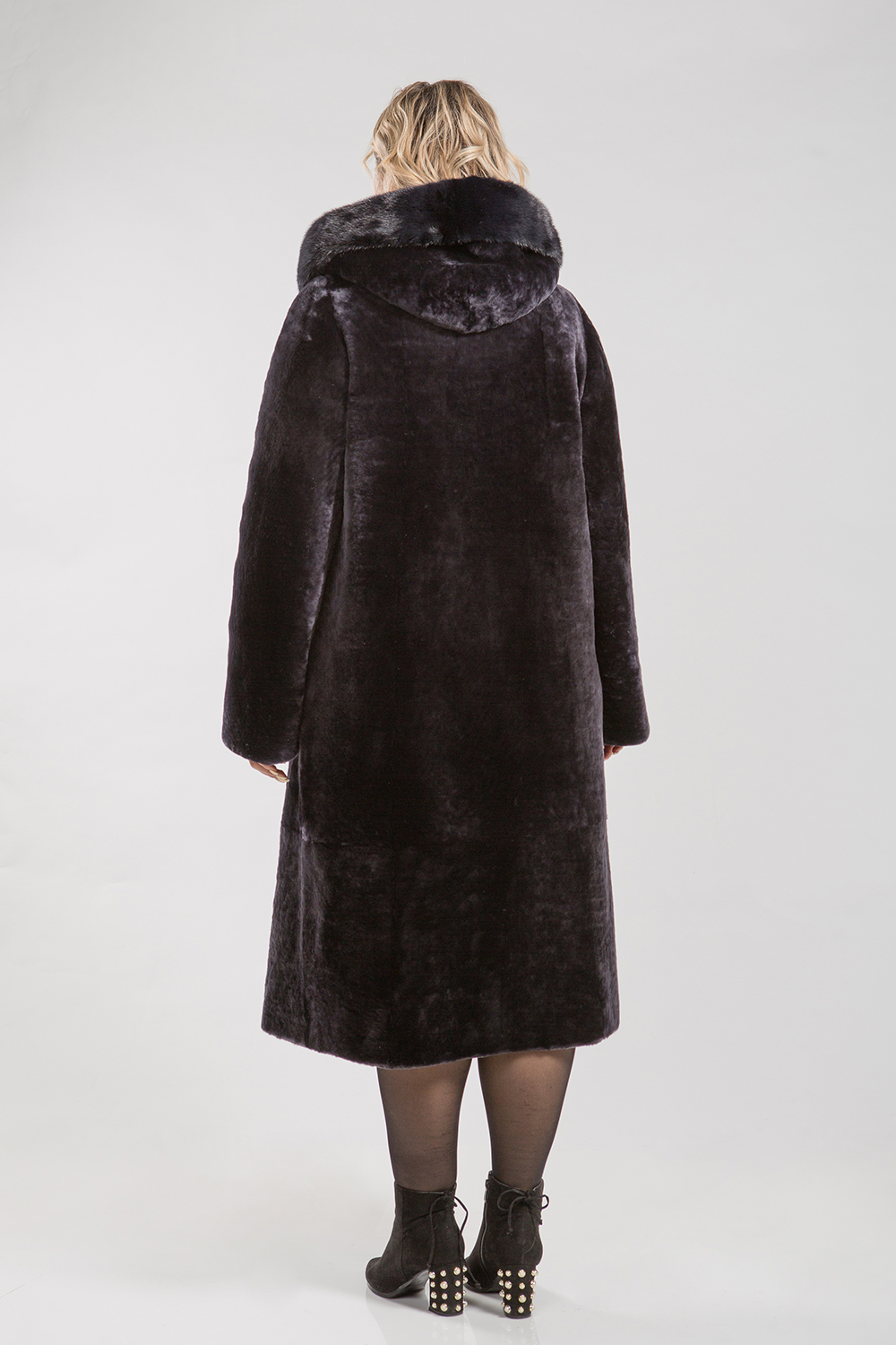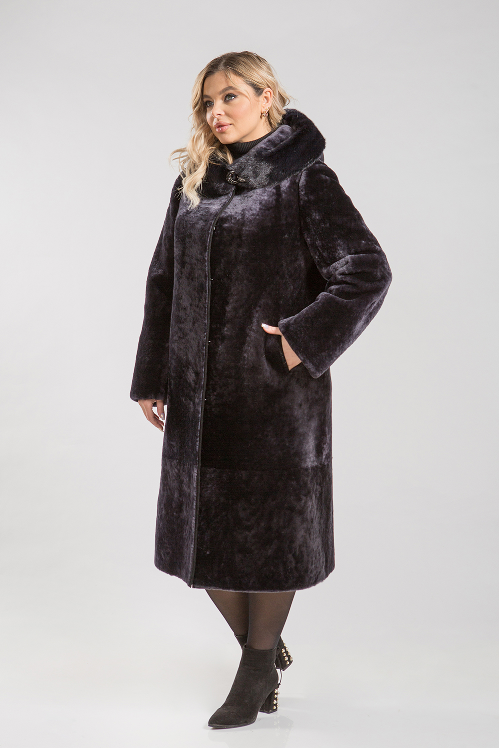 Полупальто, выполненное из меха овчины, дополнено капюшоном, украшенным норковым мехом. Рукава изделия могут быть подвернуты в манжеты и укорочены в зависимости от индивидуальных предпочтений. Кармашки и борта полупальто оформлены натуральной кожей. Длина изделия составляет 115 сантиметров.