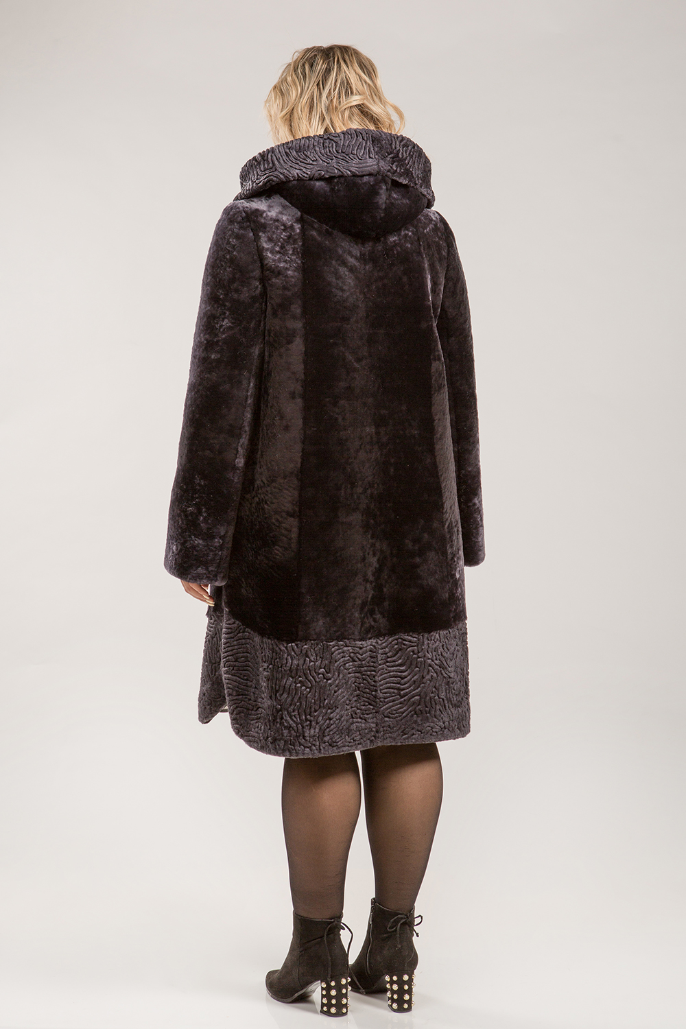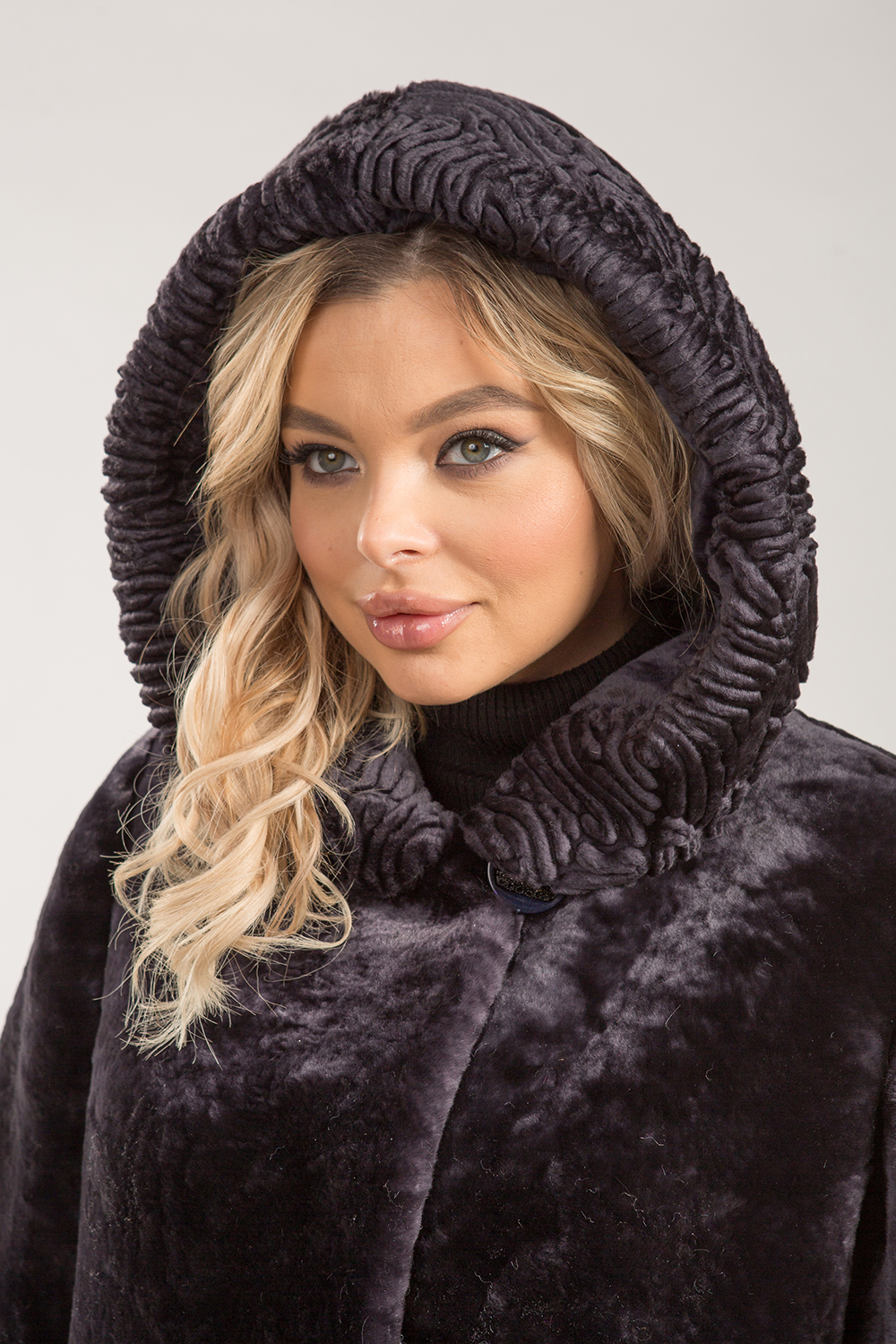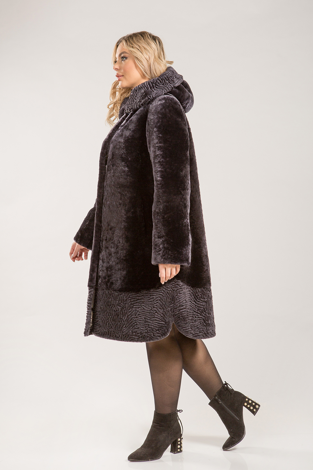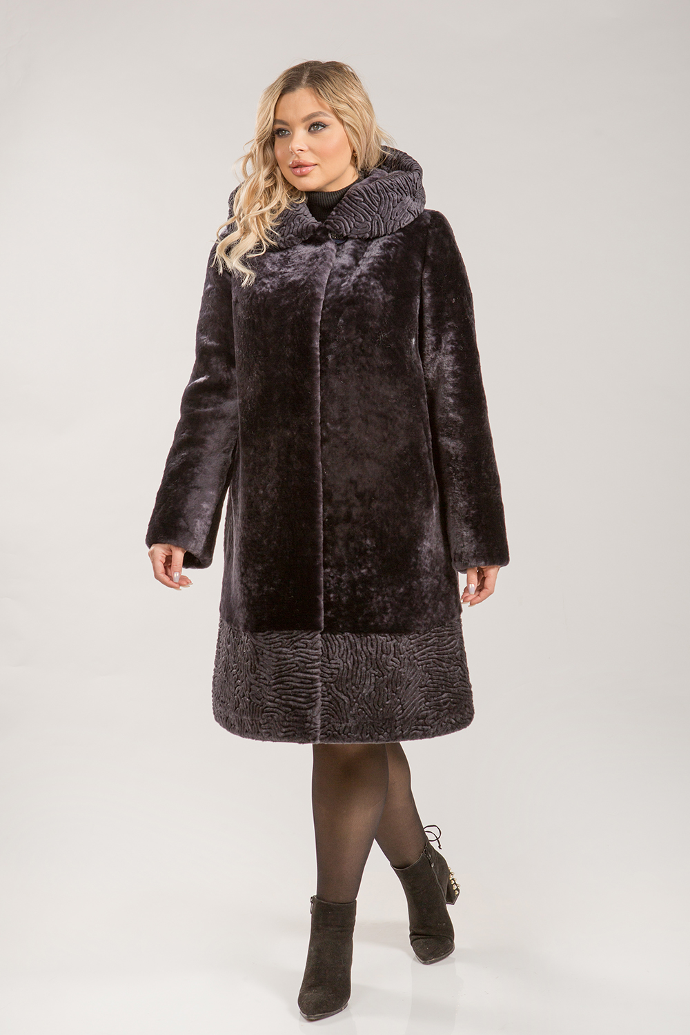 Полупальто из меха овчины с капюшоном. Крой изделия пластины. Рукава модели могут подворачиваться манжетом и укорачиваться, если в этом есть необходимость. Кармашки изделия обработаны натуральной замшей. Капюшон и низ модели декорированы красивой ажурной выстрижкой. Длина изделия 100 см. Застегивается шубка на клипсы. Натуральный мех овчины не боится атмосферных осадков, сохраняет тепло и защищает от ветра. Классическое полупальто с элементами декора в гардеробе всегда актуально!