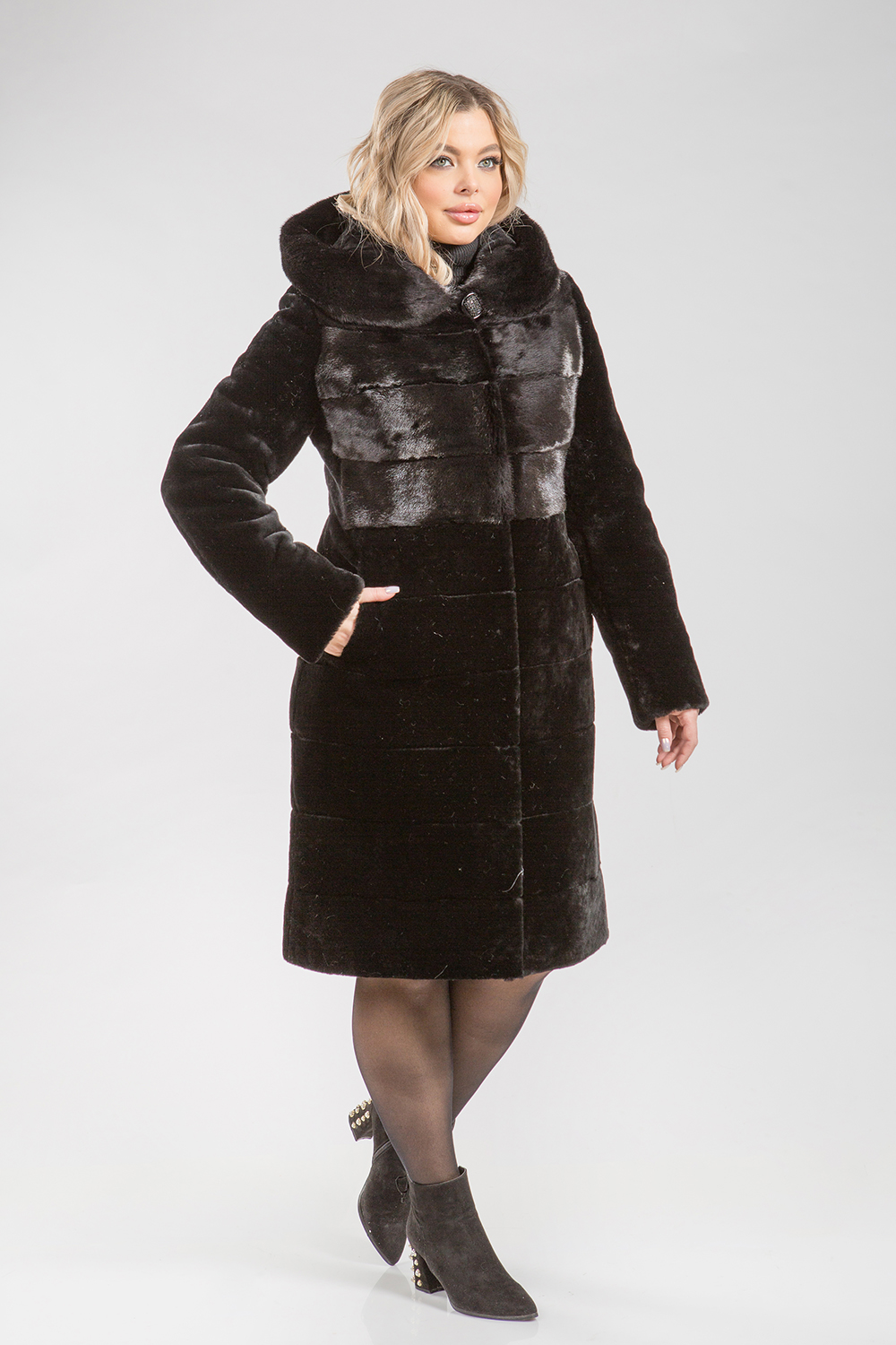 Полупальто из меха овчины. Капюшон и полочка модели декорированы мехом норки. Крой юбки поперечная выкладка пластин. Рукава изделия могут подворачиваться манжетом и укорачиваться, если в этом есть необходимость. Кармашки и борта модели отделаны натуральной кожей. Длина изделия 115 см. Классическая шубка всегда актуальна! Этого стиля в одежде придерживаются дамы разного возраста, старающиеся выглядеть женственно и элегантно в любое время года!