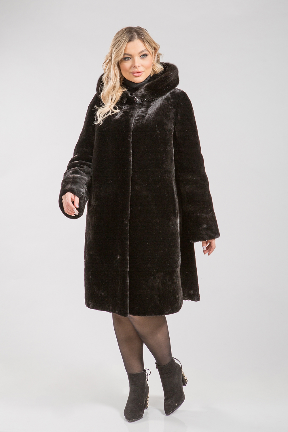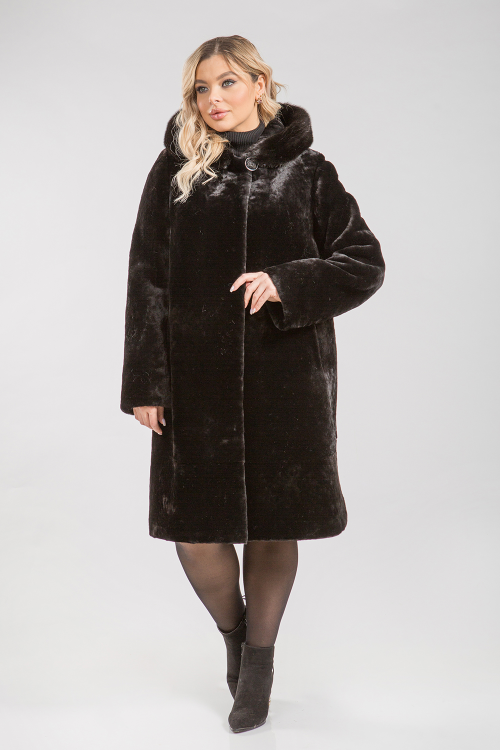 Полупальто из меха овчины. Капюшон модели декорирован мехом норки. Крой изделия пластины. Рукава модели могут подворачиваться манжетом и укорачиваться, если в этом есть необходимость. Кармашки изделия обработаны натуральной замшей. Длина изделия 100 см. Застегивается шубка на клипсы. Натуральный мех овчины не боится атмосферных осадков, сохраняет тепло и защищает от ветра. Классическое полупальто с элементами декора в гардеробе всегда актуально!