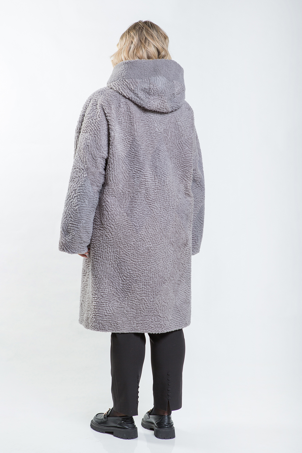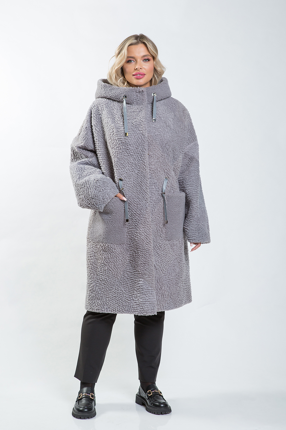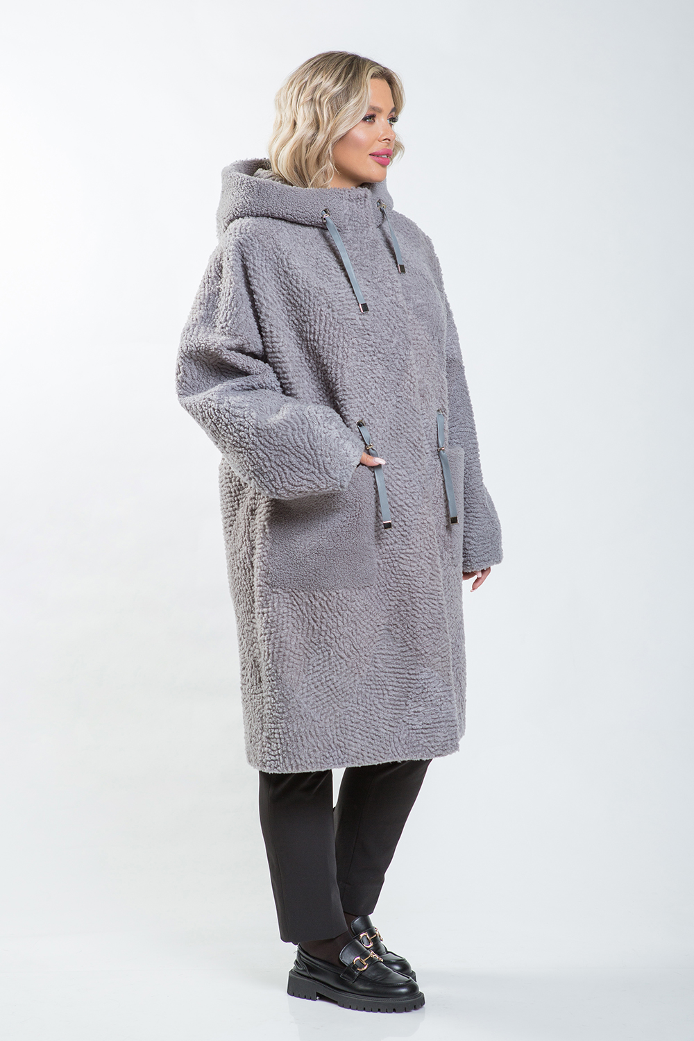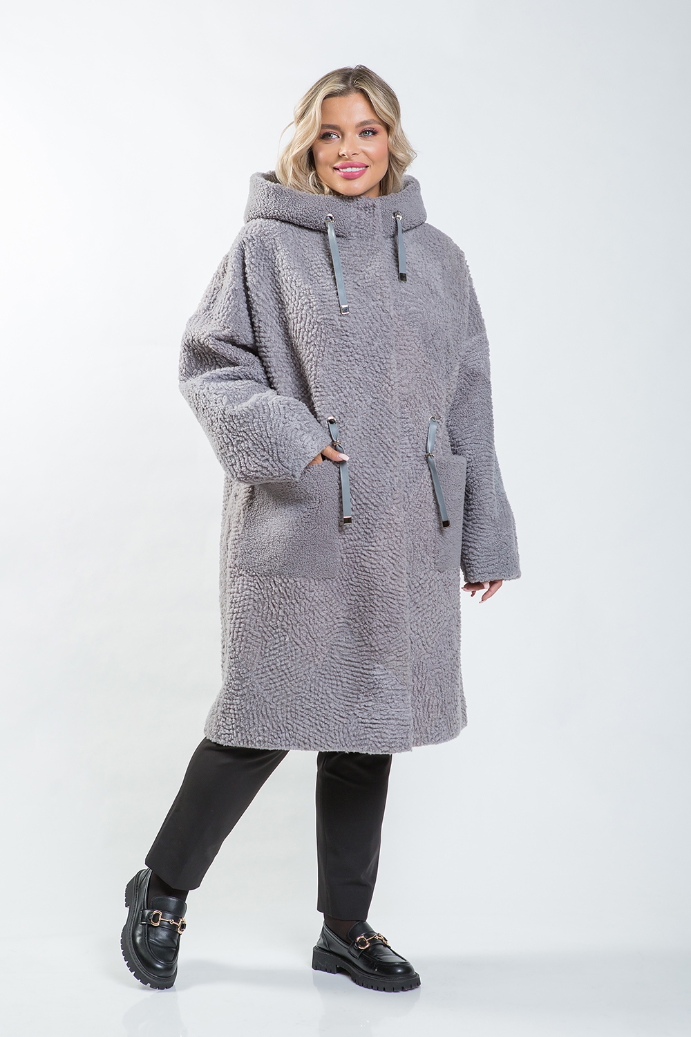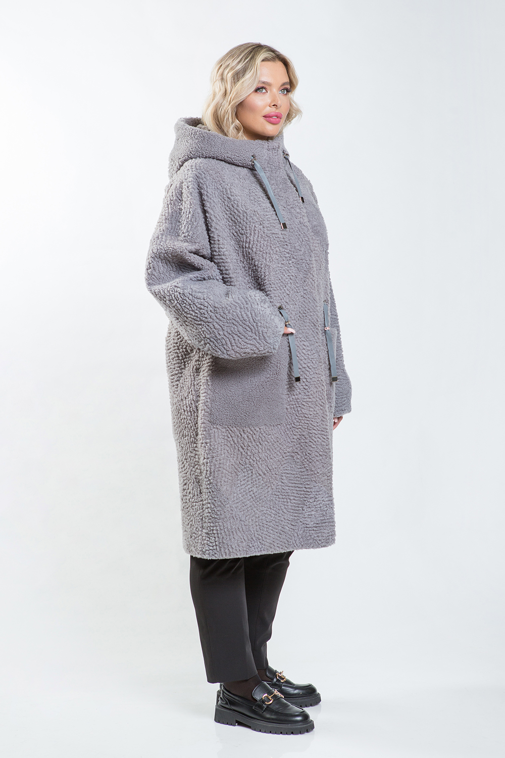 Полупальто из меха овчины с капюшоном. Крой изделия пластины с ажурной выстрижкой. Небольшой кожаный поясок продевается внутри изделия и тем самым предает меховому пальто оригинальность. Модель застегивается на клипсы. Длина изделия 105 см. Стильная шубка светло-серебристого оттенка освежает и омолаживает образ! Обратите внимание на современный фасон шубки, который скрадывает объемы и скрывает все проблемные места!