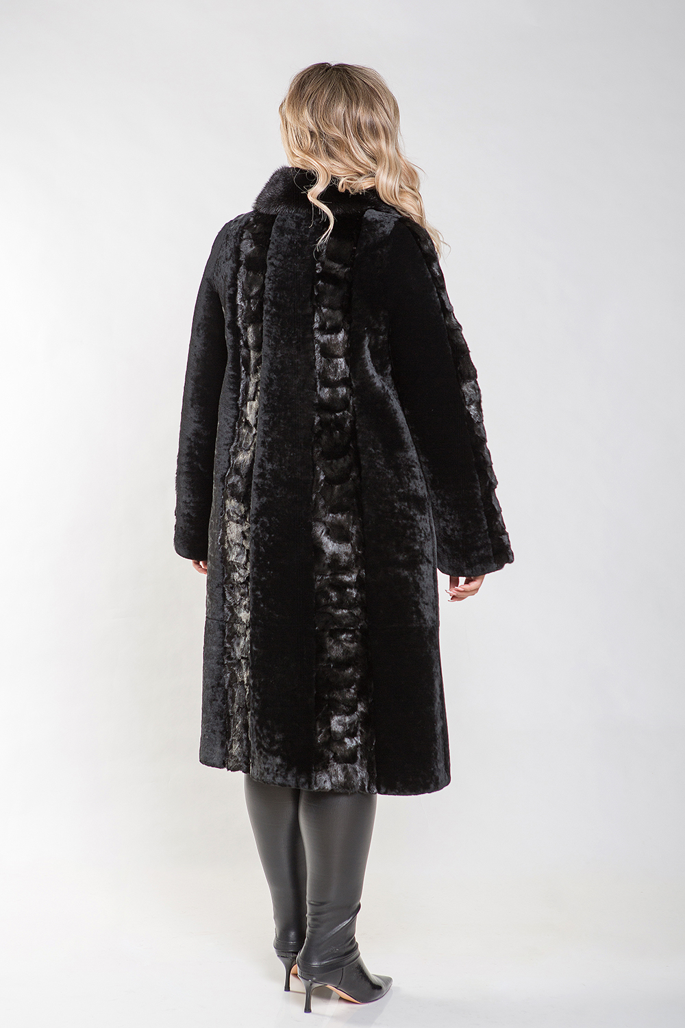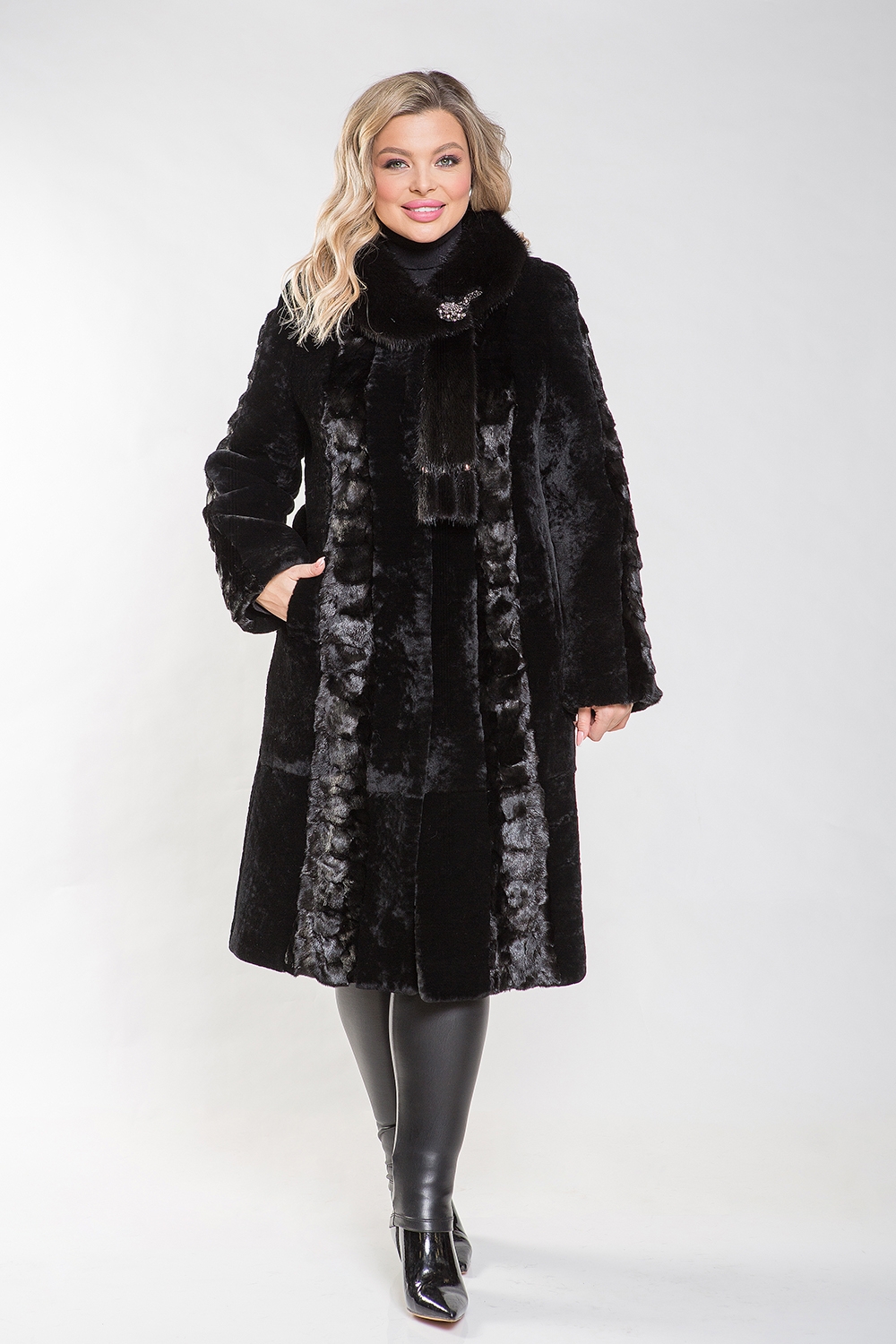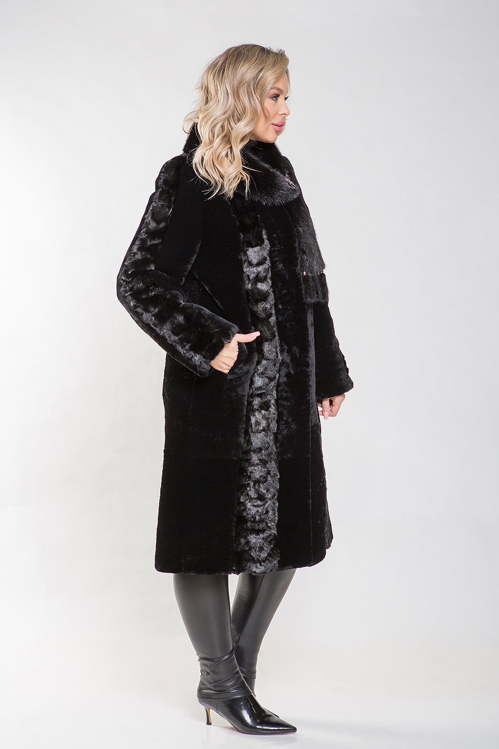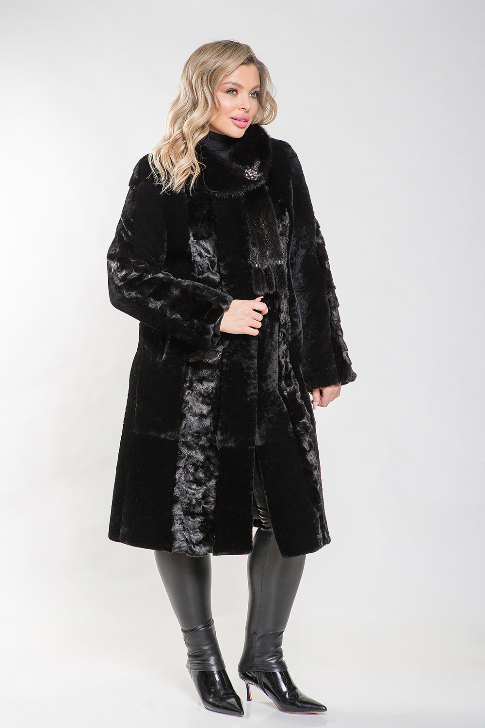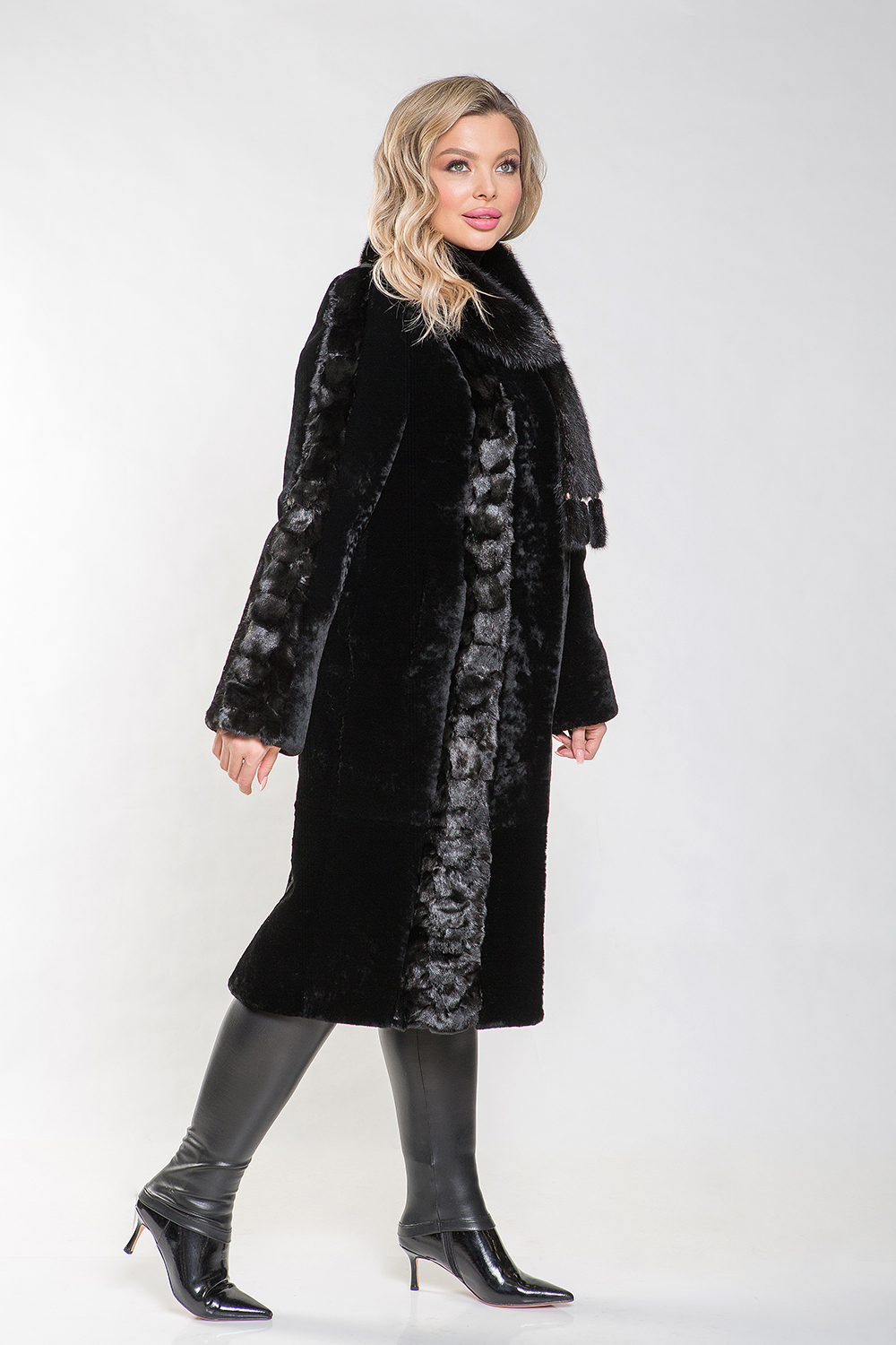 Полупальто, выполненное из меха овчины, станет отличным выбором для ценителей элегантного классического стиля. Воротник украшен мехом норки и надежно фиксируется с помощью декоративной клипсы. Длина изделия составляет 110 см, что обеспечивает удобство в носке. Шубка также декорирована вставками из меха норки, что придает ей особый шарм. Рукава модели можно подворачивать, создавая эффектные манжеты. Эта модель обязательно понравится ценительницам безупречного стиля!