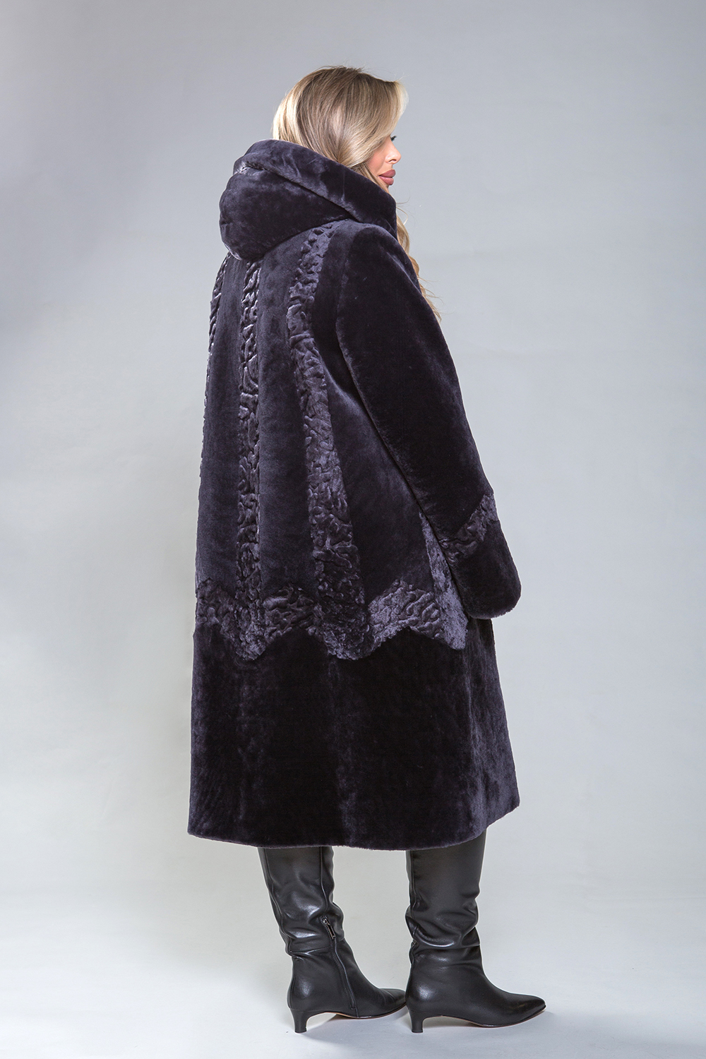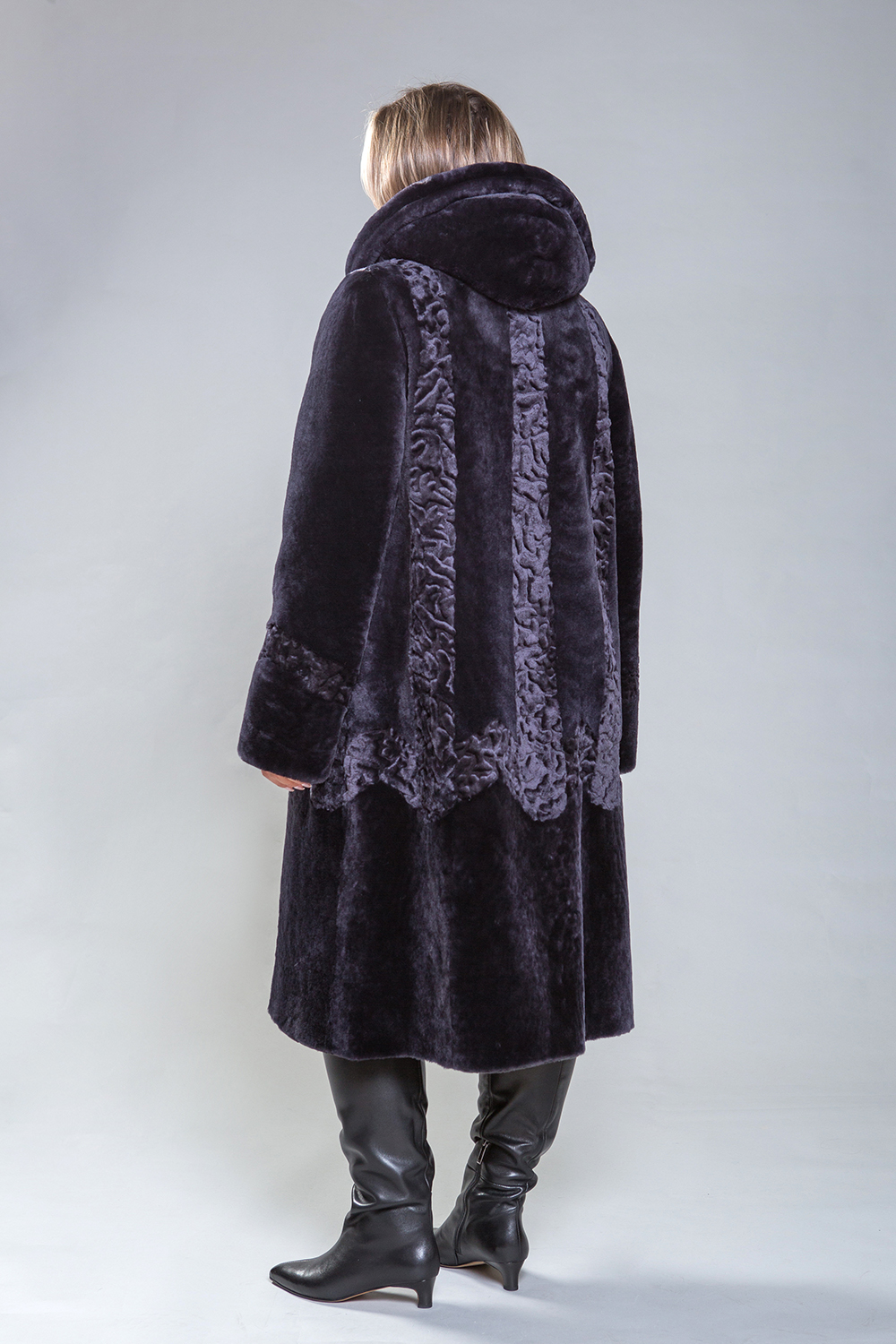 Полупальто из натуральной овчины с капюшоном, украшенное декоративной узорной выстрижкой. Узор выполнен вертикально и расположен как спереди, так и сзади. Застежка — пуговицы. Карманы и борта изделия сделаны из натуральной замши. Модель современного фасона визуально уменьшает объемы и скрывает проблемные зоны. Длина полупальто — 110 см. Оно легкое, уютное и комфортное.