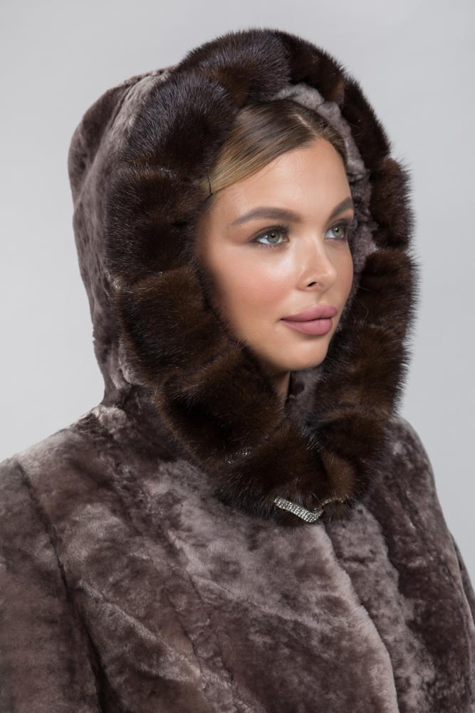 Полупальто из меха овчины. Капюшон модели дополнен мехом норки. Модель слегка расклешена. Изделие застегивается на клипсы. Шубка декорирована фигурной выстрижкой. Рукава модели могут подворачиваться, образуя манжеты. Длина изделия 110 см. Такая элегантная модель для ценительниц строгого классического стиля! Очень теплая и комфортная шубка!