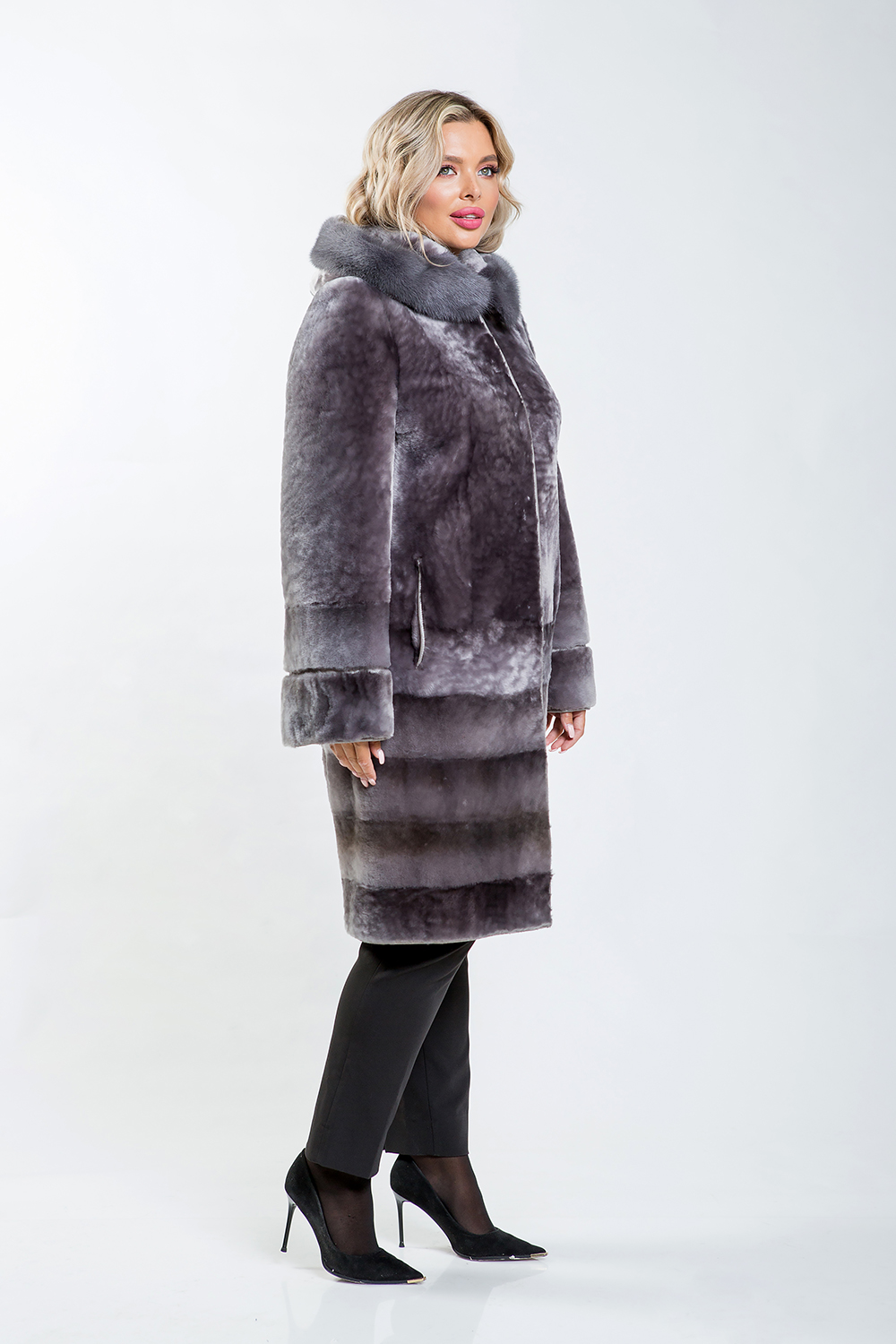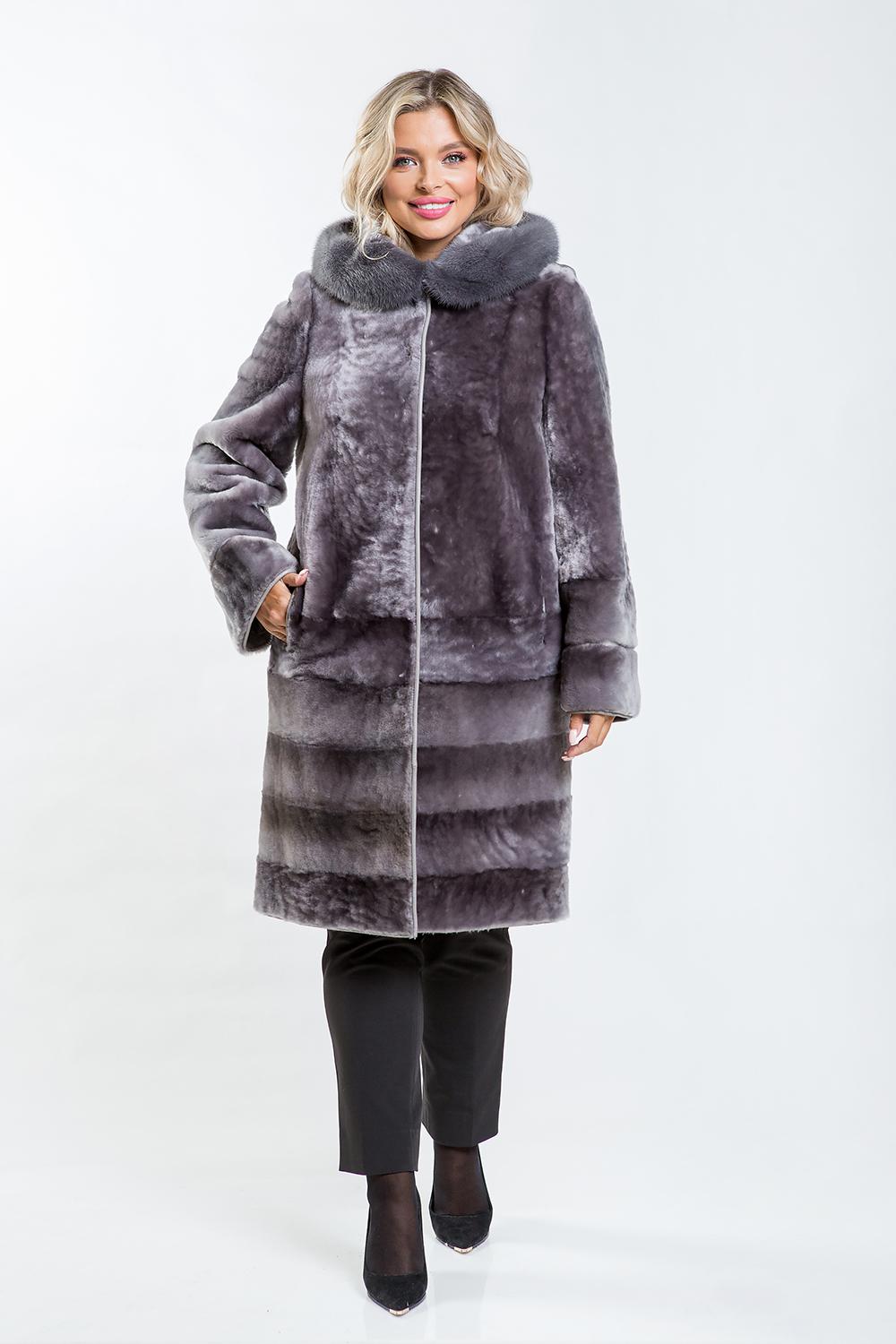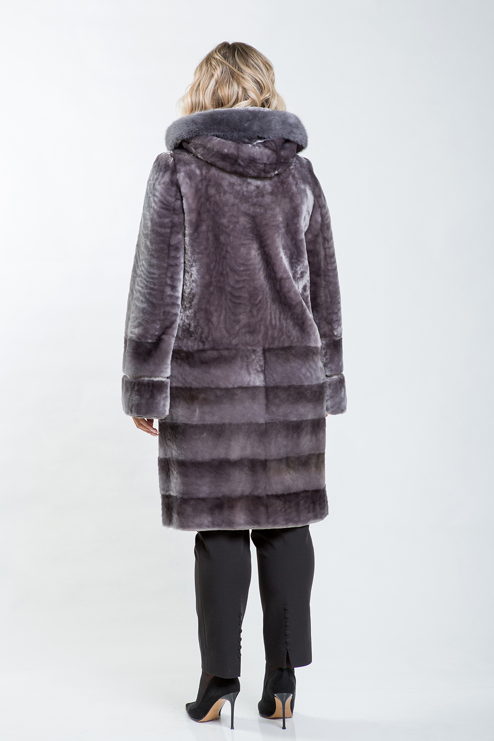 Полупальто из меха овчины. Капюшон модели декорирован мехом норки. Крой изделия пластины, низ модели-поперечная выкладка пластин. Рукава, карманы и борта шубки обработаны натуральной кожей. Модель застегивается на клипсы. Длина изделия 100 см. Шубка имеет универсальный фасон и подходит для любого типа фигуры!