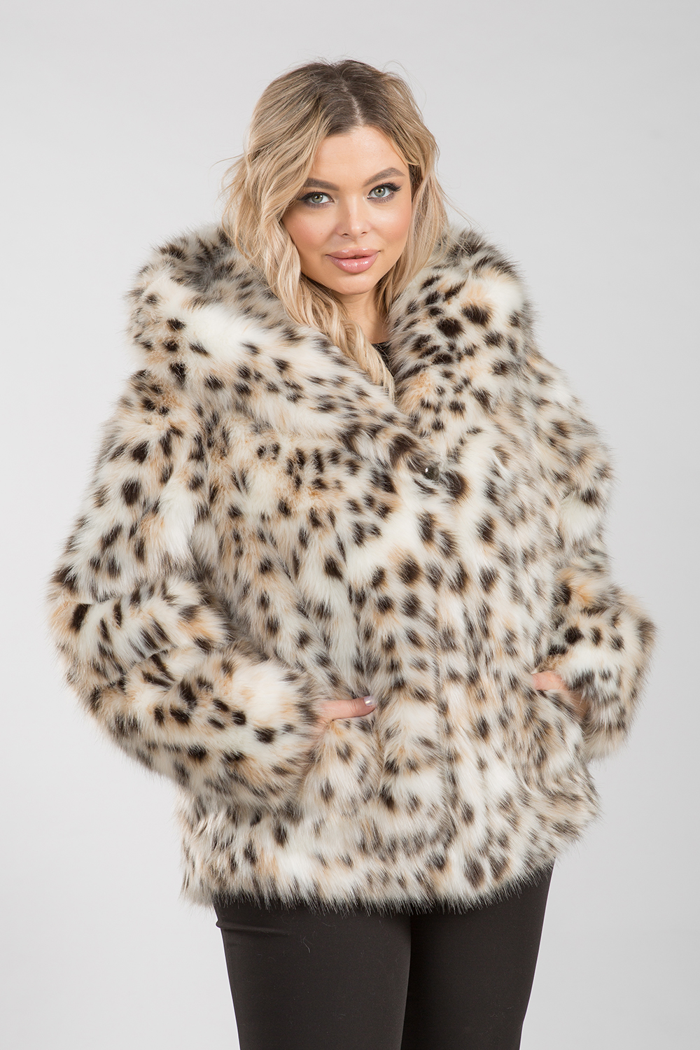 Курточка из искусственного меха с капюшоном. Застегивается модель на пуговицы и клипсы. Великолепная расцветка похожая на рысь не оставит равнодушной ни одну модницу. Длина изделия 80 см. Курточка легкая и комфортная!