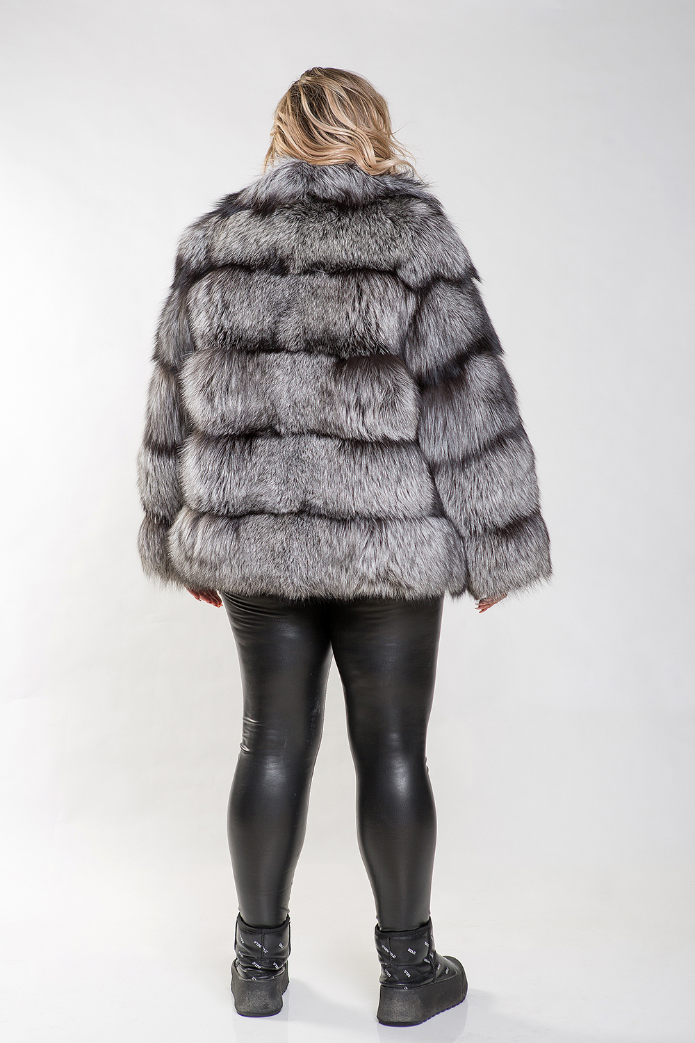 Изящная курточка из меха чернобурой лисы с английским воротником станет настоящей жемчужиной вашего гардероба! Её длина составляет 68 сантиметров, что гарантирует комфорт в любых погодных условиях.