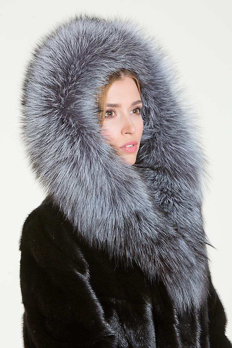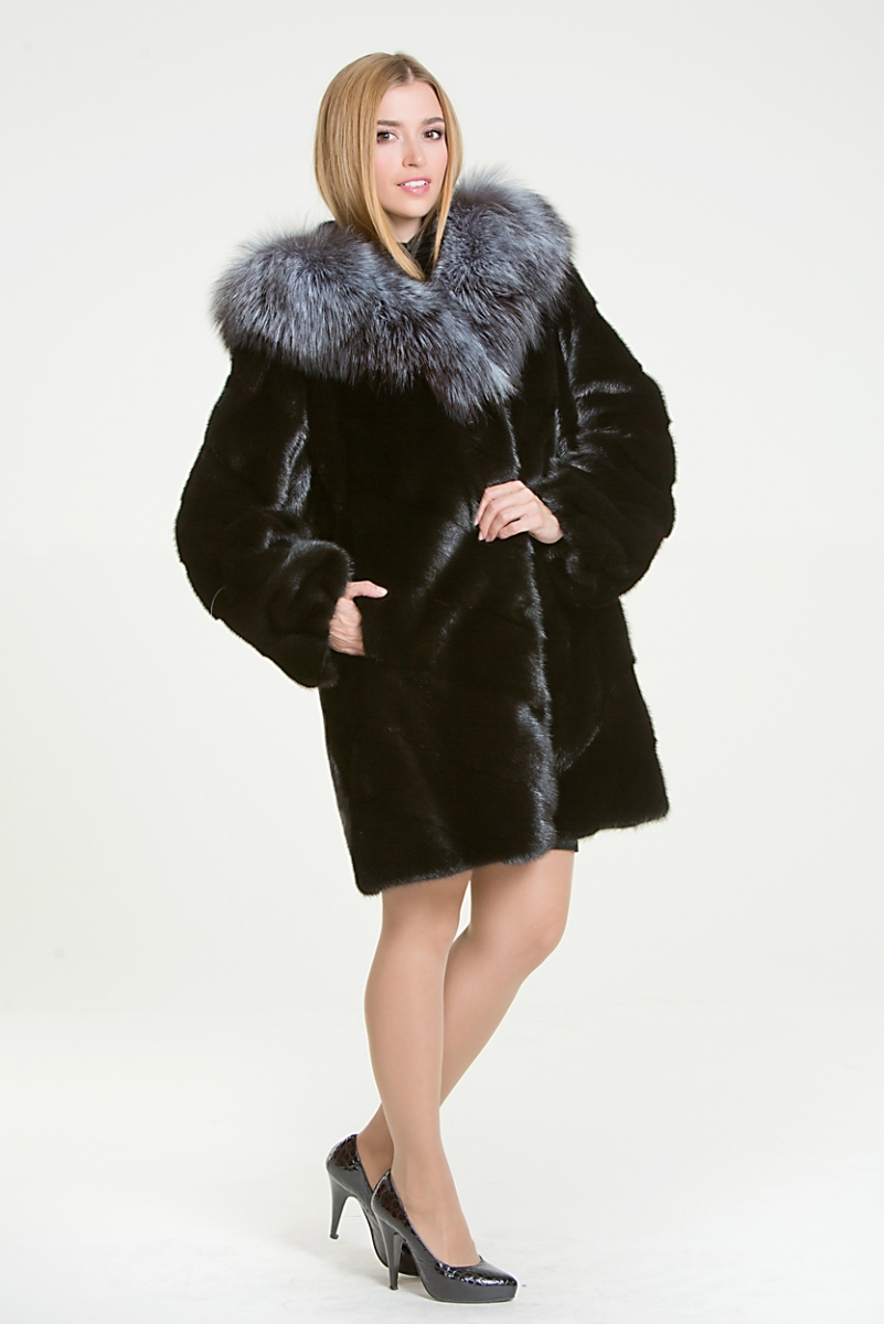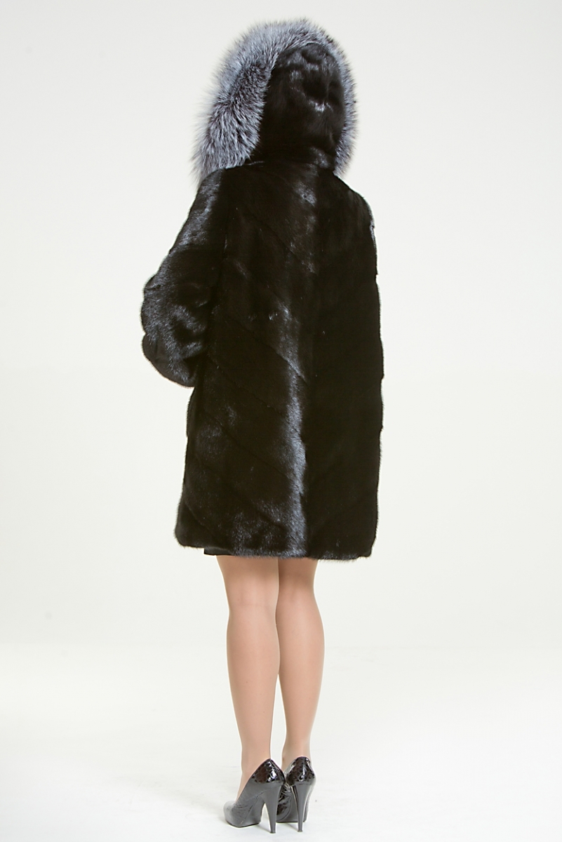 Курточка из меха норки. Капюшон изделия декорирован мехом чернобурой лисы. Крой модели диагональная выкладка пластин. Низ изделия оснащен утяжкой.