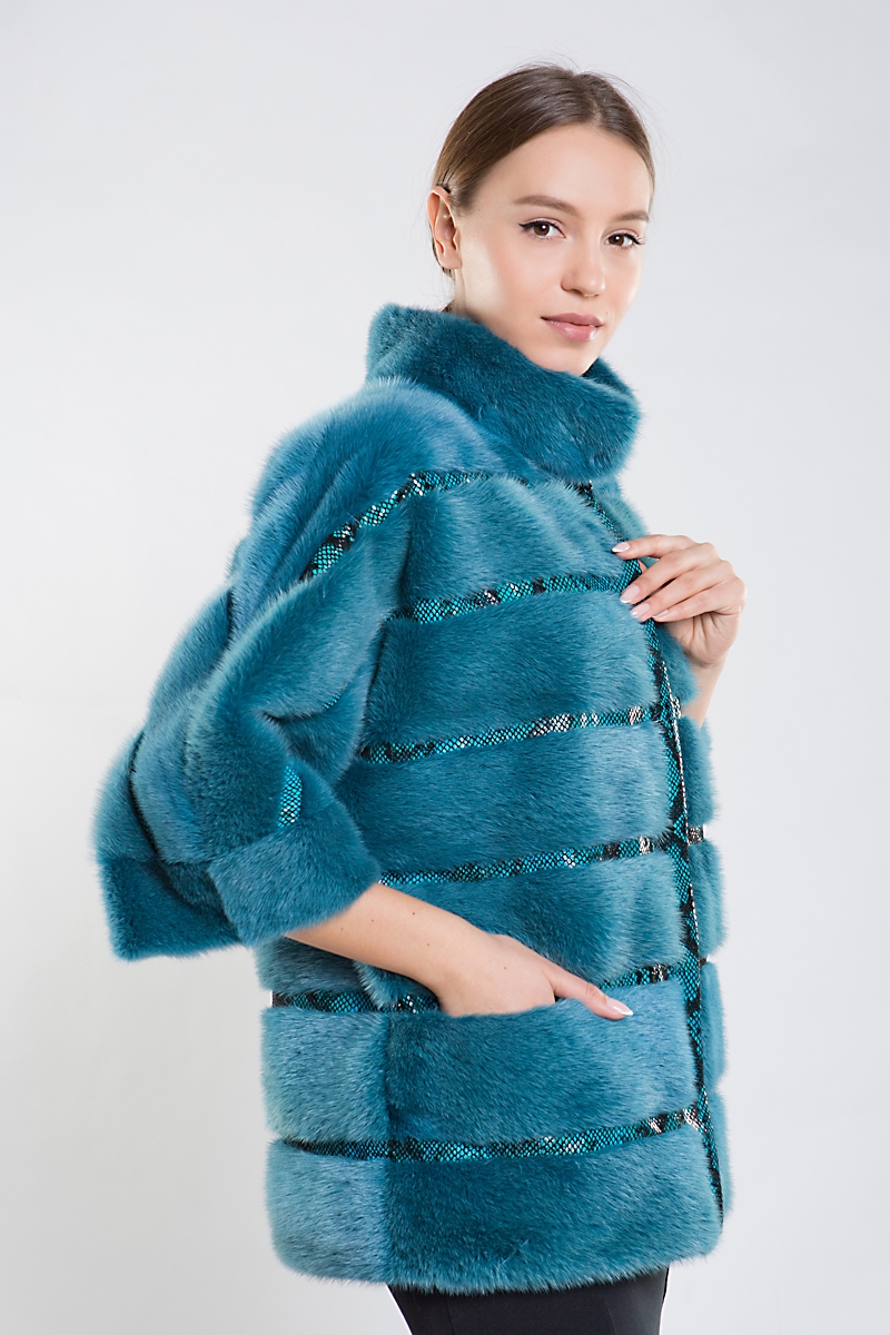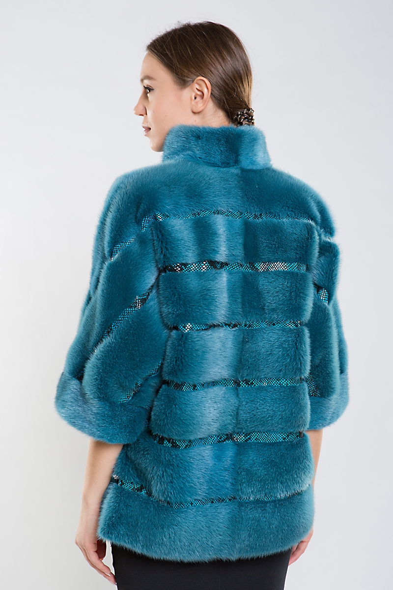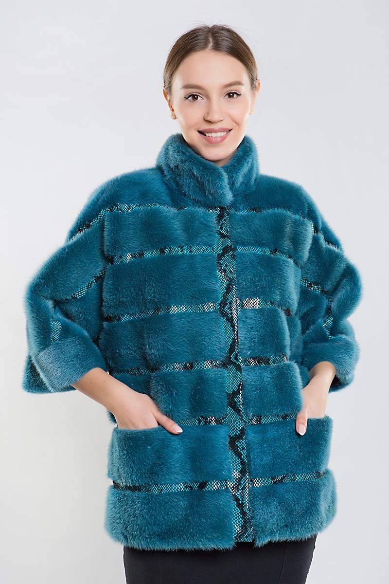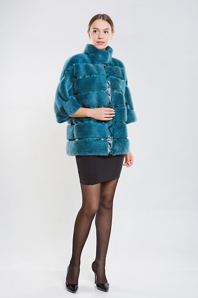 Куртка из меха норки. Модель декорирована натуральной кожей. Воротник стойка. Пройма рукава занижена. Курточка застегивается на оригинальные кнопки. Рукав модели укороченный. В такой курточке бирюзового цвета Вы будете неотразимы!