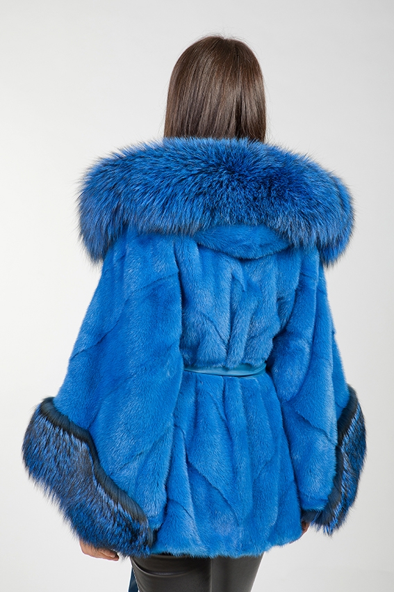 Куртка-пончо из меха норки. Капюшон модели декорирован мехом лисы. Крой изделия пластины с добавлением роспуска. Длина модели 80 см. Рукава курточки свободного кроя. Модель комфортная и теплая, а сногсшибательный цвет голубовато-синего циркона подчеркнет индивидуальность леди. В такой курточке вы не останетесь незамеченной!!!