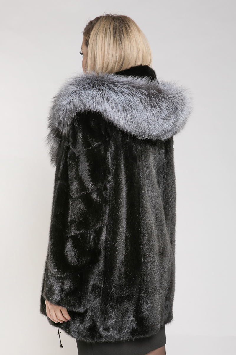 Эта норковая курточка отличается уникальным дизайном: её капюшон украшен мехом чернобурой лисы. Крой изделия выполнен в стиле "роспуск", а рукава сшиты из диагонально выложенных пластин.