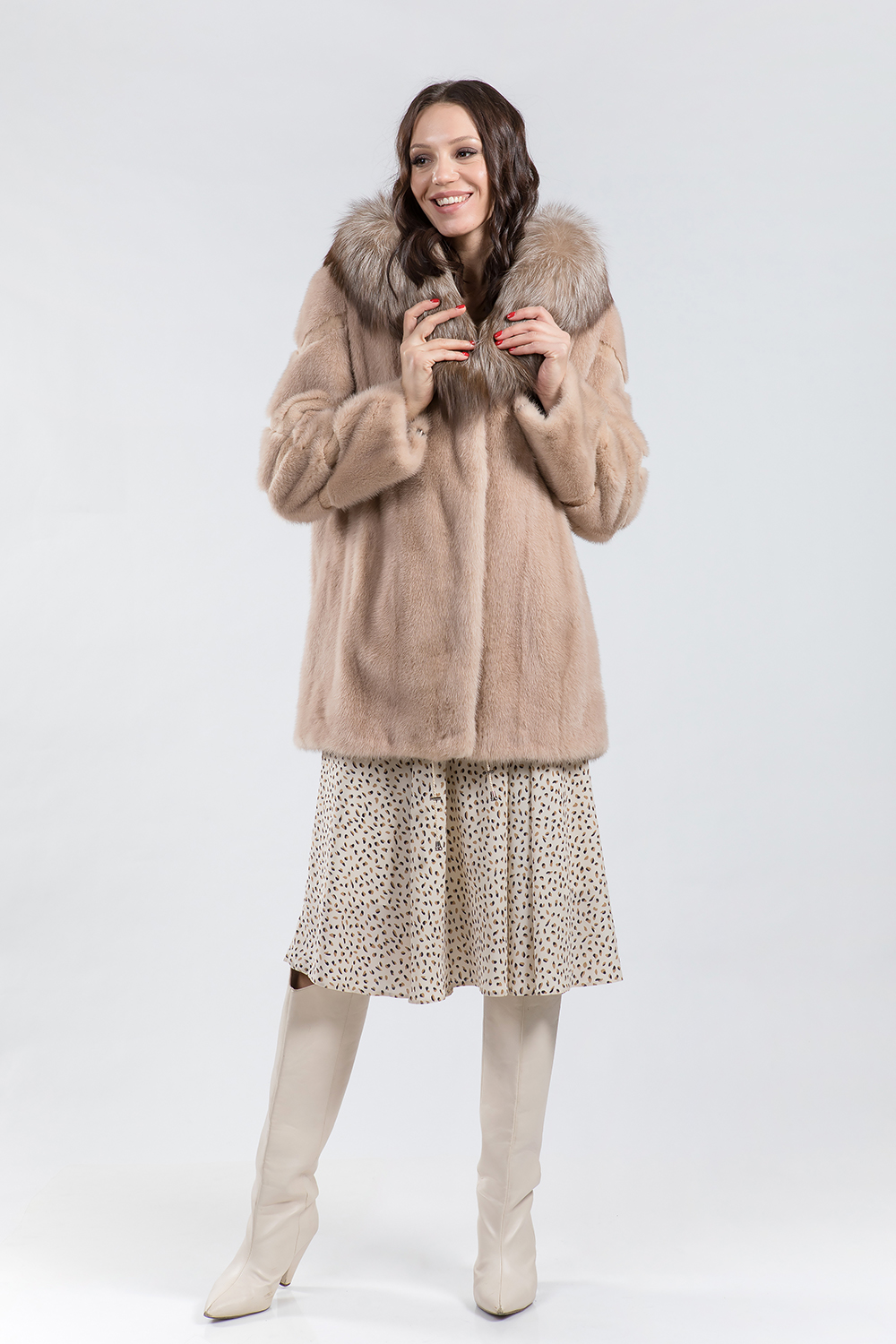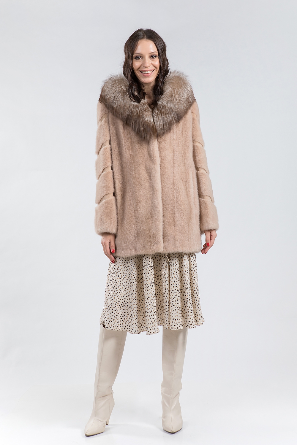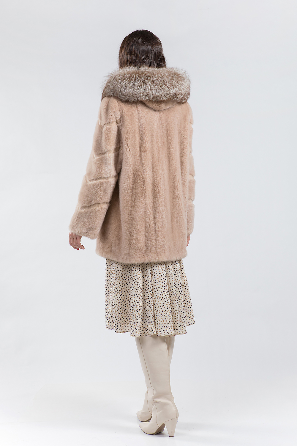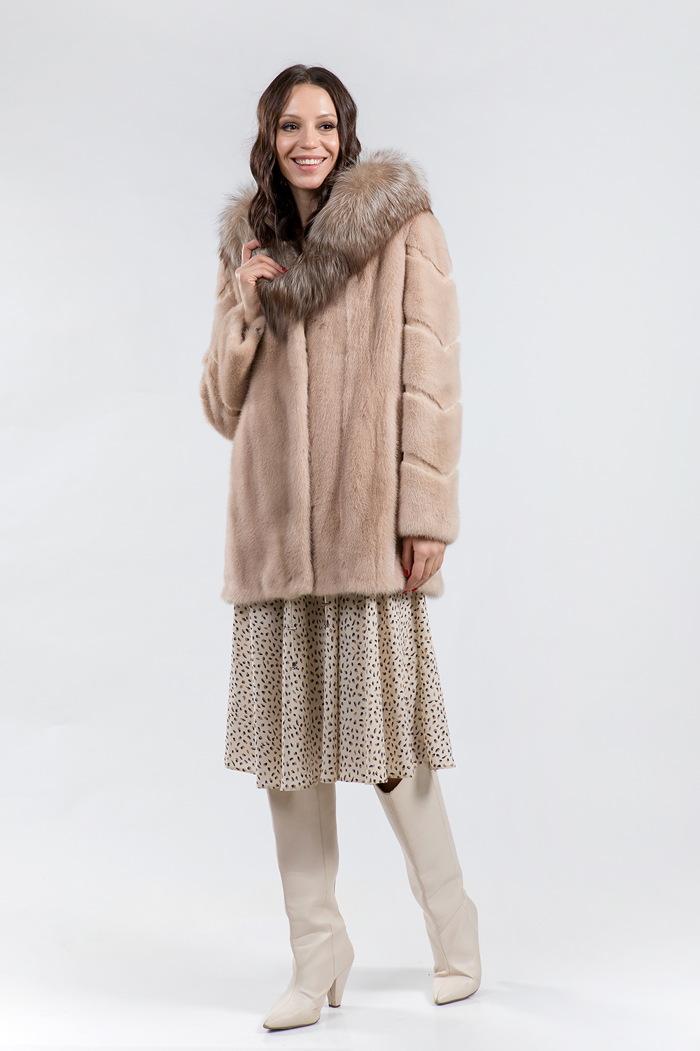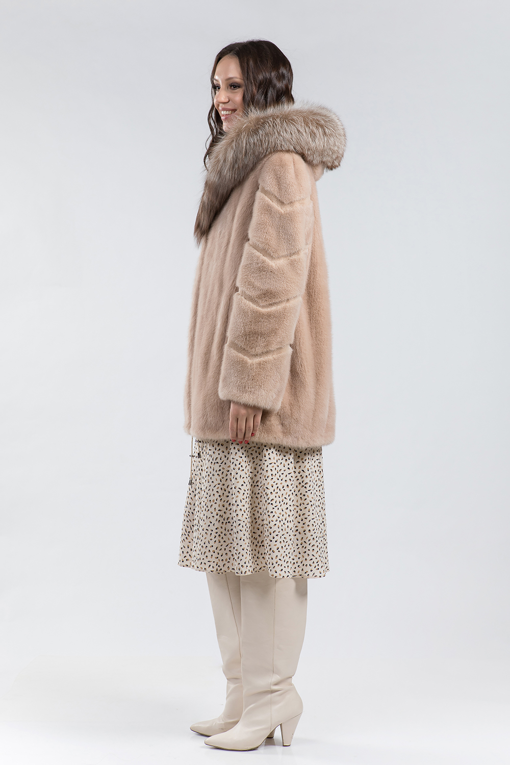 Куртка из меха норки. Капюшон модели дополнен мехом лисы. Крой изделия роспуск с добавлением пластин. Рукава курточки декорированы диагональной выстрижкой. Модель оснащена регулирующими утяжками но низу и на рукавах. Длина изделия 80 см. Курточка имеет универсальный фасон, подходит для любого типа фигуры. Нежный цвет циркона придаст образу свежесть и женственность!