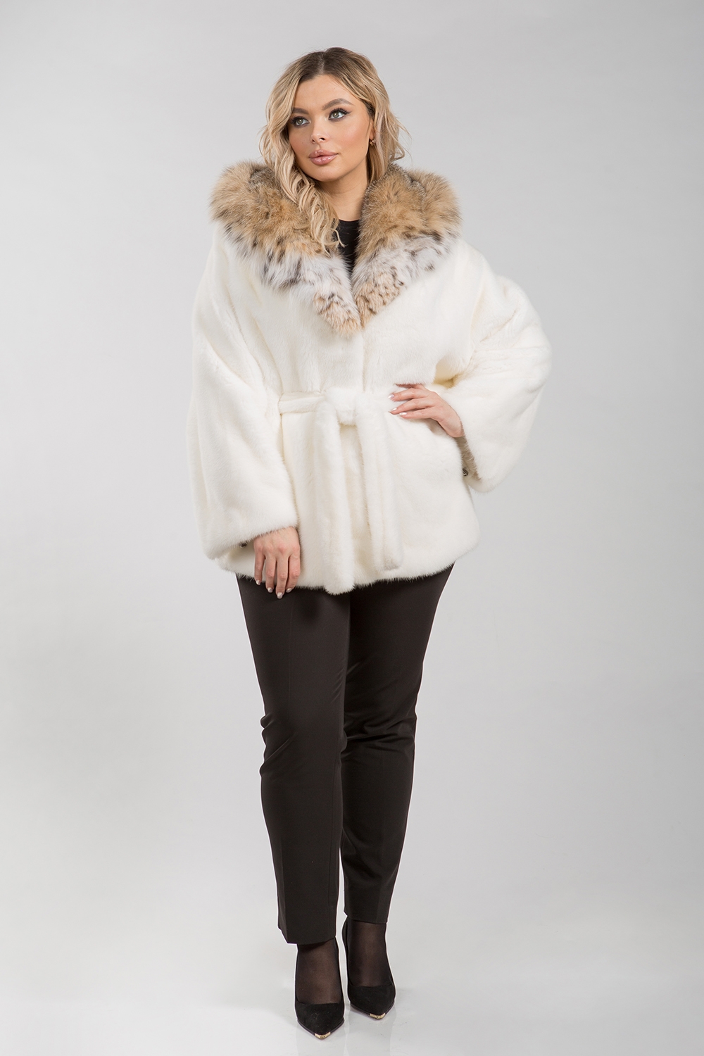 Курточка из меха норки. Капюшон модели декорирован мехом рыси. Крой изделия роспуск с добавлением пластин. На рукавах и по низу модели есть регулирующие утяжки. Длина изделия 77 см. Меховой пояс шубки продевается внутри изделия и тем самым придает курточке оригинальность. А благодаря шикарной рыси шубка выглядит очень эффектно, добавляя в образ модели нотки шика и гламура!
