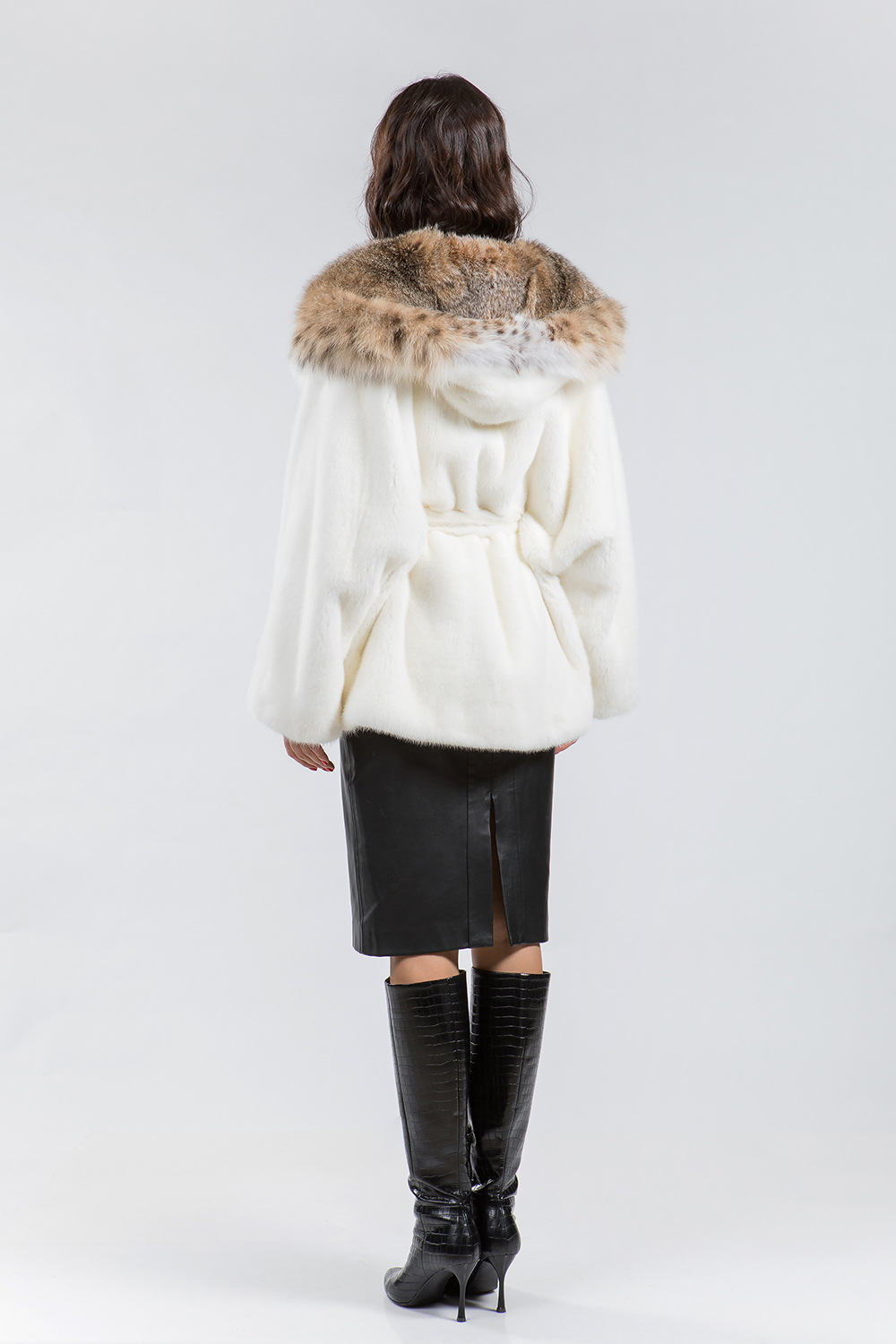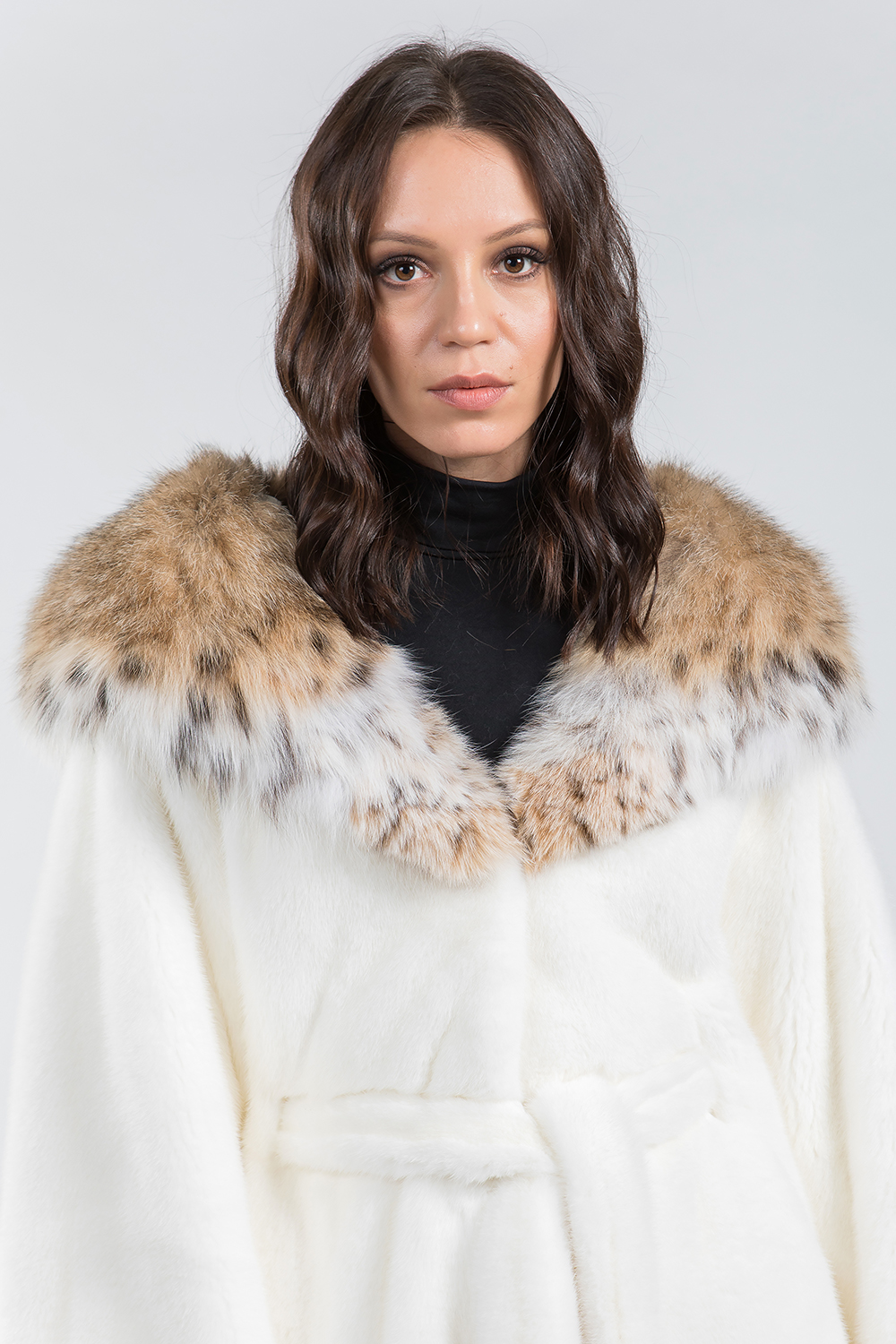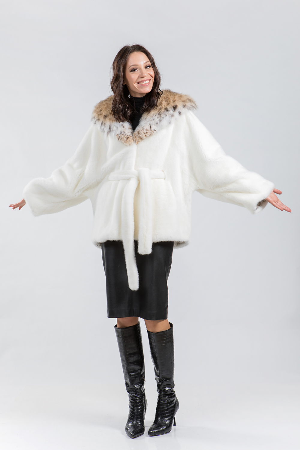 Курточка из меха норки. Капюшон модели декорирован мехом рыси. Крой изделия роспуск с добавлением пластин. На рукавах и по низу модели есть регулирующие утяжки. Длина изделия 77 см. Меховой пояс шубки продевается внутри изделия и тем самым придает курточке оригинальность. А благодаря шикарной рыси шубка выглядит очень эффектно, добавляя в образ модели нотки шика и гламура!