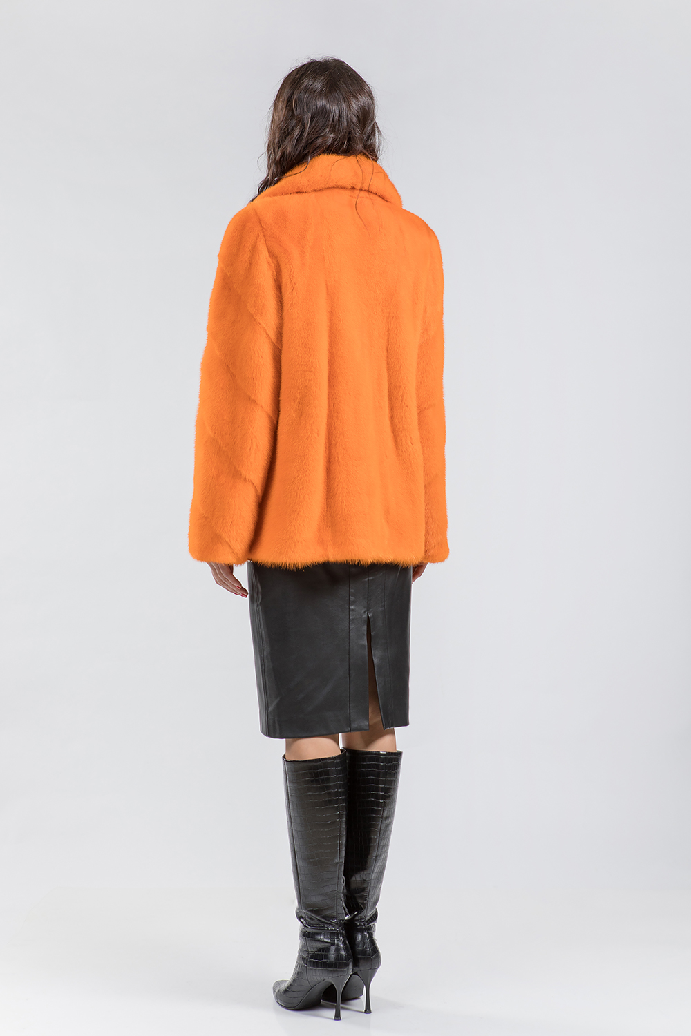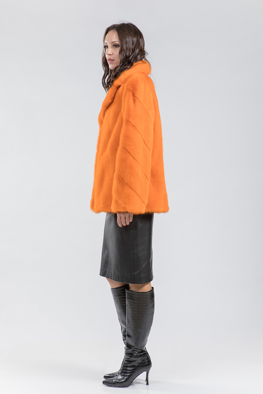 Курточка из меха норки. Английский воротник модели трансформируется в классический. Крой изделия роспуск. Рукава шубки выполнены диагональной выкладкой пластин. Внутри на талии, на рукавах и по низу модели курточка оснащена регулирующими утяжками. Длина изделия 70 см. Кожаный пояс идет в комплекте. Сногсшибательный цвет апельсина предназначен для создания стильных и эффектных образов!