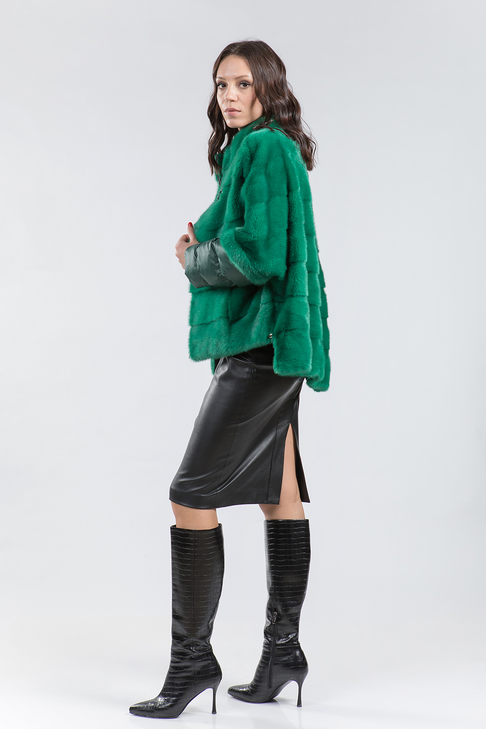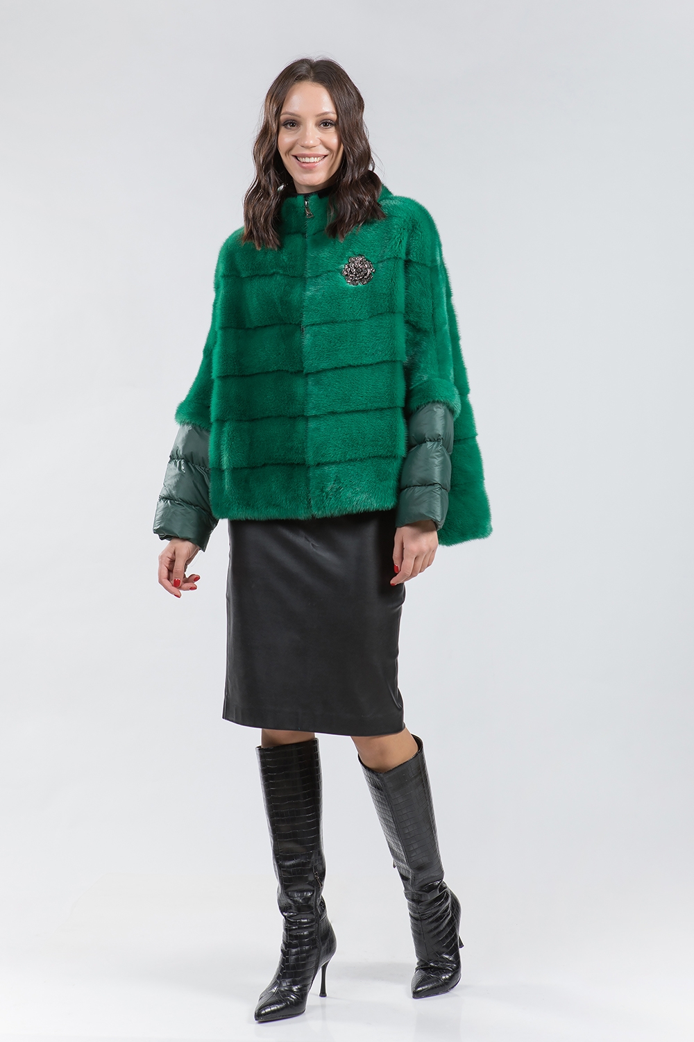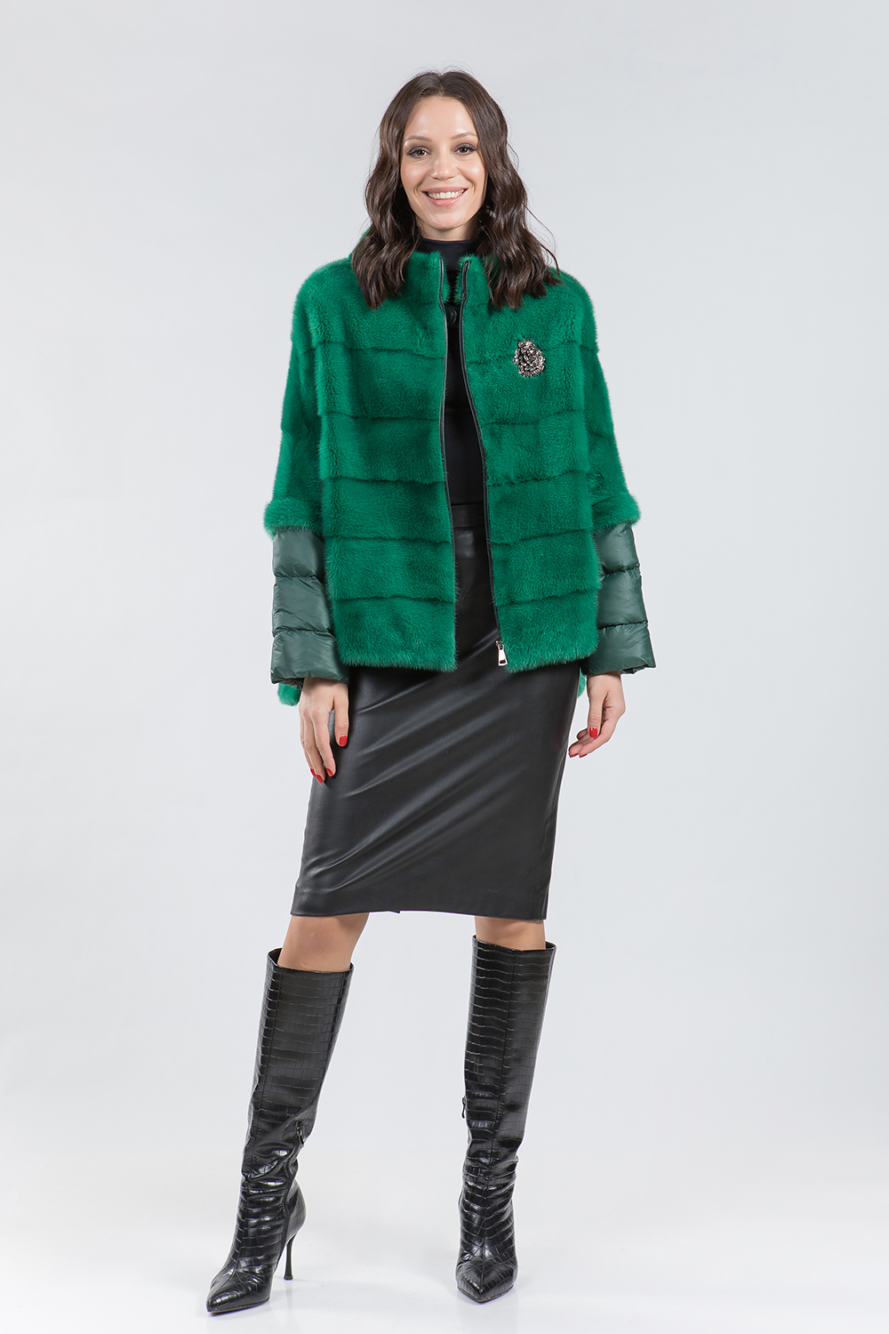 Курточка-жилет из меха норки. Крой изделия поперечная выкладка пластин. Рукава модели трансформируются в более укороченные. Лаконичный дизайн воротника напоминает стиль Шанель. Низ и рукава изделия имеют регулирующие утяжки. Застегивается курточка на молнию. Такая изящная курточка хорошо сидит на любой фигуре и гармонично сочетается с различными аксессуарами. Универсальный вариант в прохладную погоду!