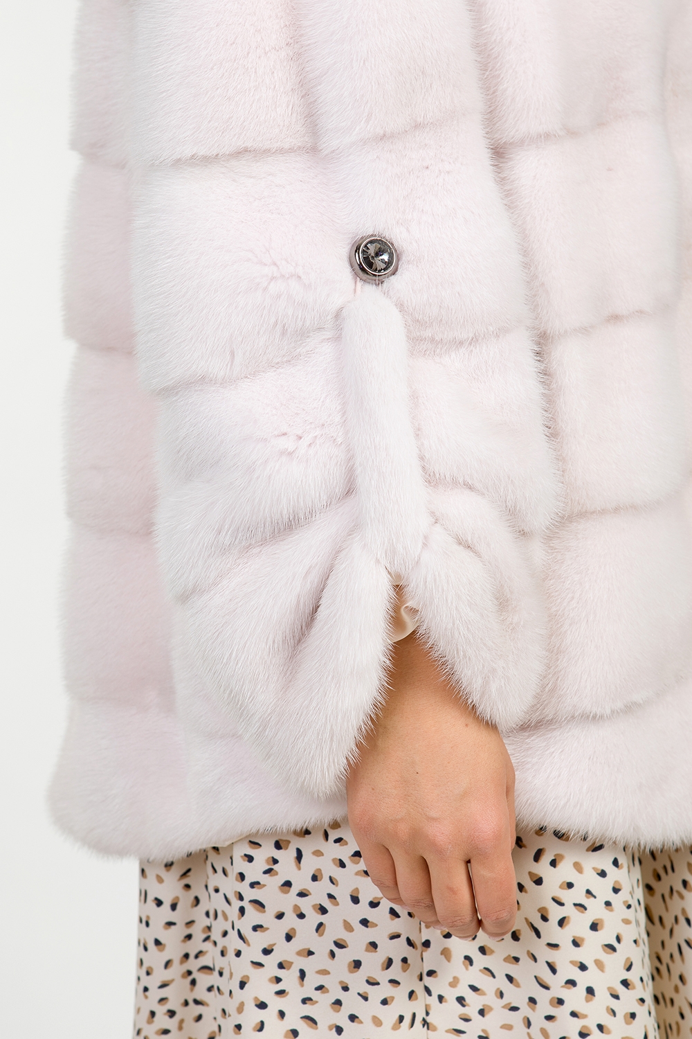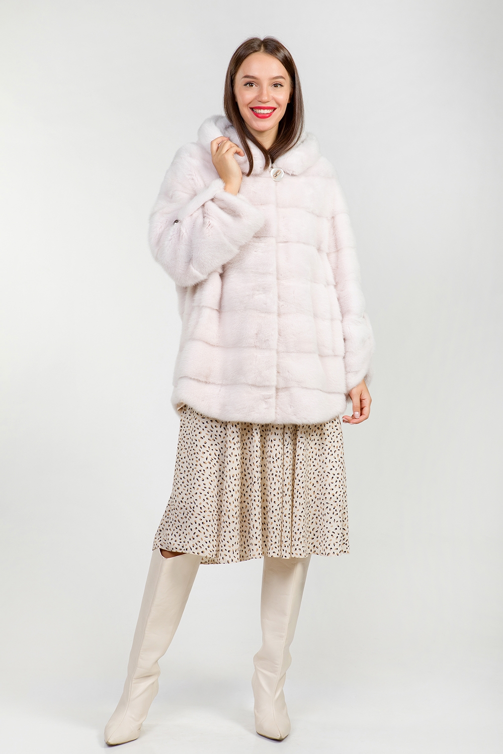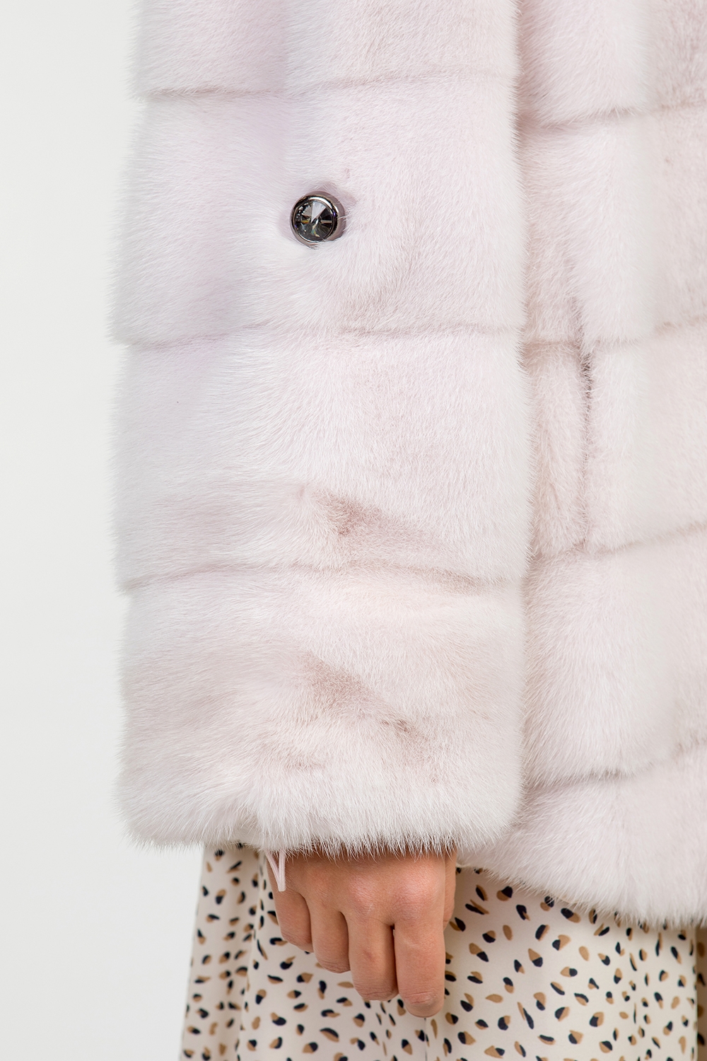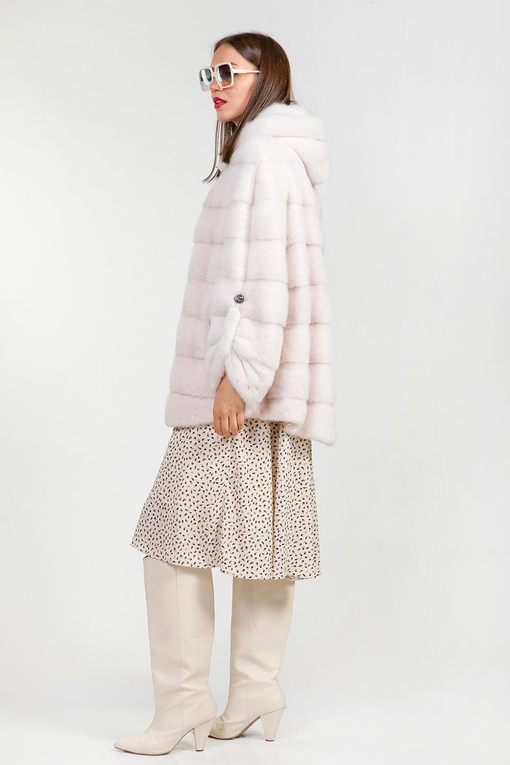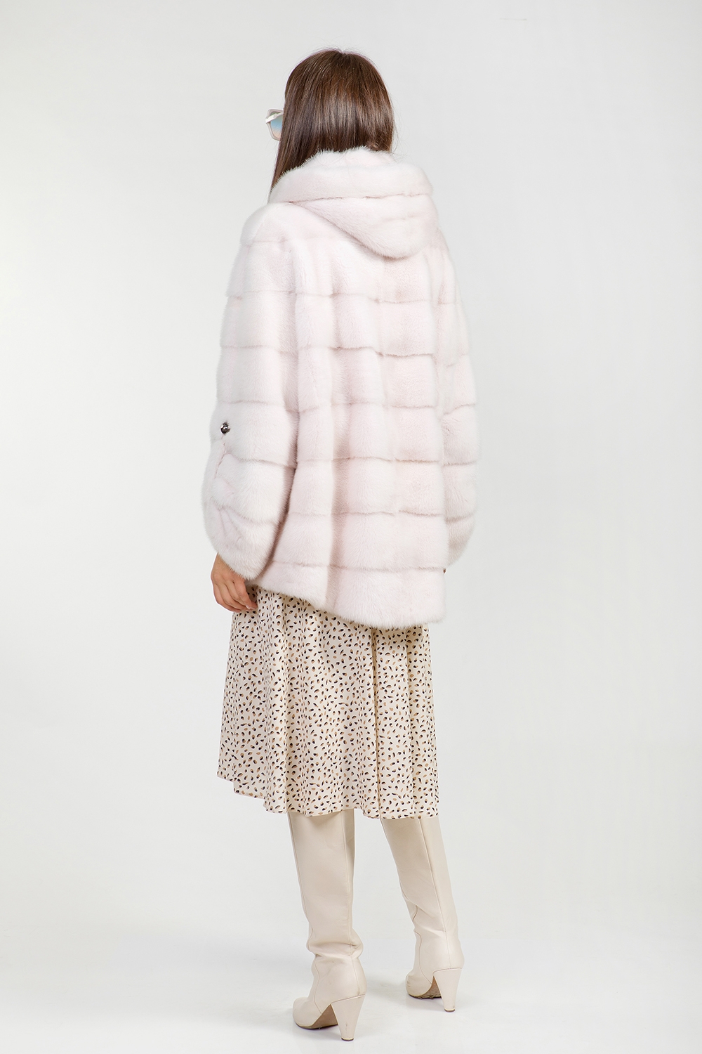 Куртка из меха норки с капюшоном. Крой изделия поперечная выкладка пластин. Рукава модели трансформируются в более укороченные с помощью меховой утяжки. Еще имеется утяжка в зоне талии, позволяющая подчеркнуть стройность фигуры. Длина изделия 80 см. Курточка в светлых тонах дымчатой розы освежает и омолаживает образ.