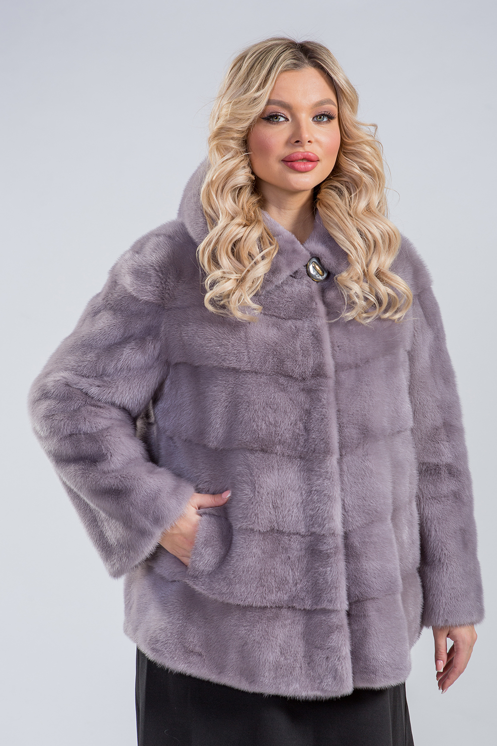 Курточка из меха норки с капюшоном. Крой изделия-поперечная выкладка пластин. Рукава модели сшиты в роспуск и имеют регулирующие утяжки. Длина изделия 80 см. С такой курточкой одинаково хорошо будут смотреться как юбки и платья любой длины, так и брюки от свободных до облегающих! Натуральный мех курточки не боится атмосферных осадков, сохраняет тепло и защищает от ветра!