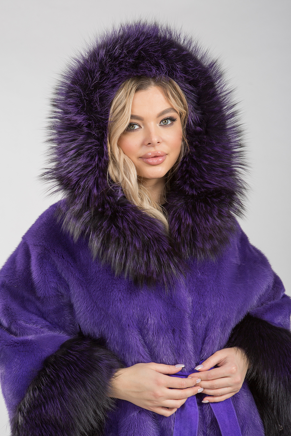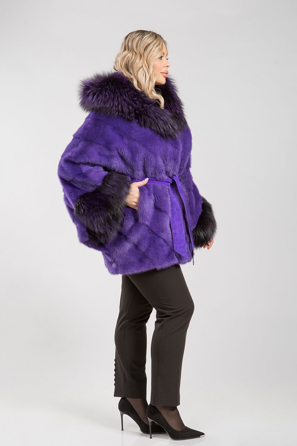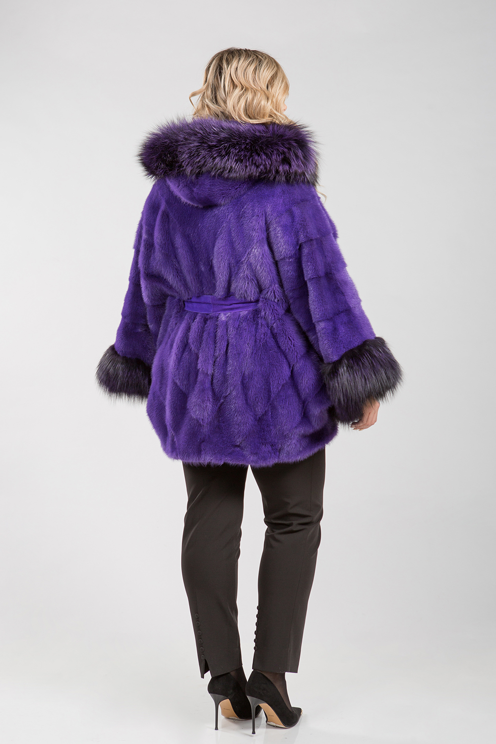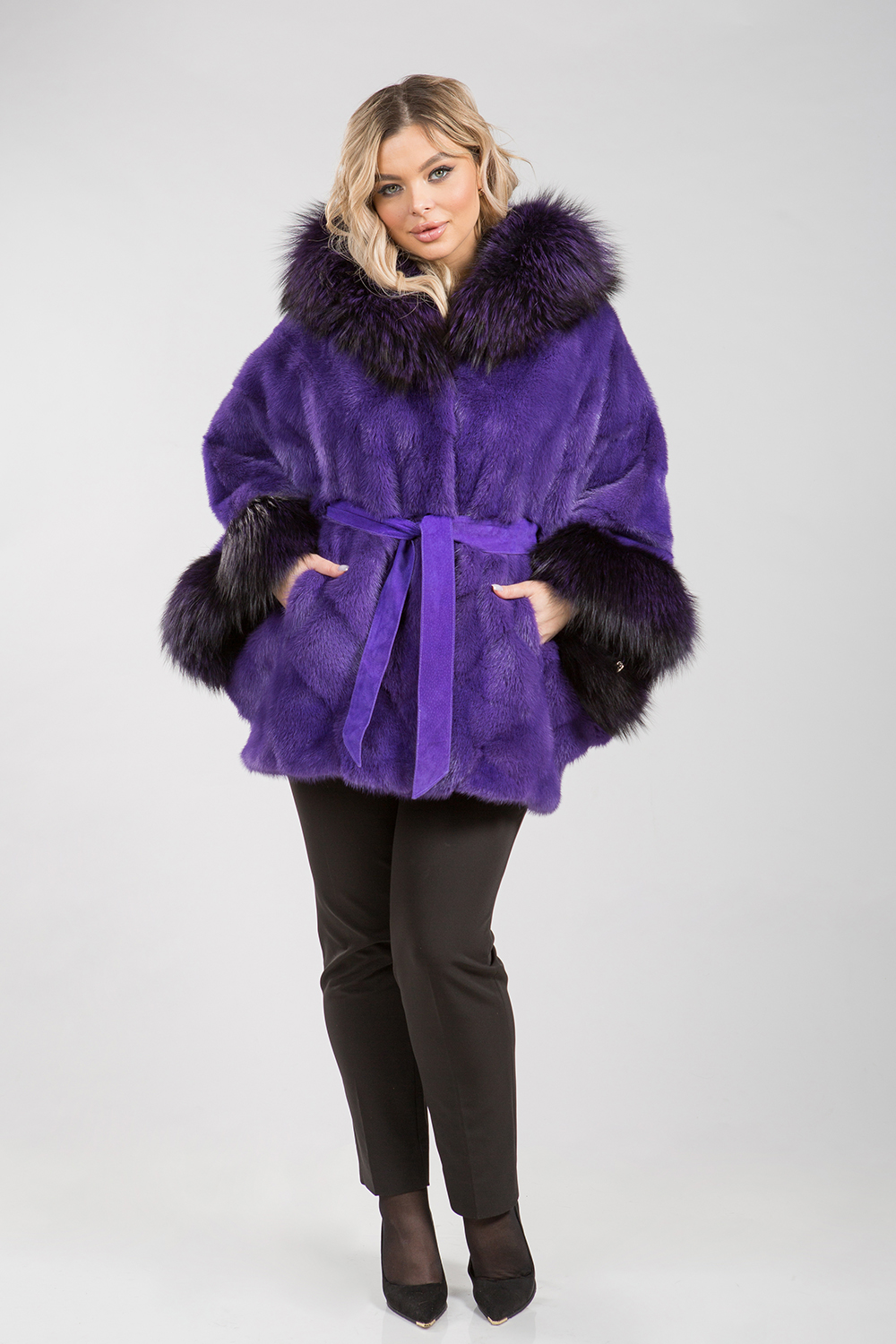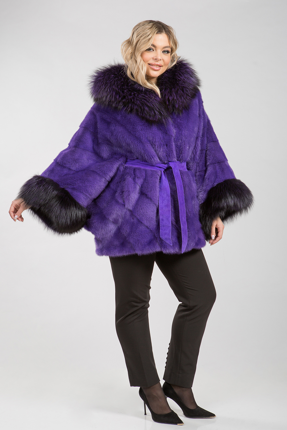 Курточка-пончо из меха норки. Капюшон и рукава модели декорированы мехом тонированной лисы. Крой изделия диагональная выкладка пластин. Низ курточки оснащен регулирующей утяжкой. Длина изделия 80 см. Пояс шубки из натуральной замши, продевается внутри изделия и тем самым придает курточке оригинальность. А благодаря шикарной лисе шубка выглядит очень эффектно, добавляя в образ модели нотки шика и гламура!
