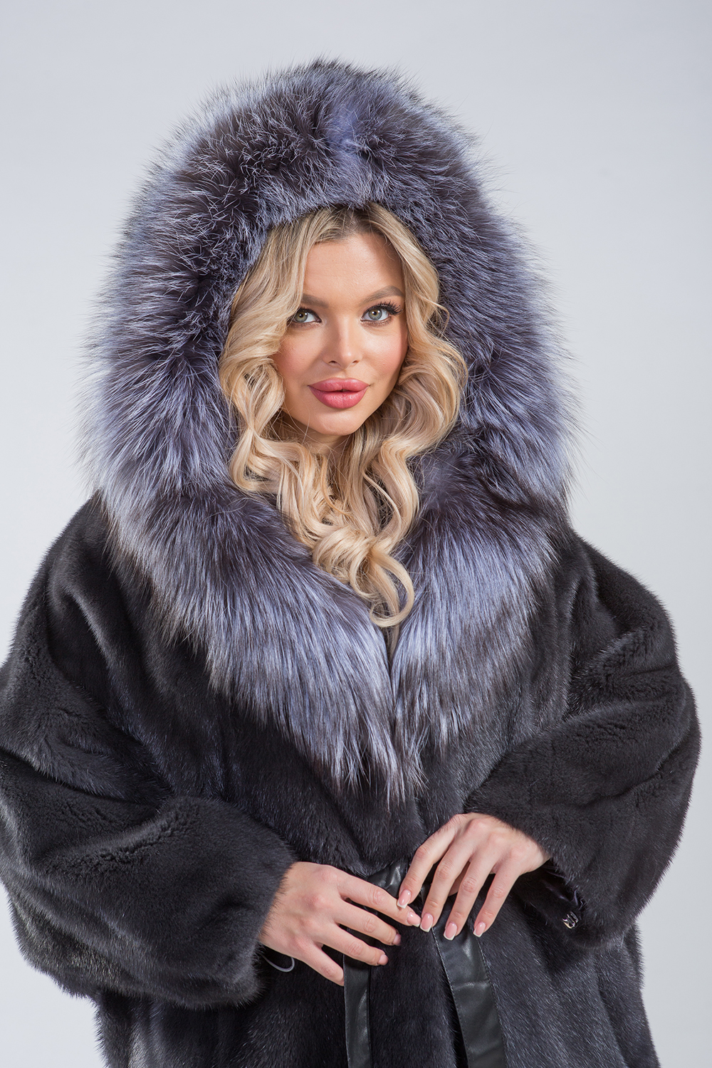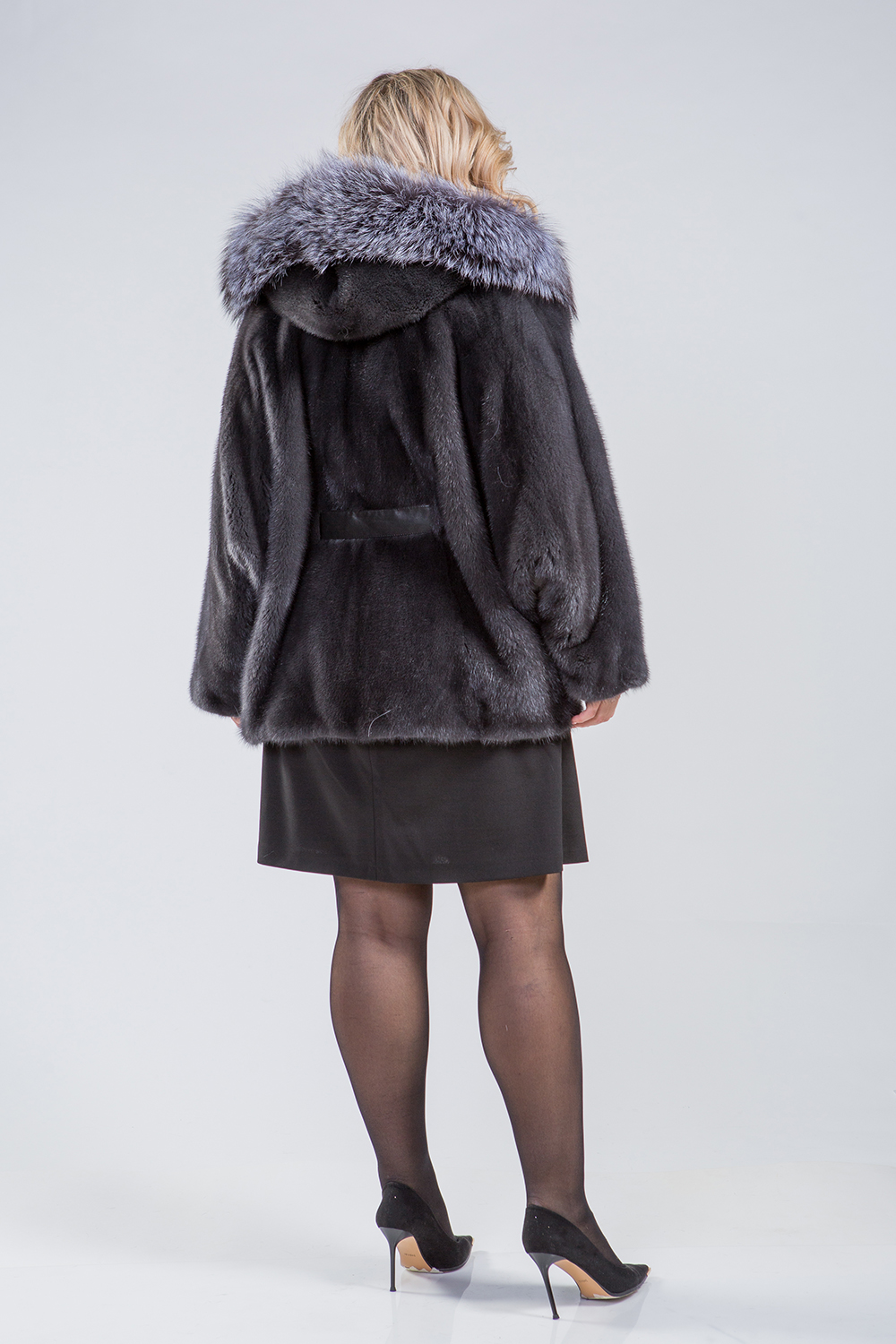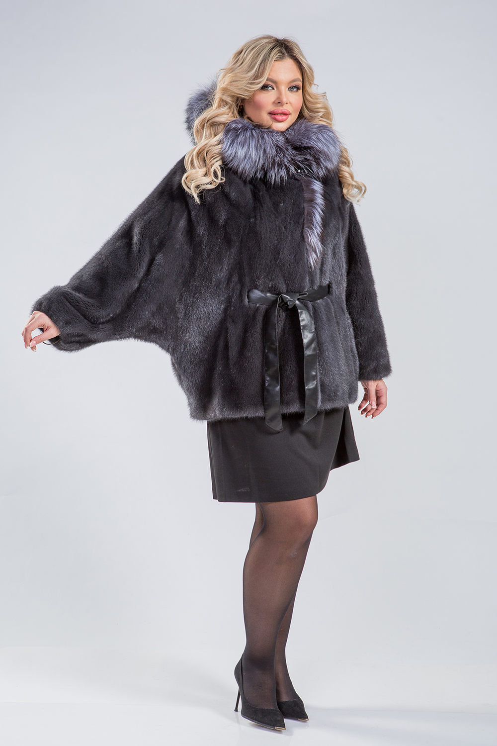 Курточка-пончо из меха норки. Капюшон модели декорирован мехом чернобурой лисы. Крой изделия роспуск. Рукава и низ курточки оснащены регулирующими утяжками. Длина изделия 75 см. Кожаный пояс шубки продевается внутри изделия и тем самым придает курточке оригинальность. А благодаря шикарной лисе шубка выглядит очень эффектно, добавляя в образ модели нотки шика и гламура!