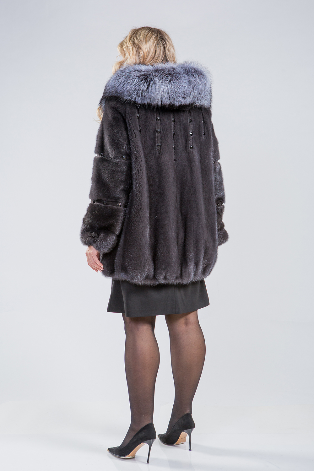 Эта курточка, выполненная из меха норки, привлекает внимание своим роскошным капюшоном, украшенным чернобуркой лисой. Модель имеет расклешённый крой с использованием пластин, что придаёт ей элегантный вид. Рукава и спинка украшены выстрижкой и стразами, а низ курточки и рукава слегка присборены. Длина изделия составляет 80 см.