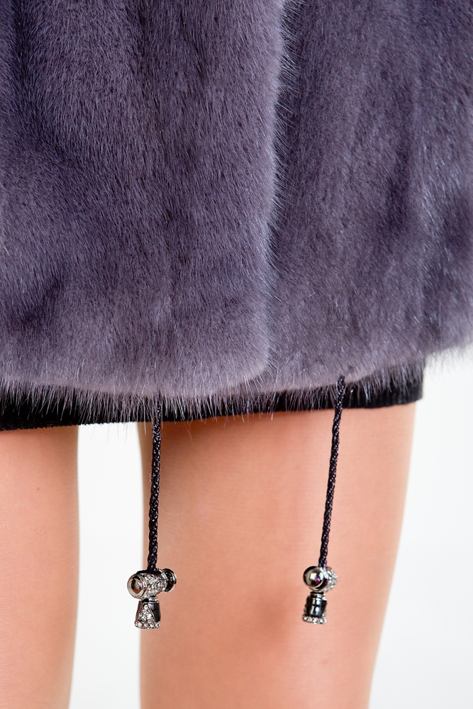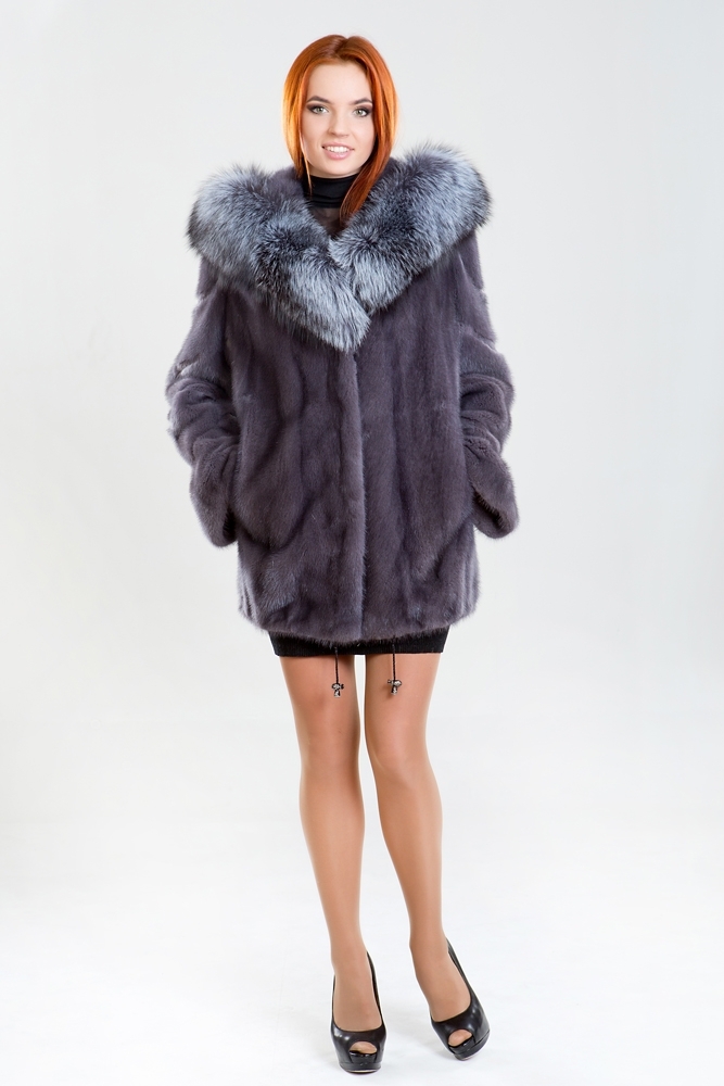 Куртка из норкового меха, украшенная роскошным капюшоном из чернобурой лисы. Модель выполнена в классическом прямом силуэте, а по низу изделия предусмотрена регулирующая утяжка. Рукав представляет собой диагональную выкладку пластин с декоративной выстрижкой меха. Длина изделия составляет 80 см.
