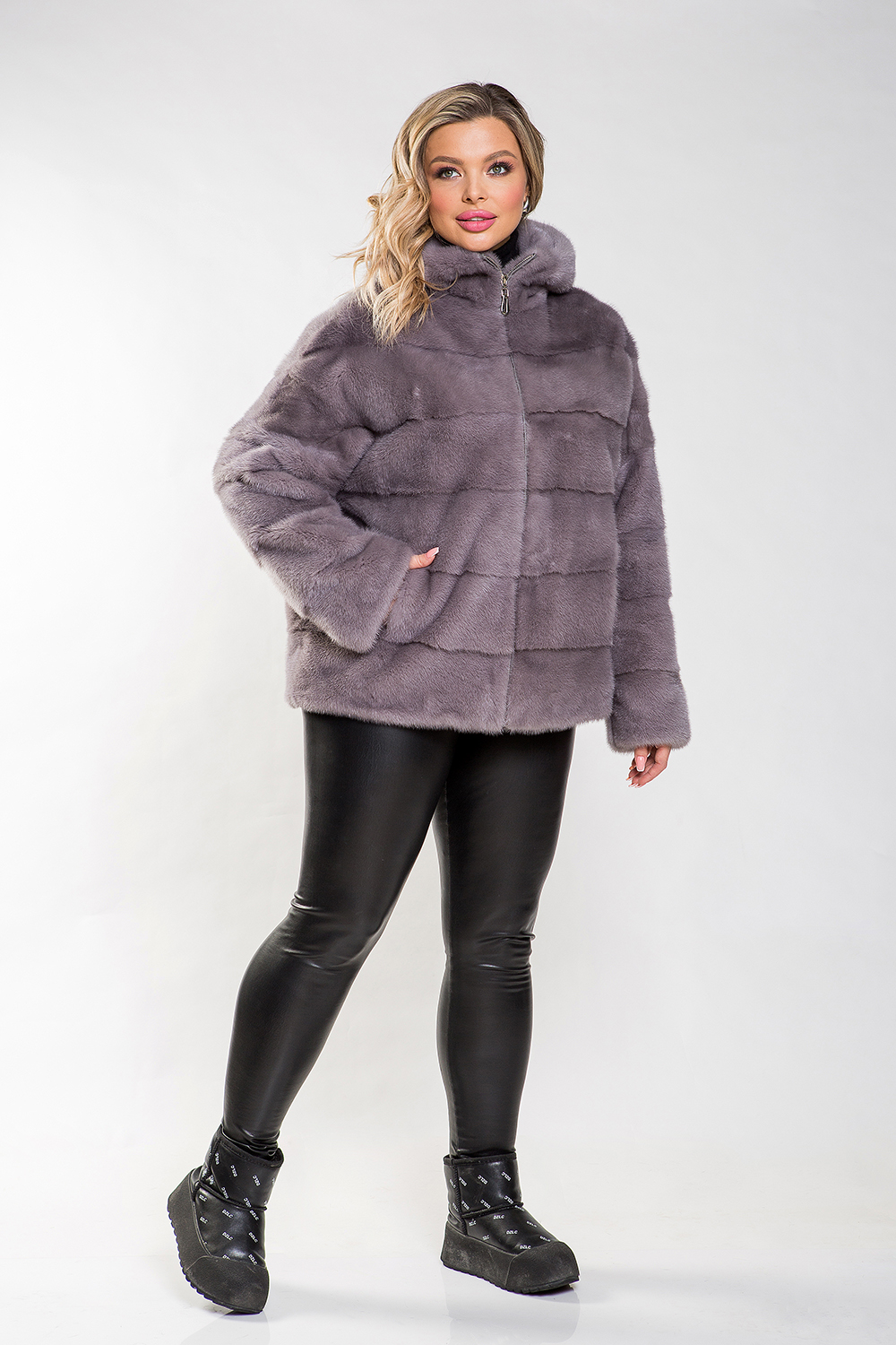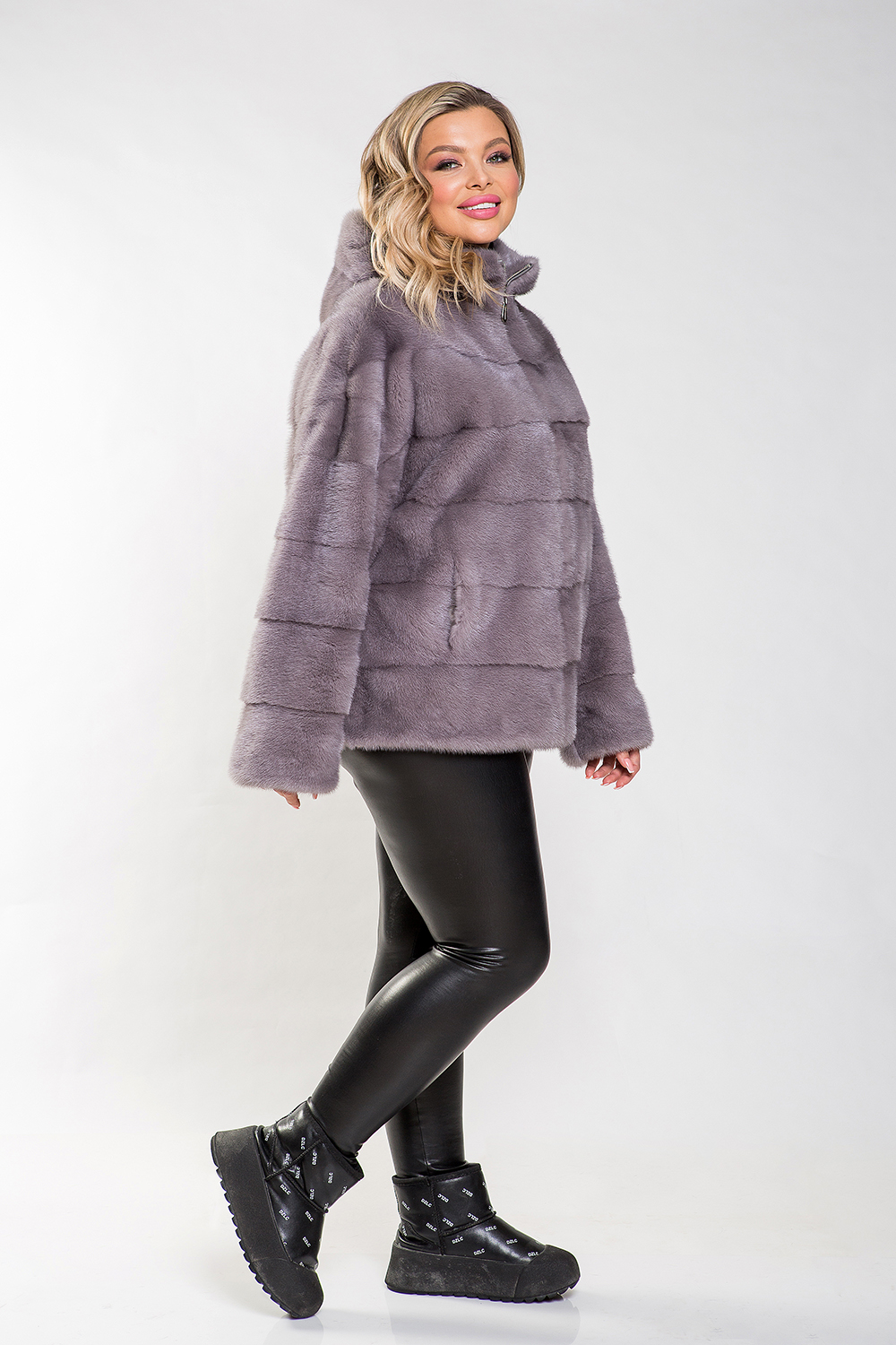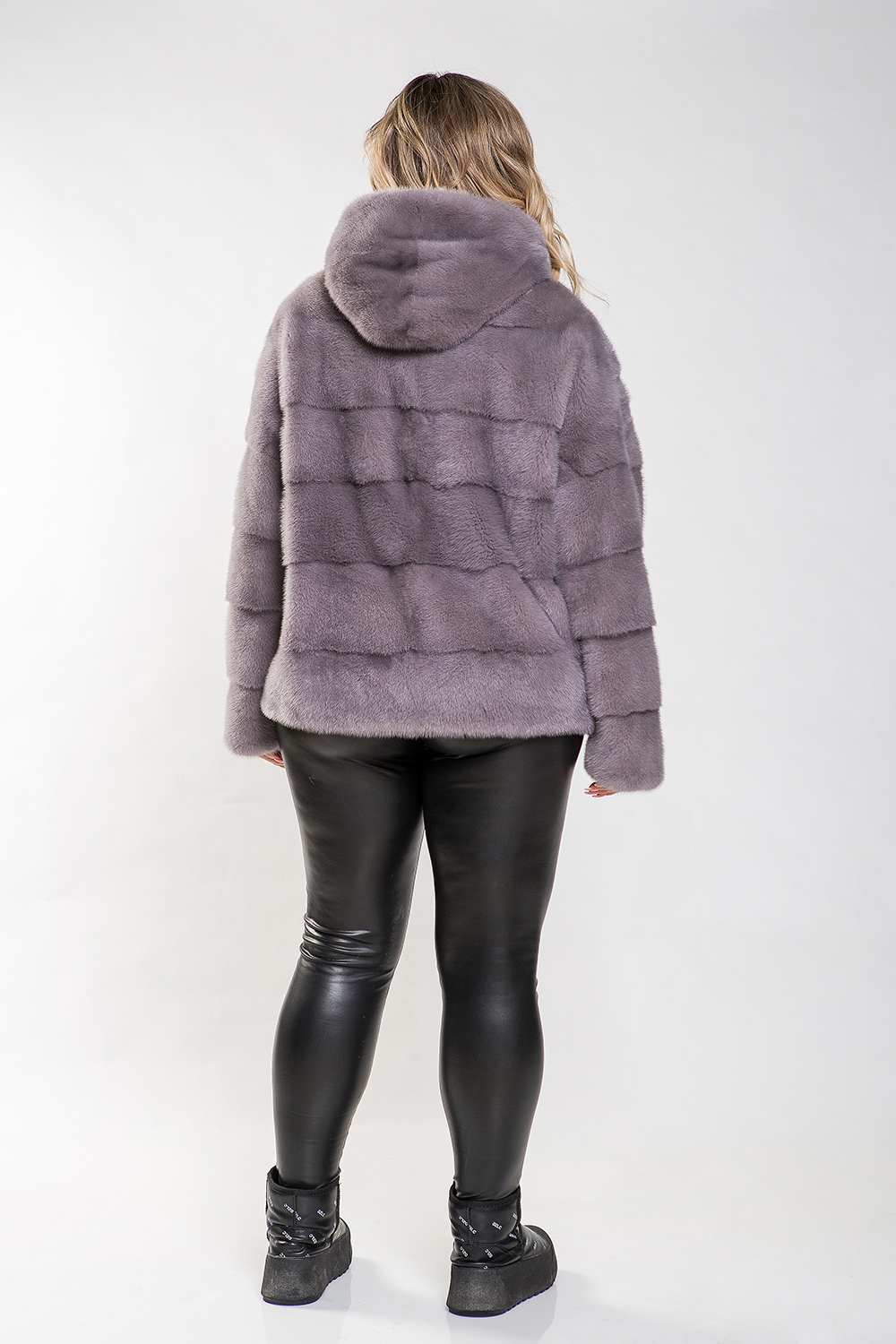 Эта норковая курточка с капюшоном отличается оригинальным кроем — поперечной выкладкой пластин. Для удобства использования, рукава и низ изделия оснащены регулирующими утяжками. Застёгивается курточка на молнию, что придаёт ей современный и стильный вид. Длина изделия составляет 70 см, что позволяет носить его с юбками и платьями любой длины, а также с брюками — как свободными, так и облегающими. Натуральный мех этой курточки не боится атмосферных осадков, отлично сохраняет тепло и защищает от ветра.
