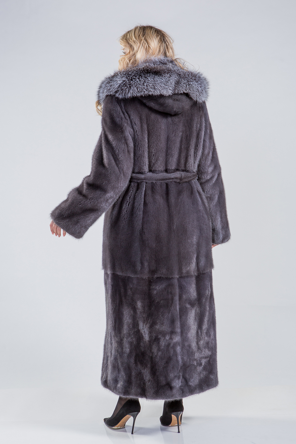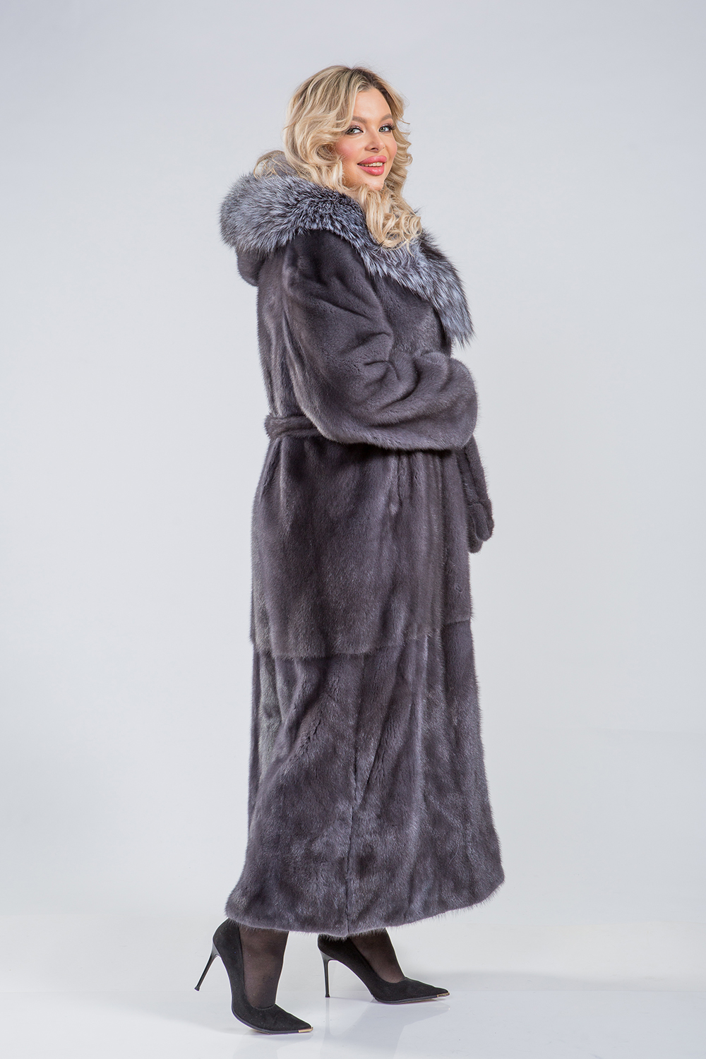 Пальто, сшитое из норки, привлекает внимание своим роскошным дизайном. Капюшон модели украшен мехом лисы, а крой изделия выполнен из пластин с добавлением роспуска. На рукавах пальто предусмотрены регулирующие утяжки, а по бокам расположены элегантные разрезы. В комплект входит пояс из норки, который подчеркивает изящество модели.