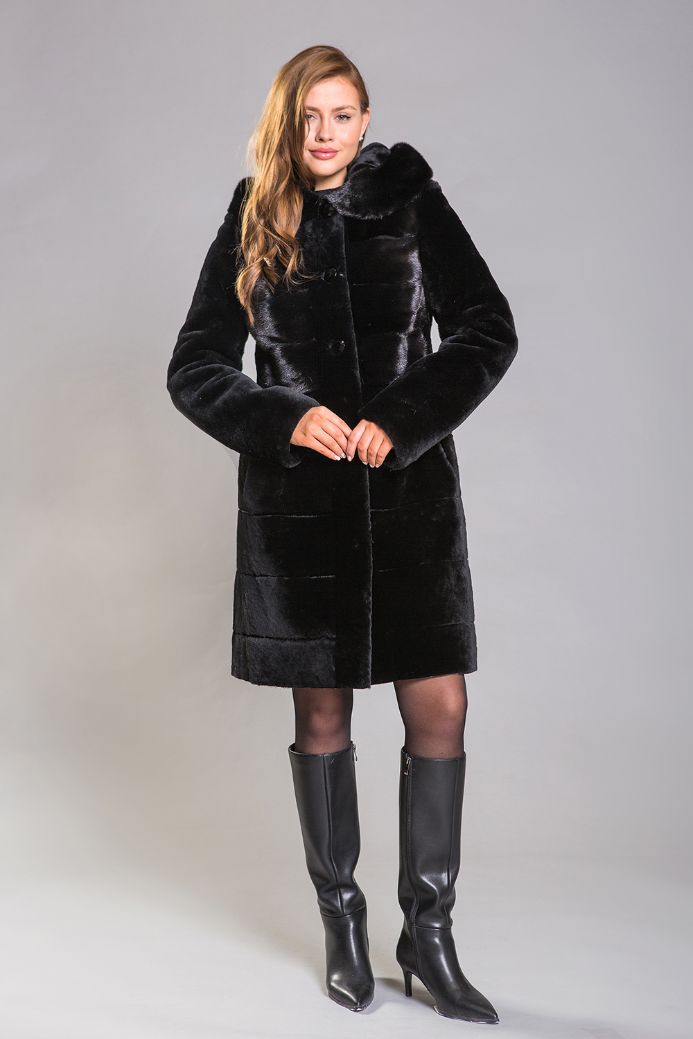 Полупальто из овчины с капюшоном, украшенным норковым мехом, — это стильное и элегантное решение для холодной погоды. Пластинчатый крой придаёт модели современный и утончённый вид.