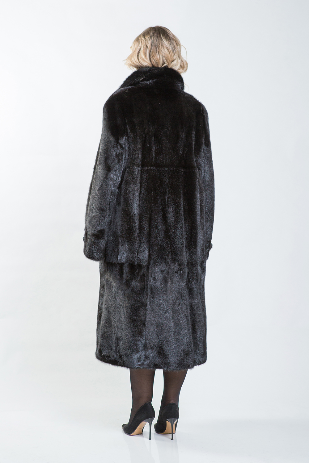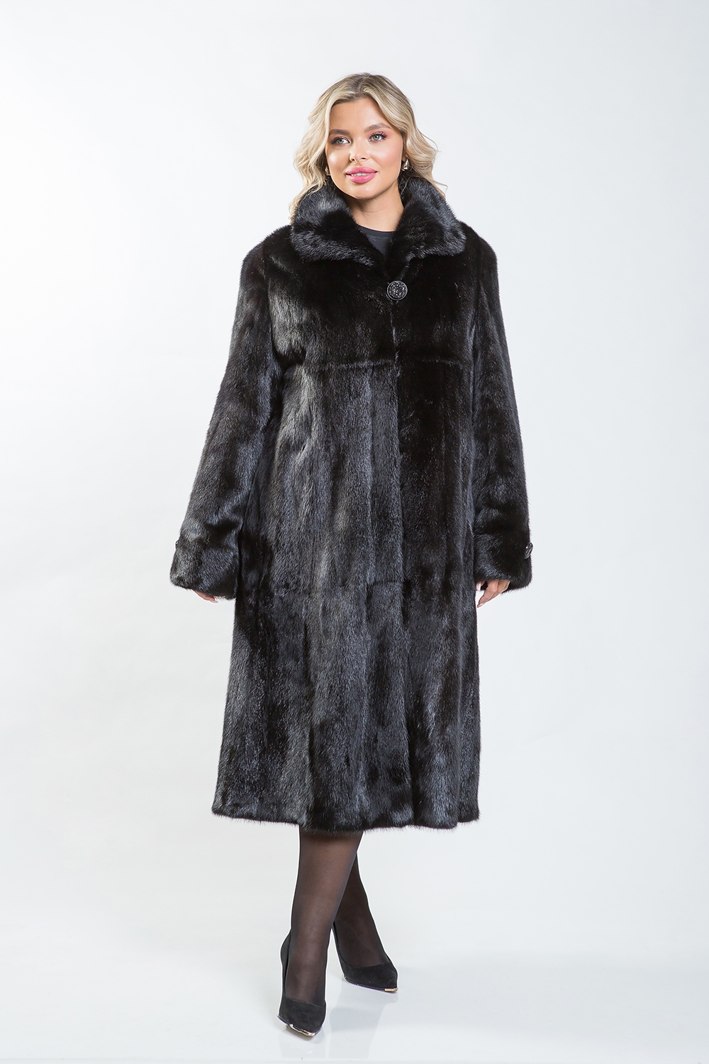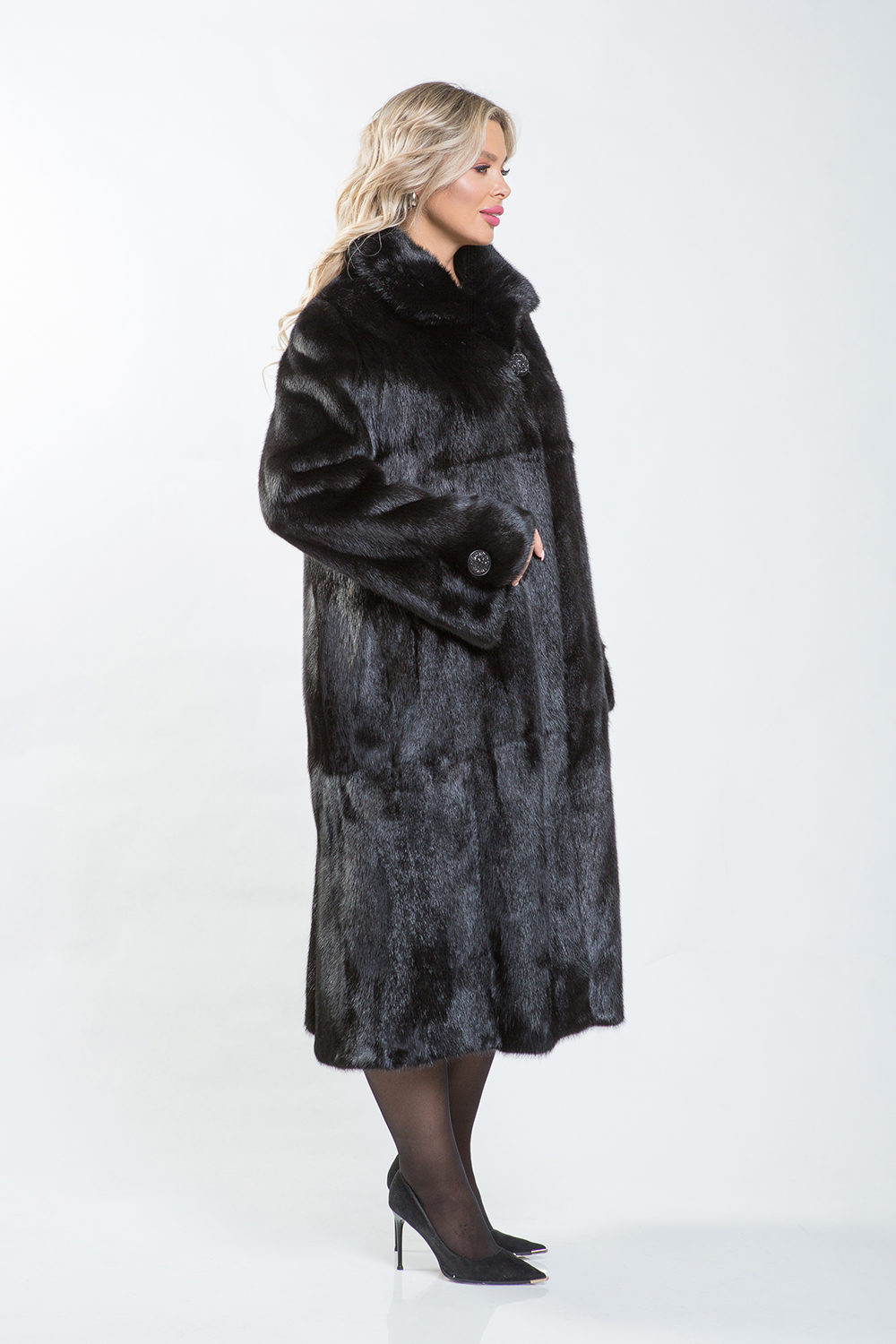 Полупальто из норкового меха с классическим воротником, созданное из пластин с добавлением роспуска, является универсальным выбором. Длина изделия составляет 120 см. По мнению профессиональных стилистов, шубка классического силуэта — это беспроигрышное решение. Модель идеально садится на любую фигуру, обеспечивая элегантность и безупречный вид.