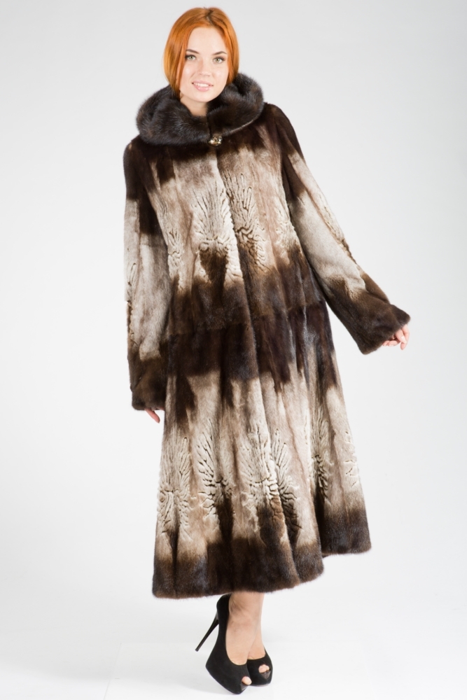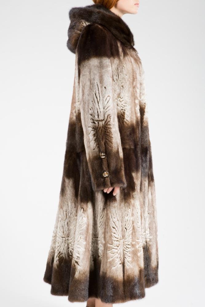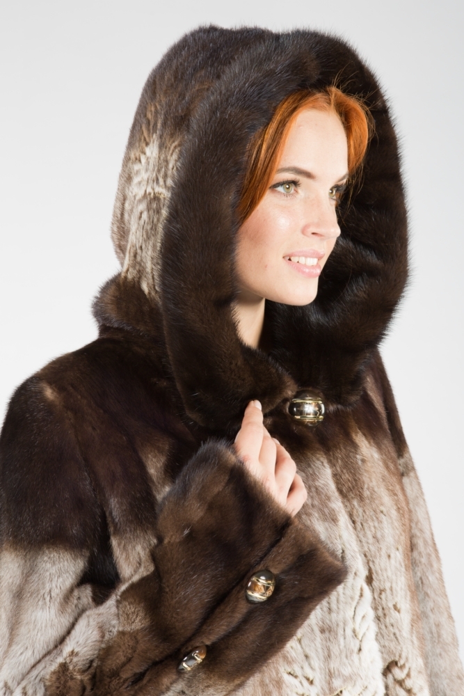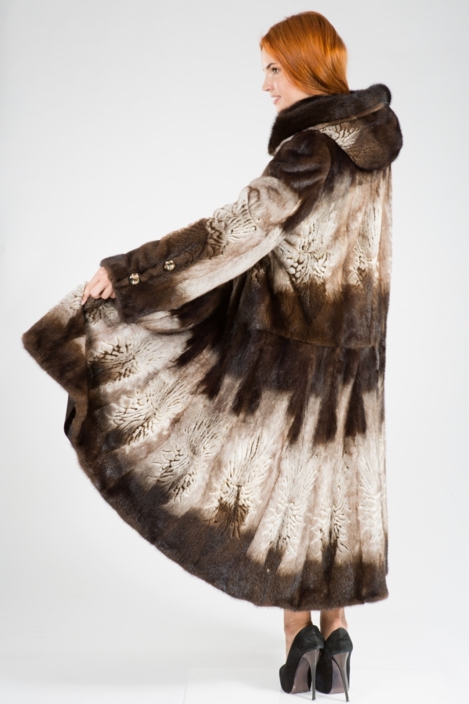 Полупальто из меха стриженной норки с капюшоном. Крой роспуск. Модель декорирована лазерной выстрижкой. Юбка изделия к низу имеет большой клеш, поэтому модель смотрится шикарно! Длина модели 120 см. Такое меховое пальто подкупает своей оригинальностью и очарованием!