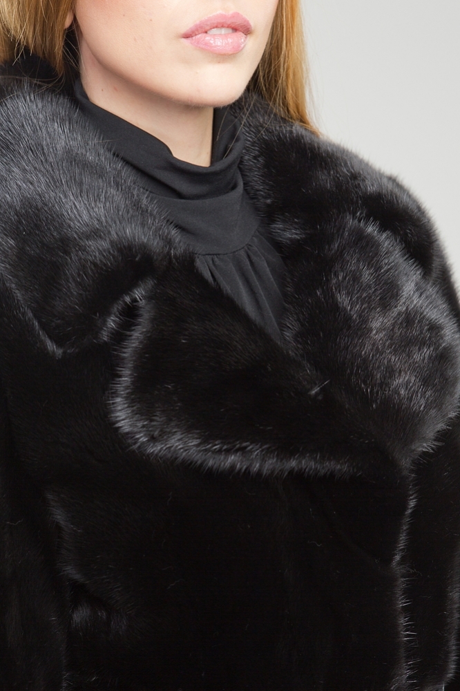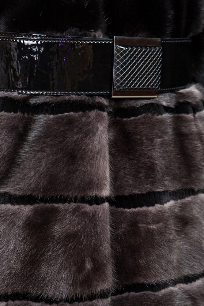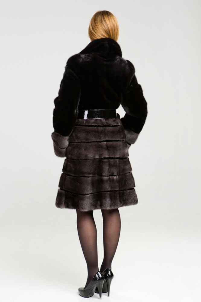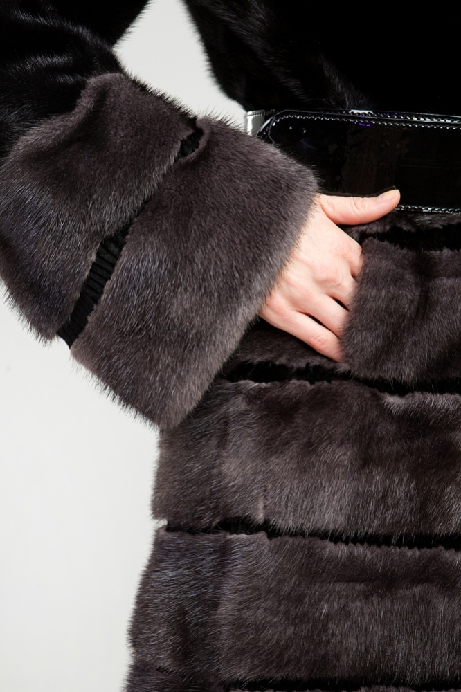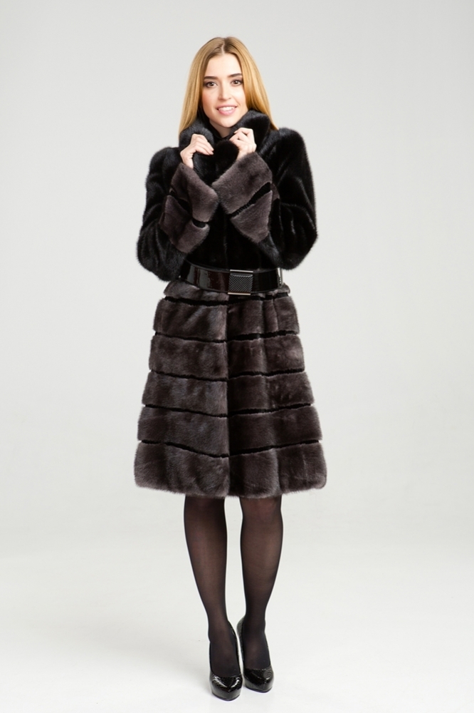 Полупальто из меха норки. Воротник модели английский, но при желании может трансформироваться в классический. Крой изделия комбинированный, верх модели роспуск, а низ юбочки поперечная выкладка пластин. Длина модели 100 см. Благодаря приталенному силуэту шубка выглядит элегантно и обаятельно!