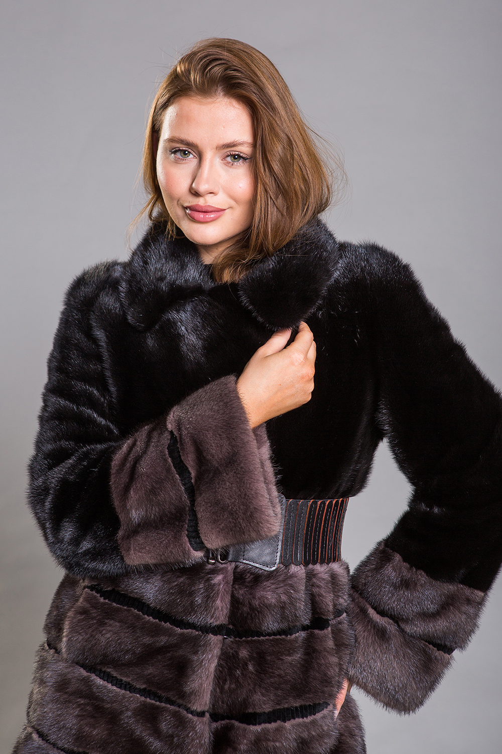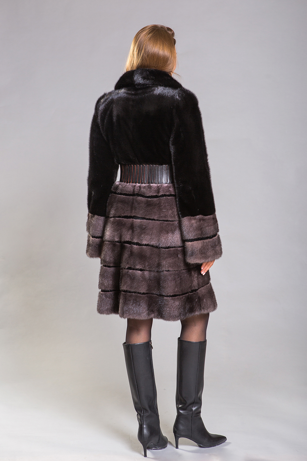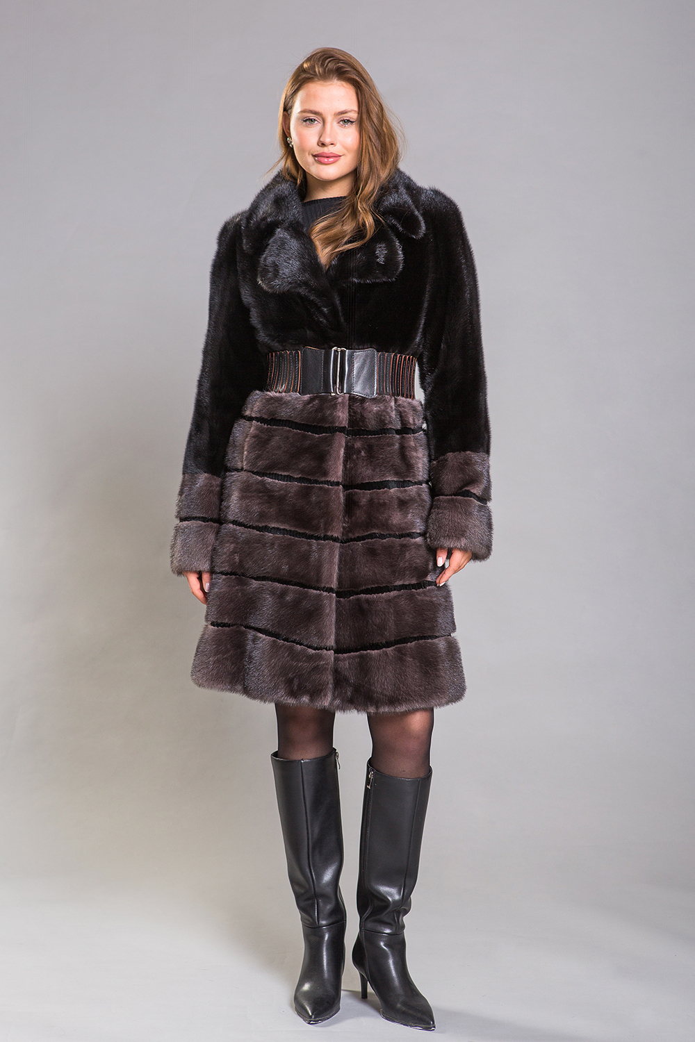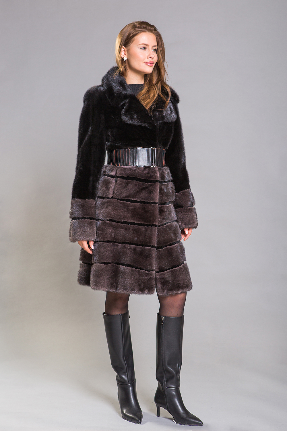 Полупальто из норки с английским воротником, который при желании можно трансформировать в классический. Крой модели комбинированный: верх выполнен в технике роспуска, а низ юбочки — из поперечно выложенных пластин. Длина изделия составляет 100 см. Благодаря приталенному силуэту шубка выглядит элегантно и обаятельно! В подарок — кожаный пояс!