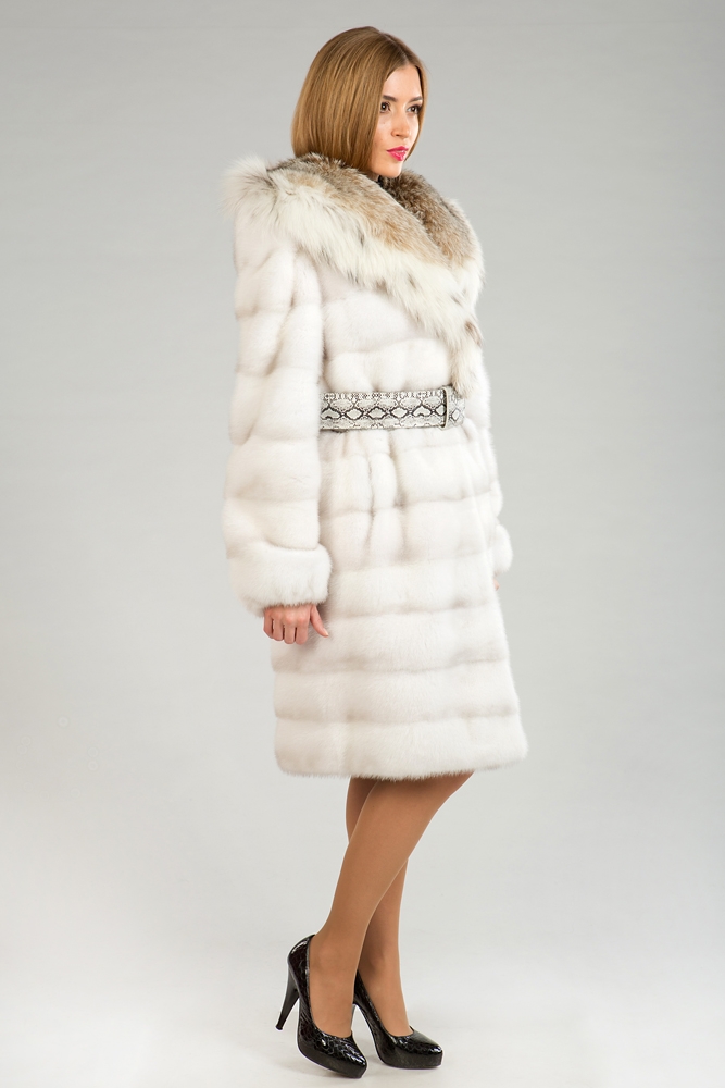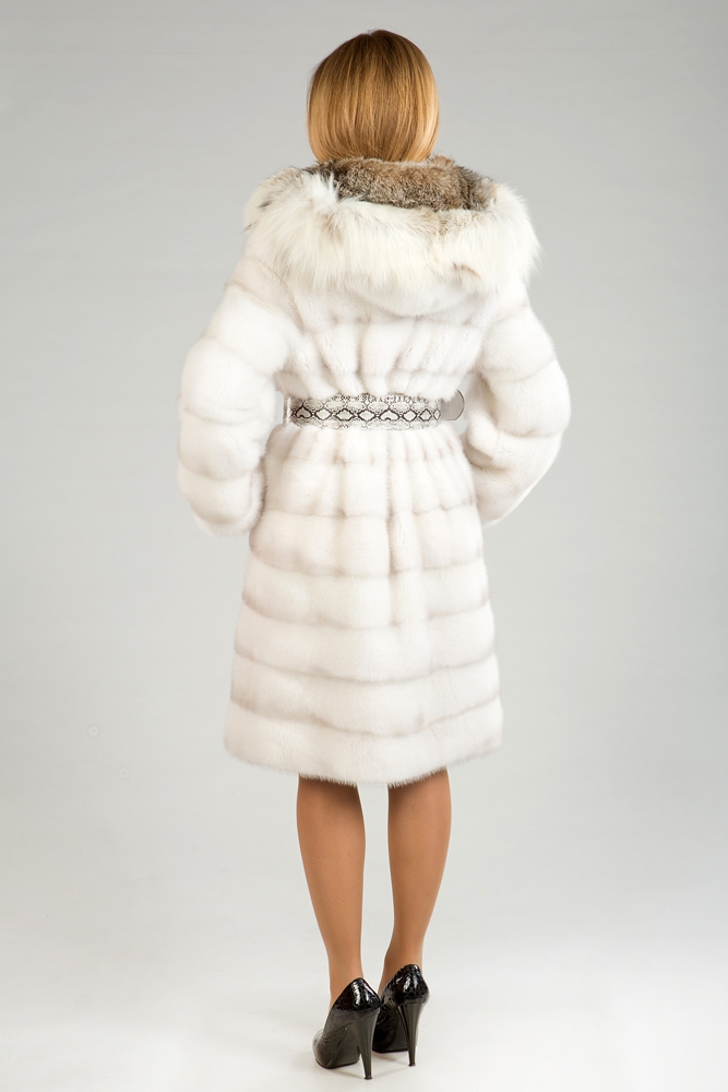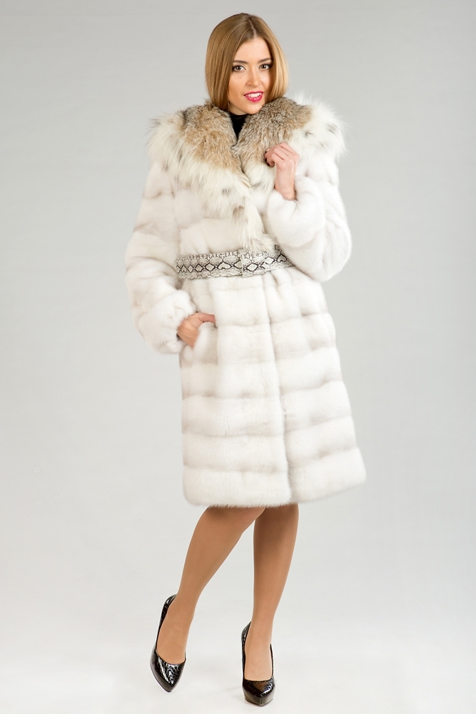 Полупальто из меха норки. Капюшон дополнен мехом рыси. Крой поперечная выкладка пластин. Внутри на талии и на рукавах шубка оснащена регулирующими утяжками. Длина изделия 100 см.