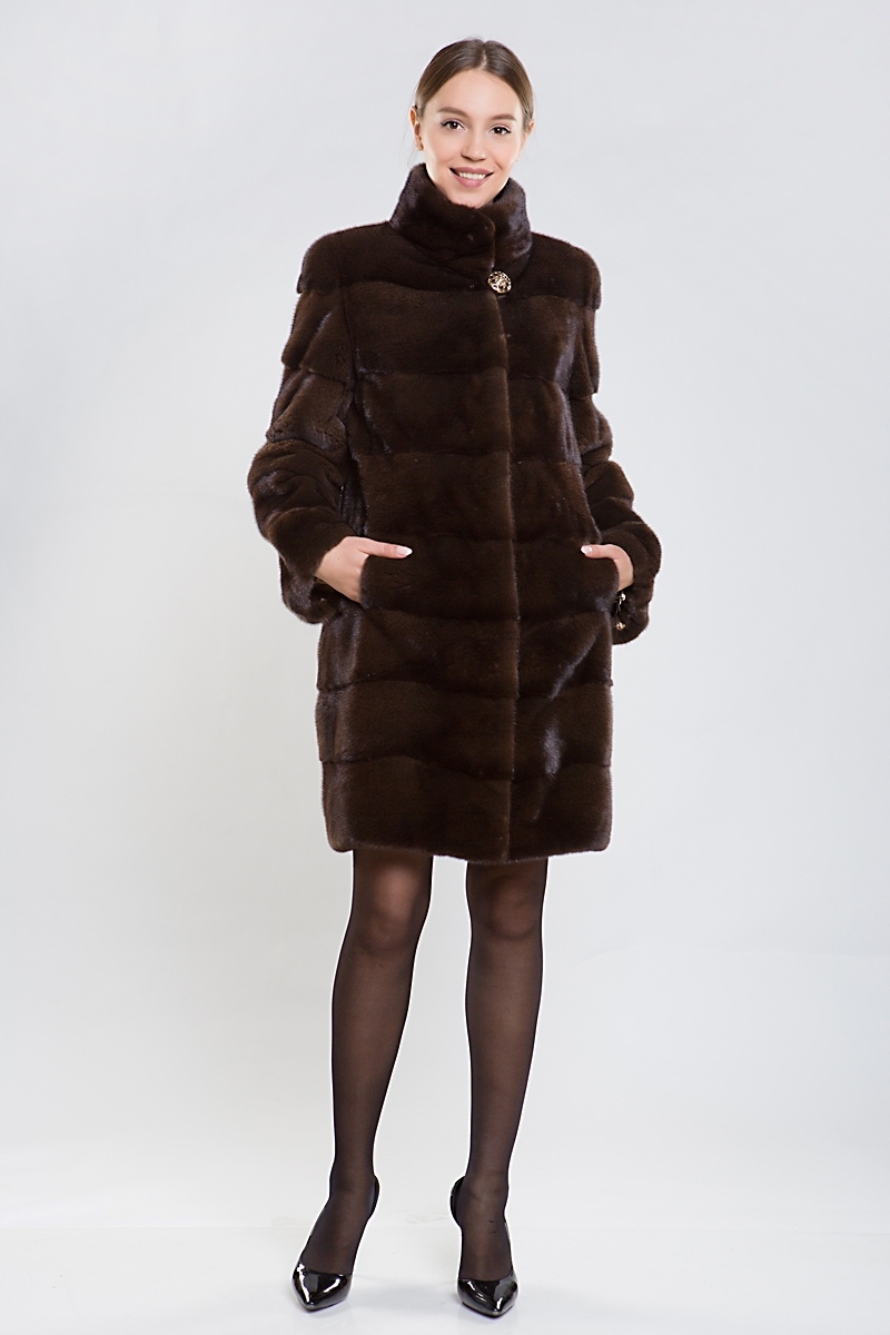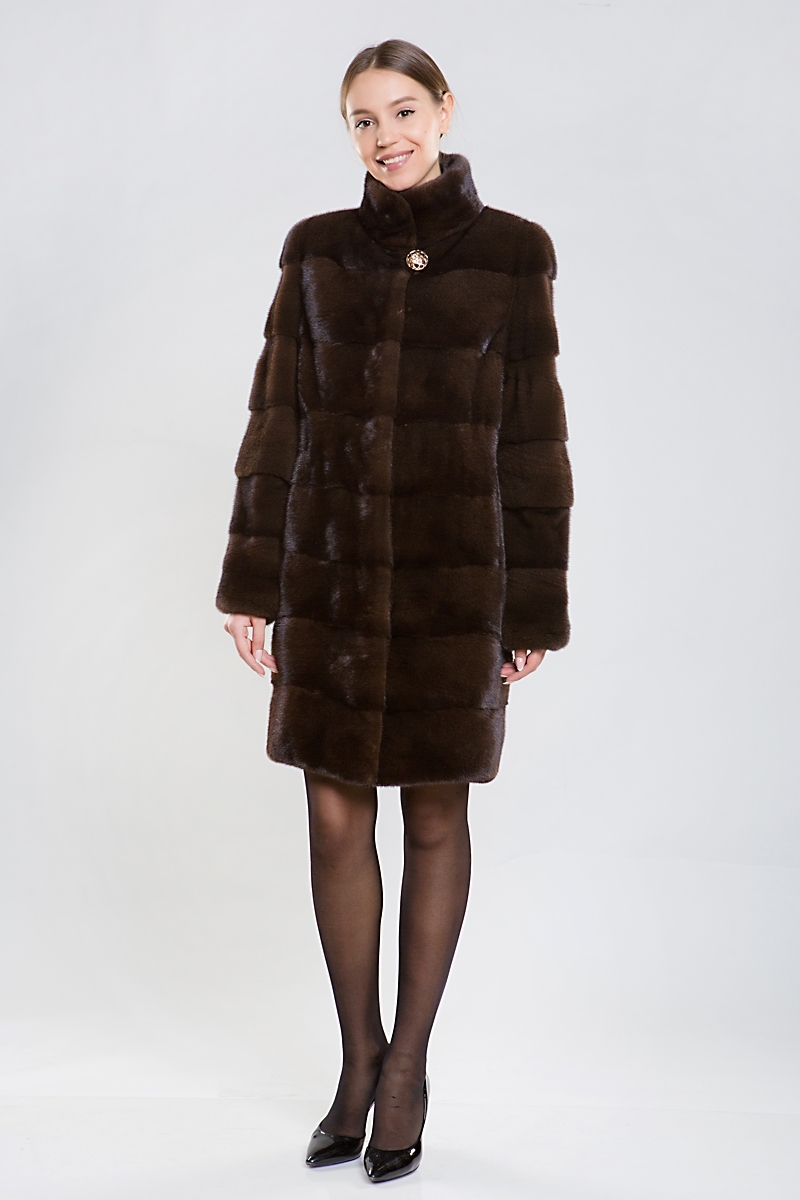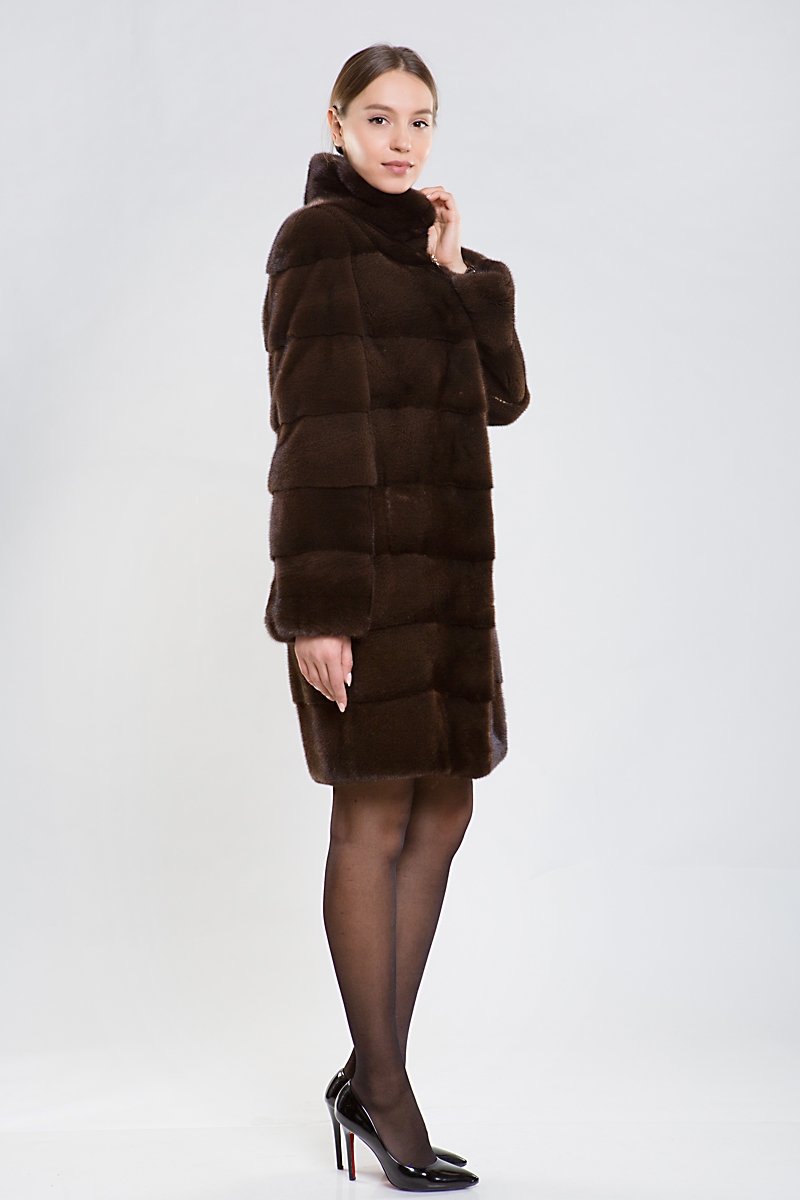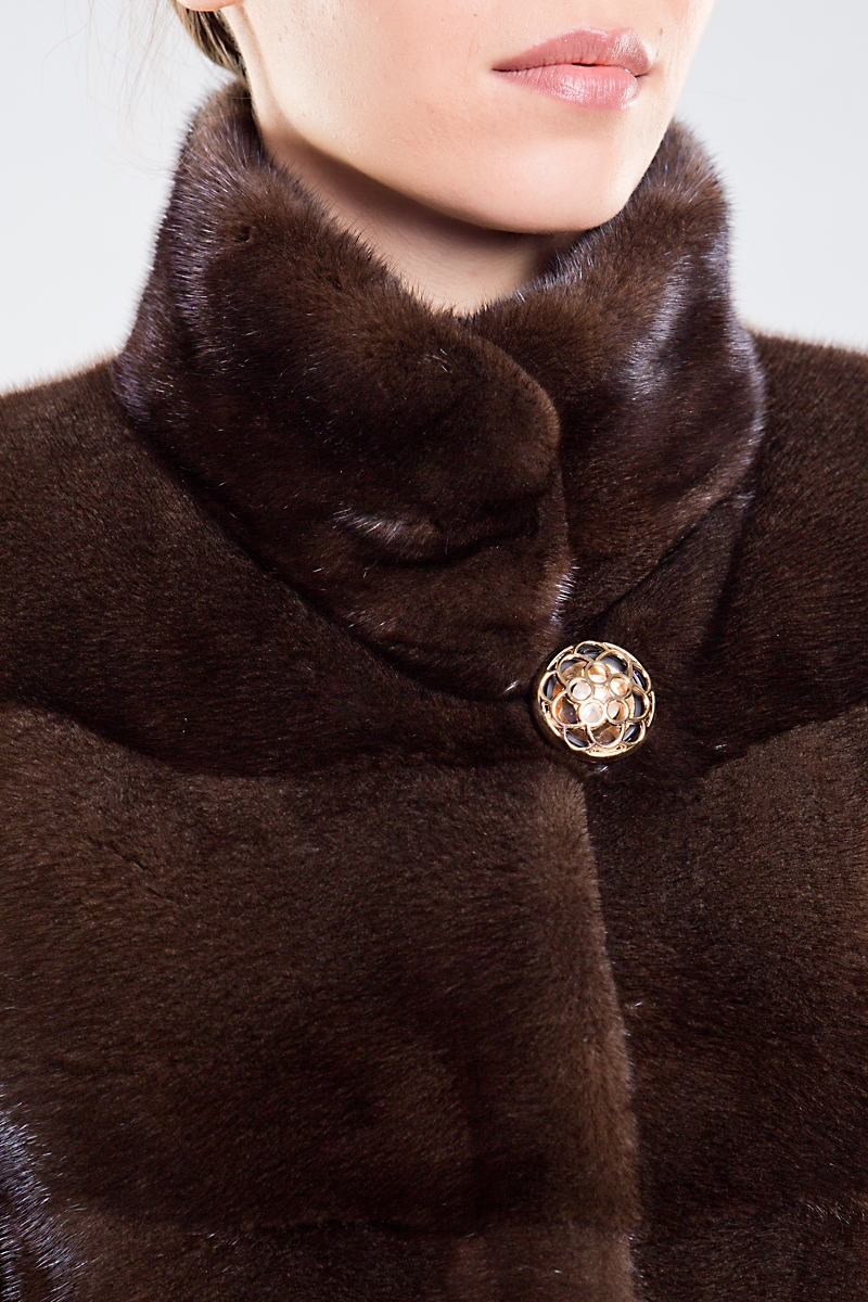 Полупальто из норки, украшенное стильным воротником-стойкой. Крой выполнен из поперечно выложенных пластин. Длина модели — 95 см.