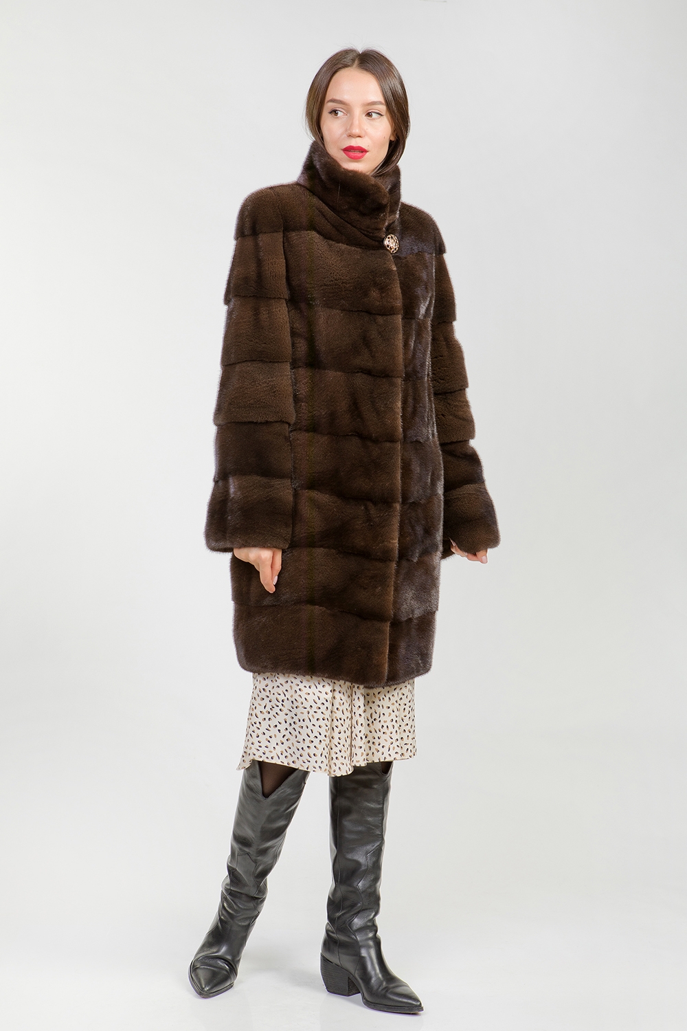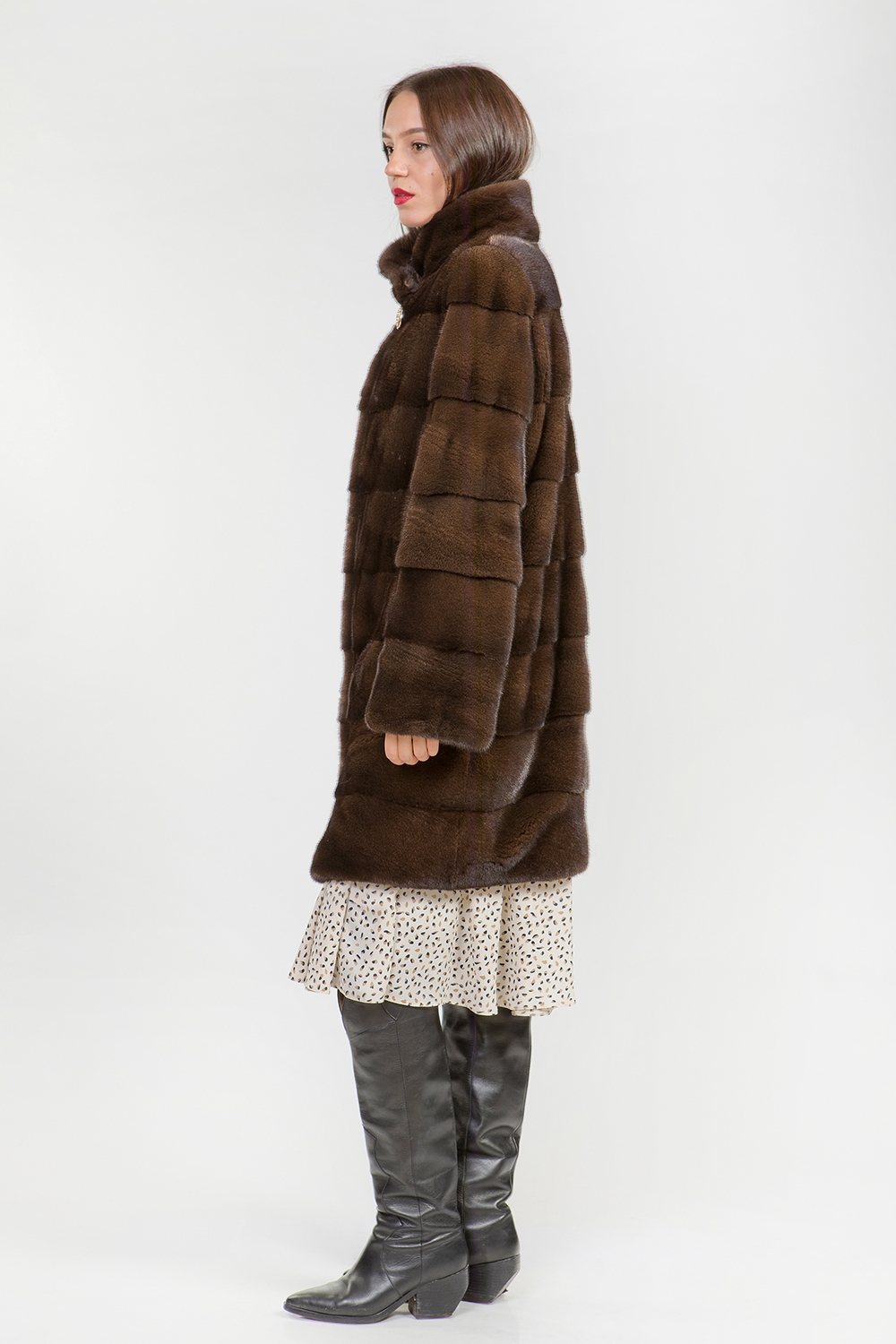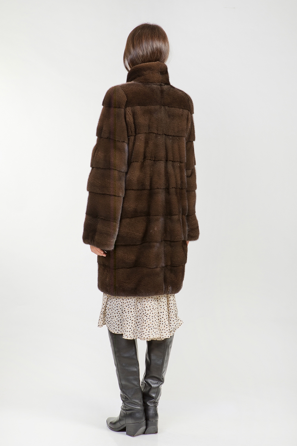 Полупальто, выполненное из натурального норкового меха, отличается стильным воротником-стойкой и кроем, созданным с использованием поперечной выкладки пластин. Длина модели составляет 95 см, что делает её элегантной и неповторимой. Лаконичный прямой силуэт в сочетании с высококачественным мехом делают эту шубку поистине изысканной.
