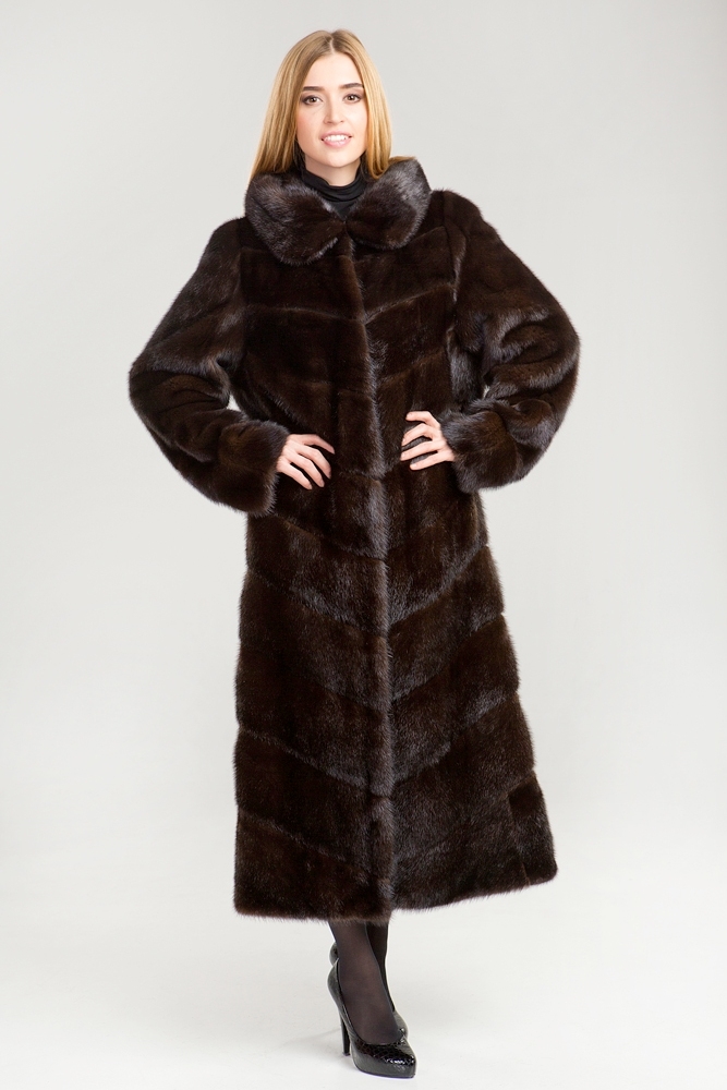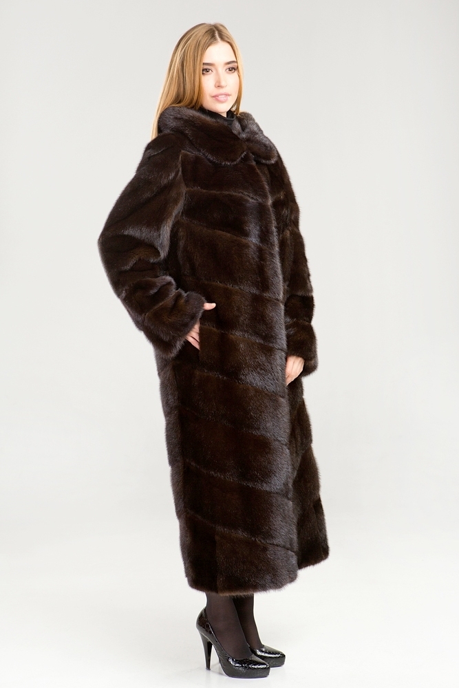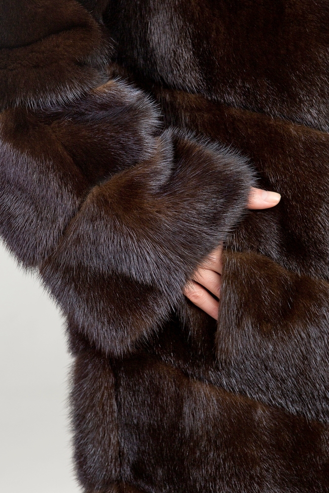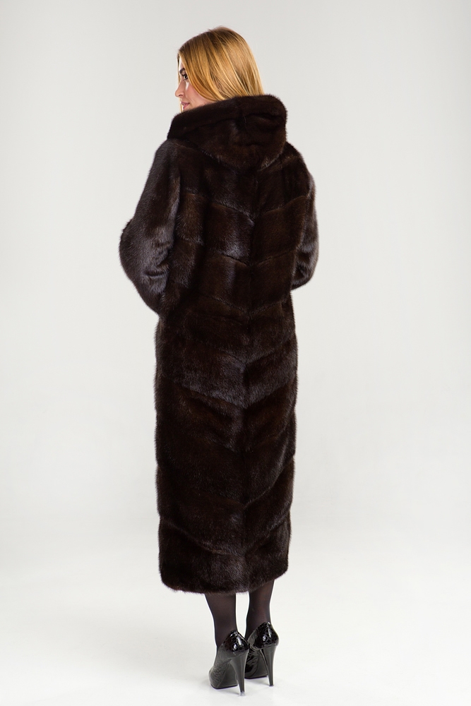 Полупальто из меха норки с капюшоном. Крой изделия - диагональная выкладка пластин. Длина модели 120 см. Лаконичный прямой силуэт этой шубки подойдет девушкам любой комплекции и позволит чувствовать себя комфортно!