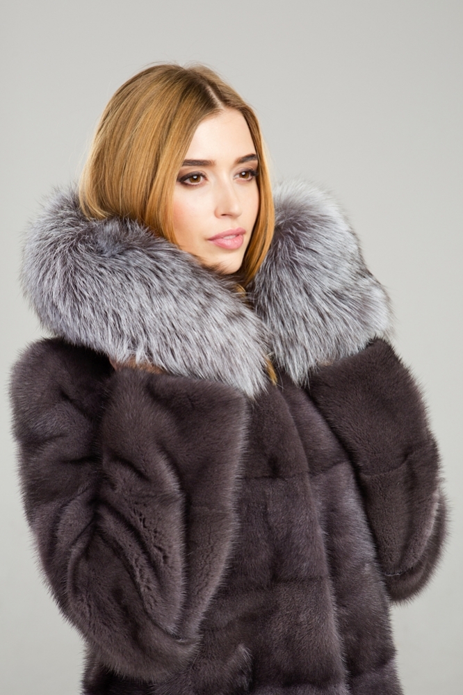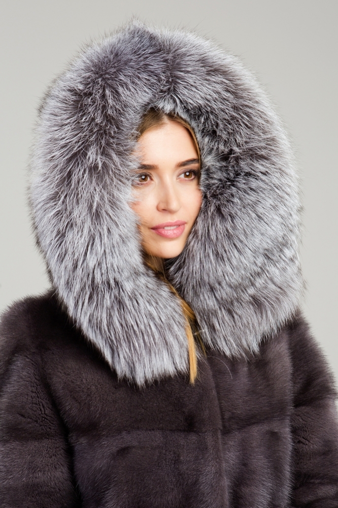 Полупальто из меха норки с капюшоном. Крой изделия - диагональная выкладка пластин. Модель оснащена регулирующими утяжками на рукавах, по низу изделия и в зоне талии. Длина шубки 100 см.