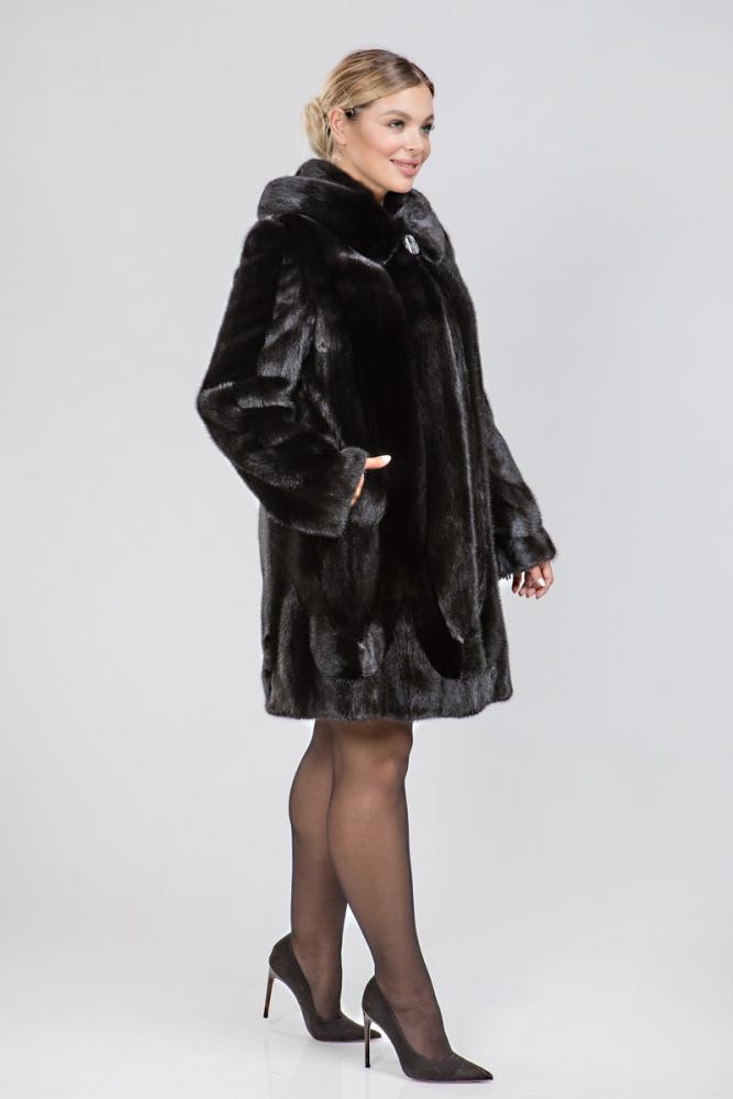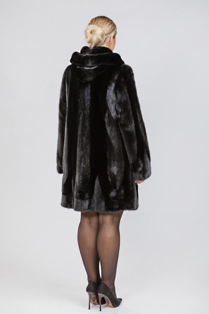 Полупальто из меха норки с капюшоном. Крой изделия роспуск, в разном направлении ворса. Внутри и на рукавах шубки имеются регулирующие утяжки. Длина изделия 90 см. Модель трапециевидная, слегка расклешена. Глубокий и насыщенный оттенок черного меха придает шубке оригинальность и выразительность!