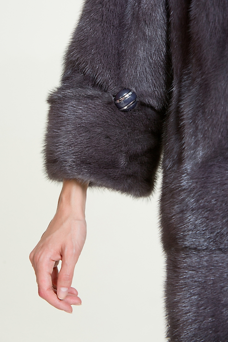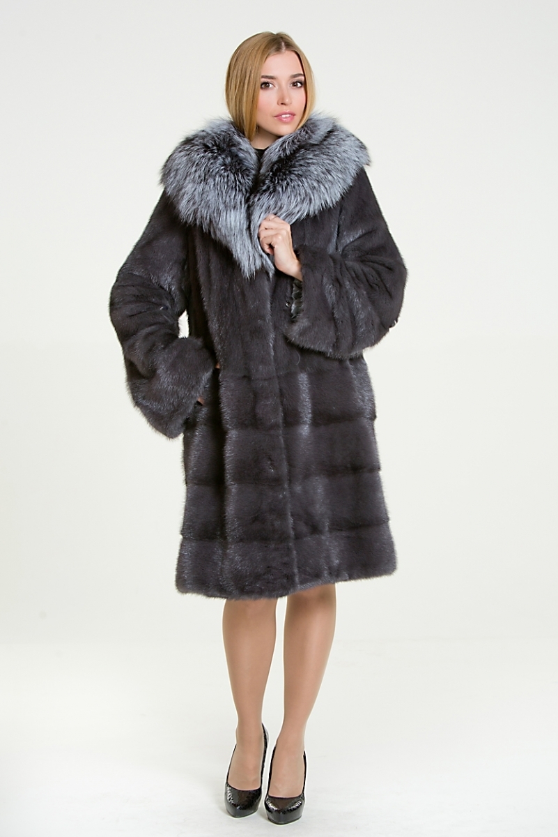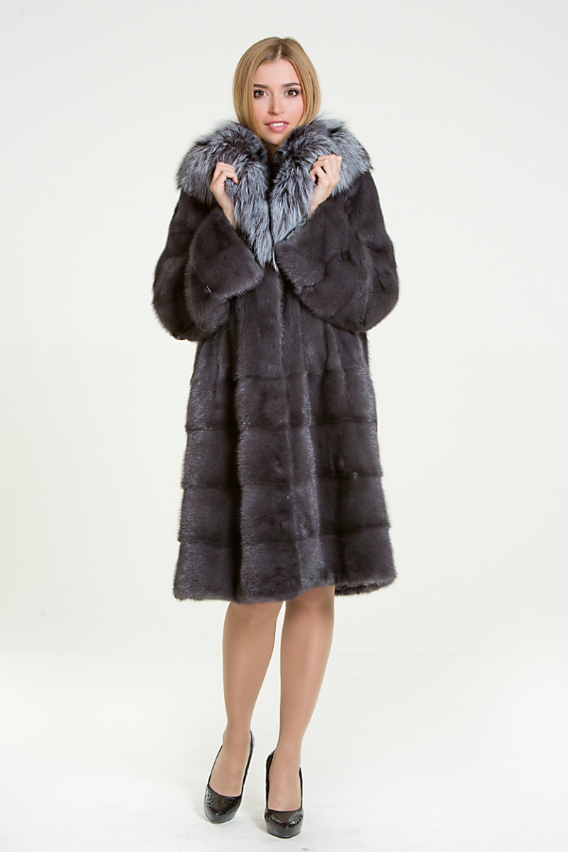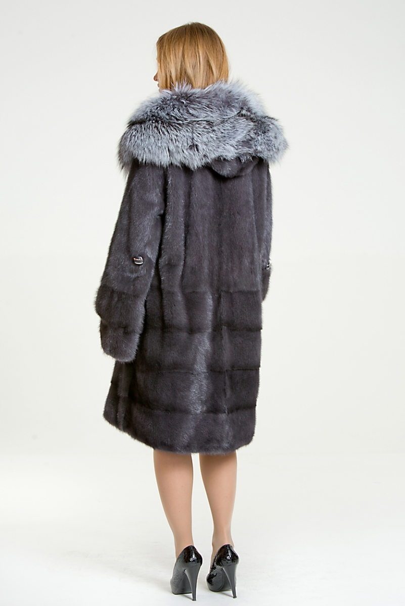 Полупальто из меха норки. Капюшон изделия дополнен мехом чернобурой лисы. По низу модели поперечная выкладка пластин. Рукав изделия трансформируется в более укороченный.