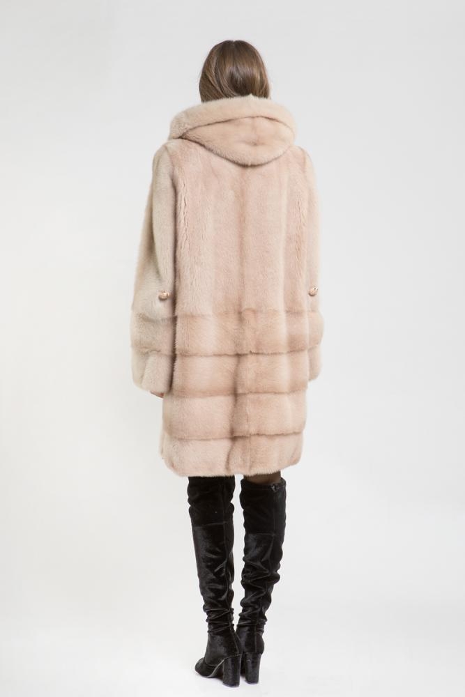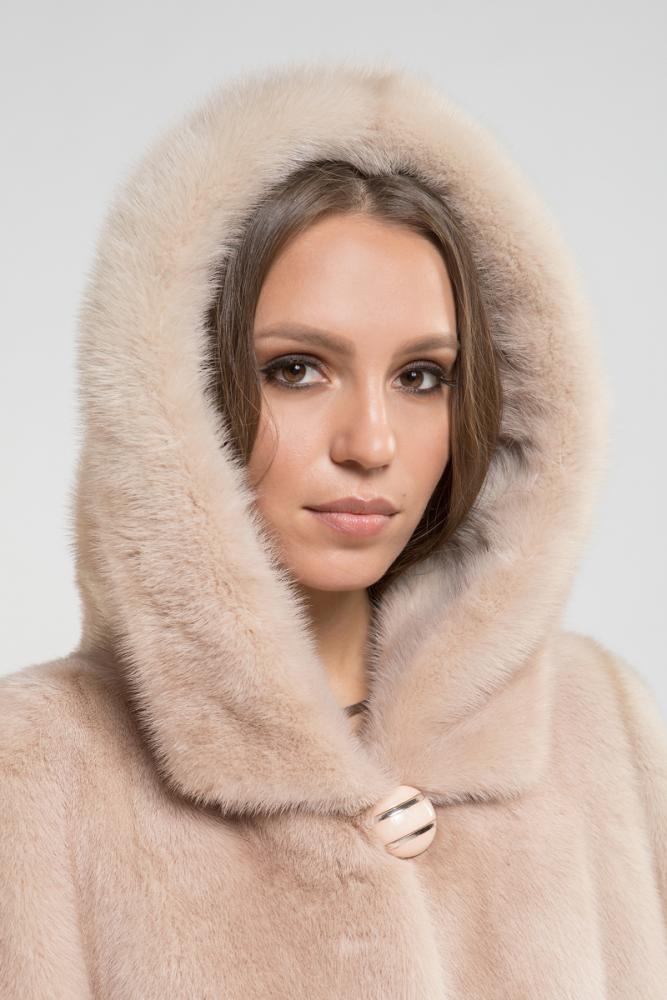 Полупальто из норки с капюшоном, выполненное в комбинированном крое. Нижняя часть модели оформлена поперечной выкладкой пластин. Рукава изделия можно трансформировать в более короткие, что позволит сочетать их с длинными перчатками или митенками. Длина полупальто составляет 100 см. Качественный и нежный оттенок шубки — миндаль, который обязательно привлечет внимание и вызовет комплименты!