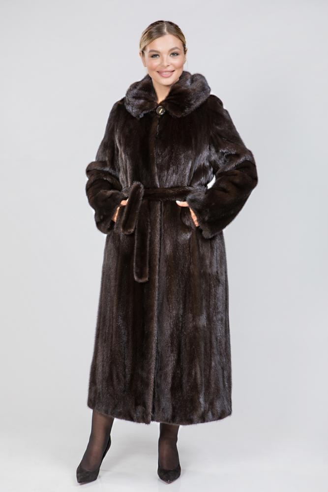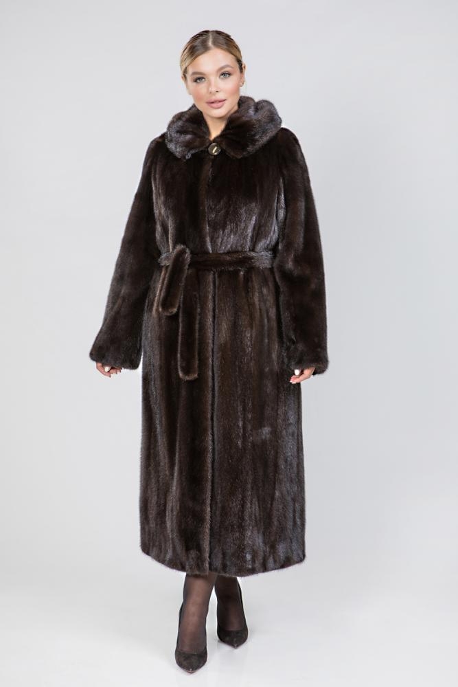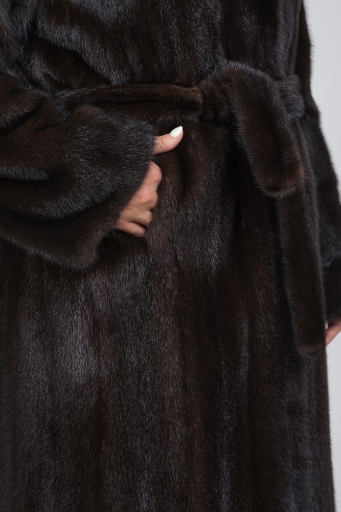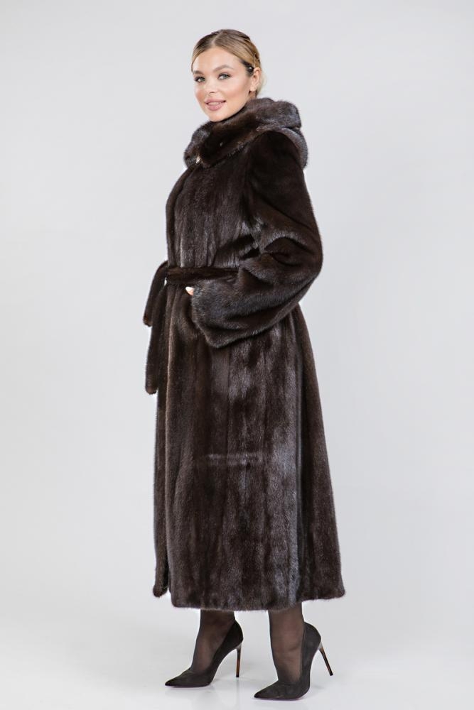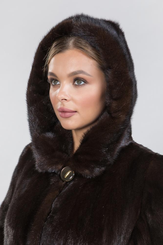 Полупальто из меха норки с капюшоном. Крой изделия роспуск. На талии и на рукавах модели имеются регулирующие утяжки. Длина изделия 115 см. Такая длинная модель прекрасно сочетается с юбками и платьями. Глубокий и насыщенный оттенок шоколадного цвета придает шубке оригинальность и выразительность!